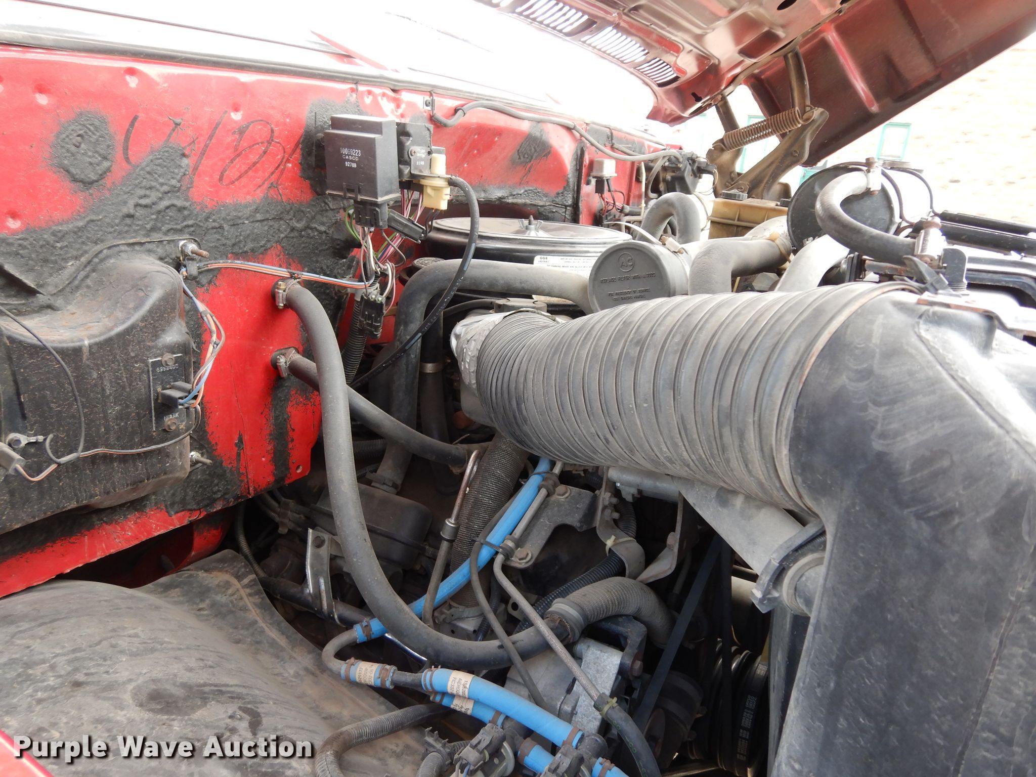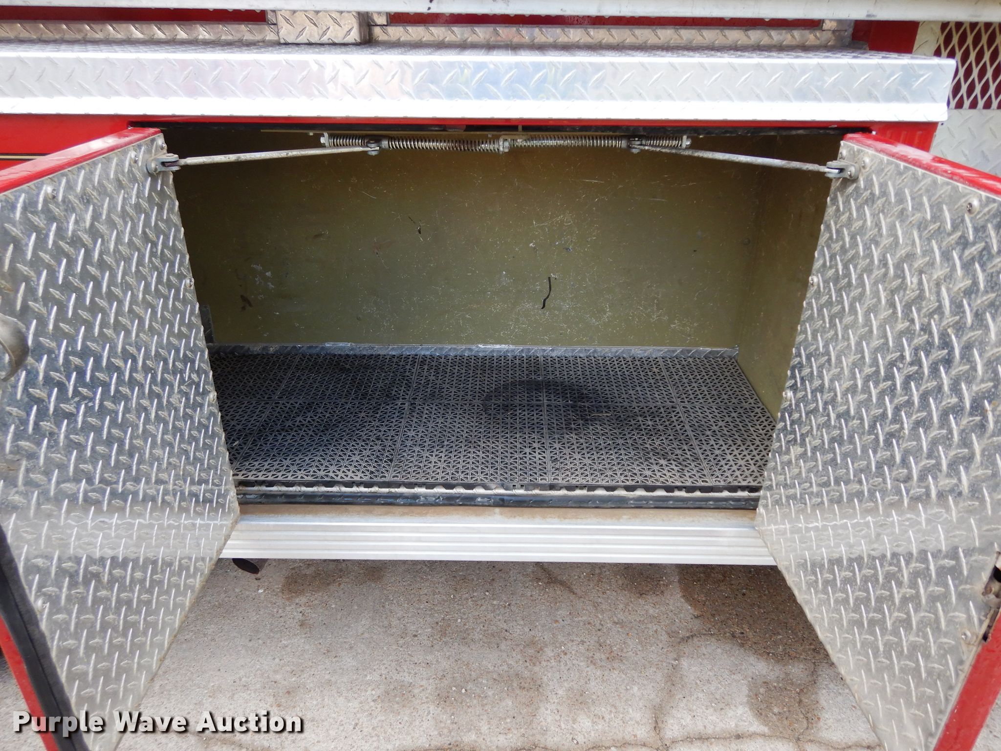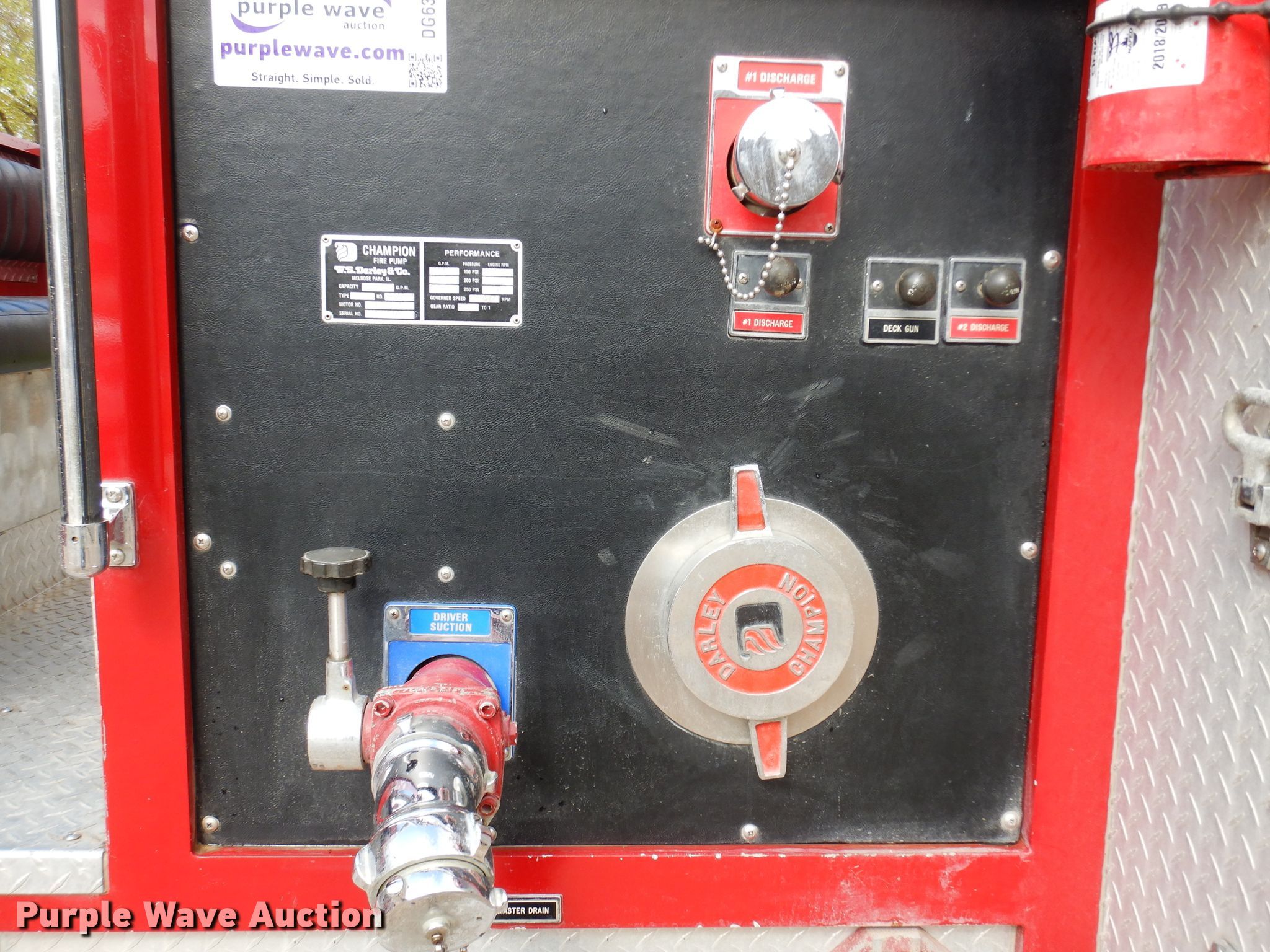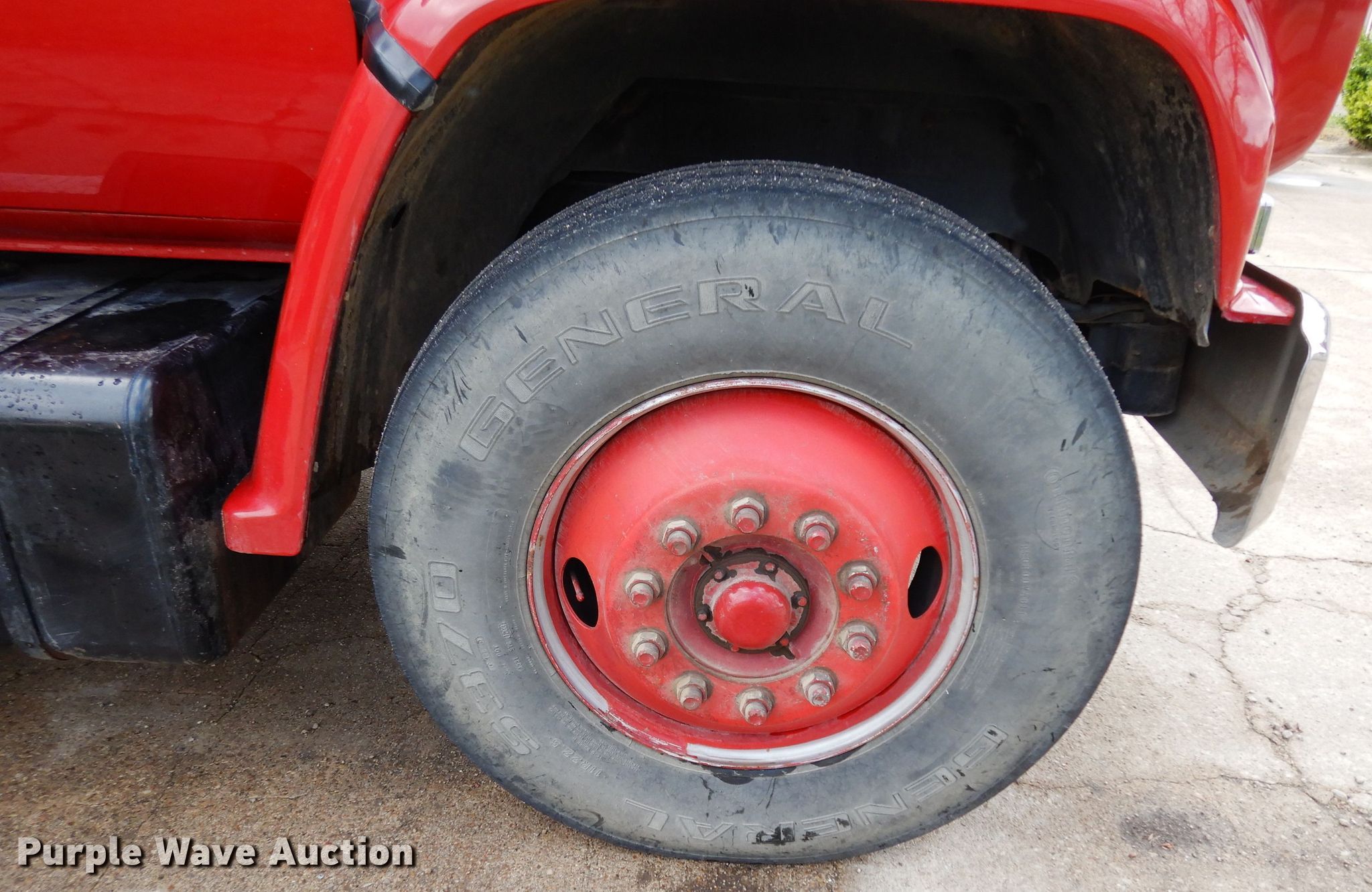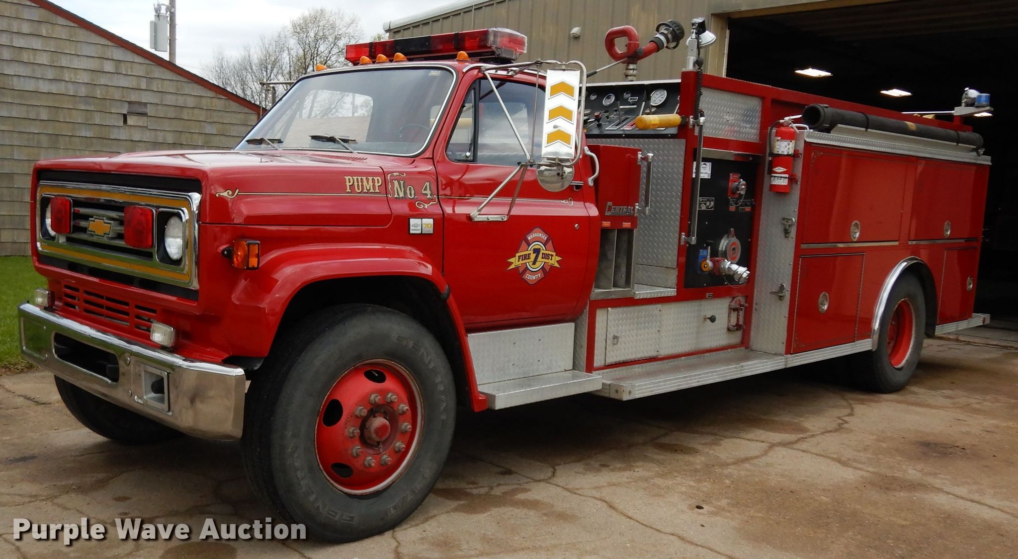Purple Wave is selling a used Fire Truck or Emergency Vehicle in Kansas. This item is a 1990 Chevrolet C70 pumper fire truck with the following: 6,437 miles on odometer, 7.0L V8 gas engine, Five speed manual transmission, Two speed rear end, Single axle, Heat, Light bar, Spotlights, 1,500 gallon water tank, Champion pump, Chrysler gas engine, 750 gpm, Pump last tested in 2018, Elevated deck gun, 150 to 1,000 gpm, 14' roof ladder, 22' extension ladder, Strainer, (2) 10'L hard suction hoses, 10" dump valve, Spring suspension, Hydraulic brakes, 218" wheelbase, 11R22.5 tires, GVWR 34,000 lbs, Owners manual, Radio and hose not included, Bed door shocks need to be replaced