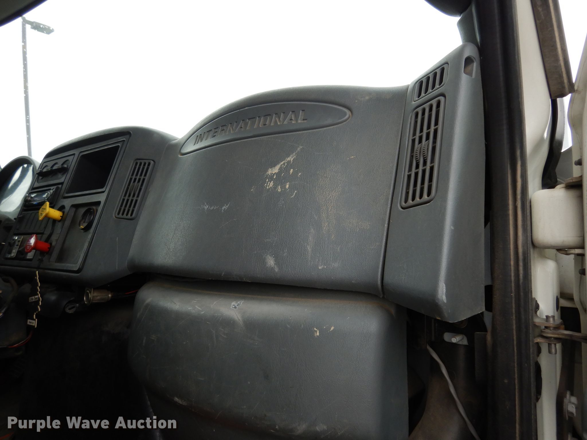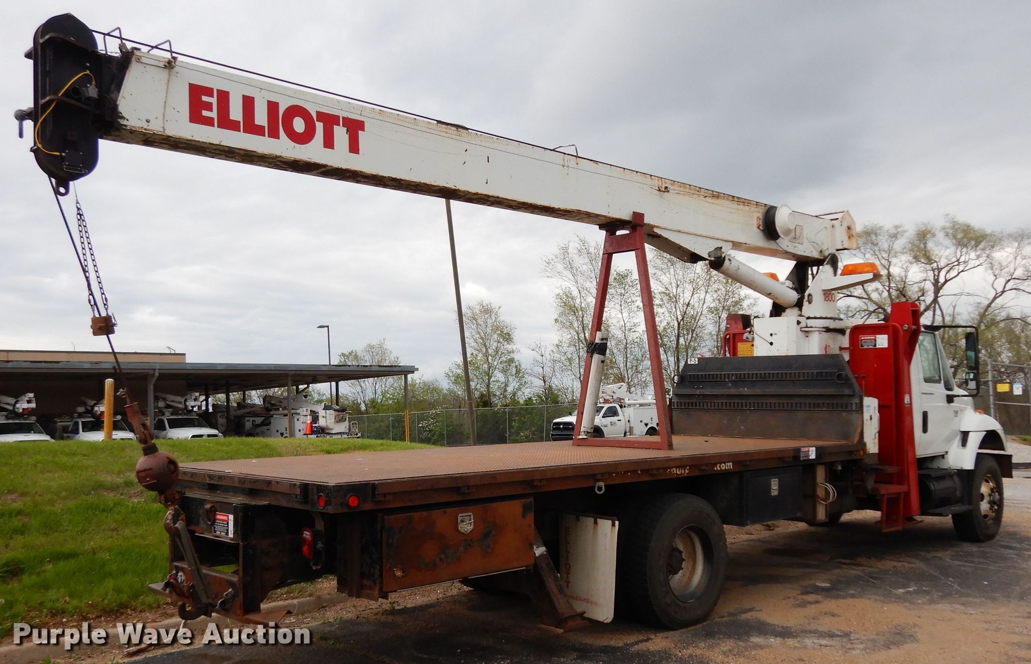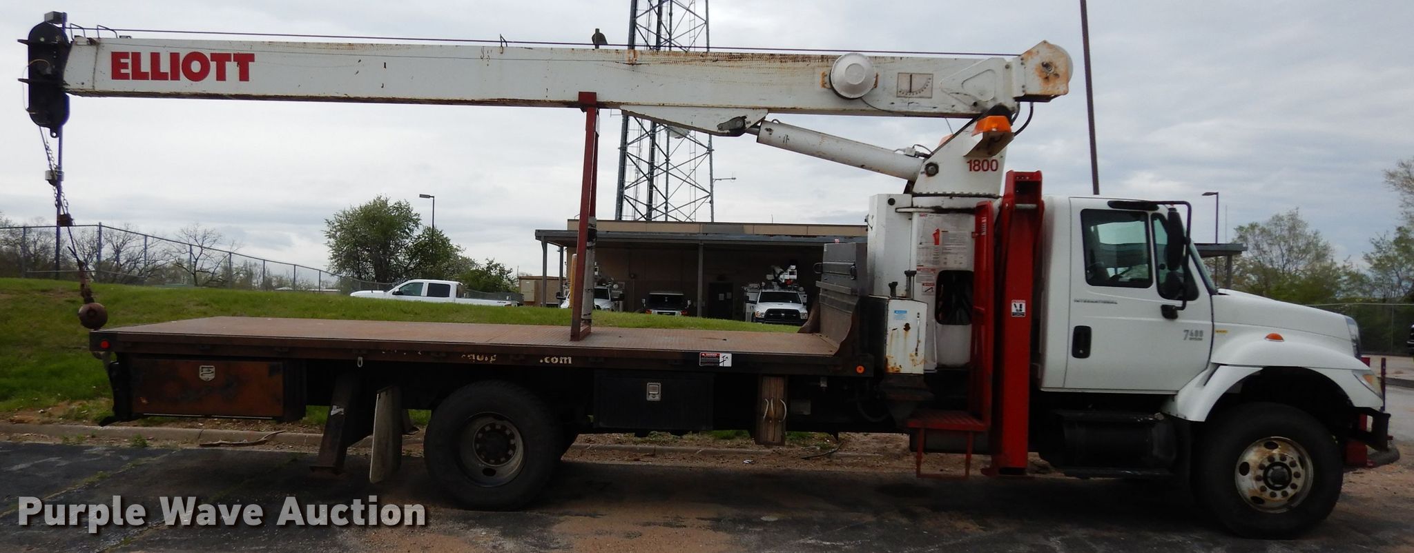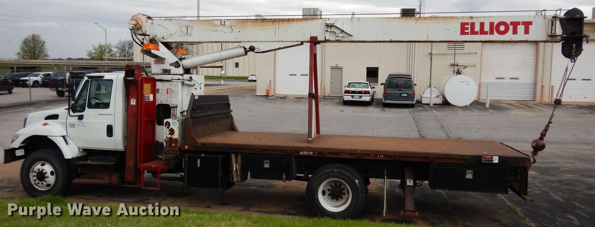 Purple Wave is selling a used Crane Truck in Kansas. This item is a 2004 International 7400 crane truck with the following: 129,490 miles on odometer, 15,203 hours on meter, International DT530 8.7L L6 diesel engine, Allison automatic transmission, Single axle, AC and heat, PTO, 20'L x 91"W flatbed, Elliot 1800 crane, 70' boom length, Ground boom controls, Crane ball and hook, Serial AP3157, Spring suspension, Air brakes, 236" wheelbase, Goodyear 315/80R22.5 front tires, Goodyear 11R22.5 rear tires, 13' travel height, Coolant in oil, View oil sample test report, Unit# 109