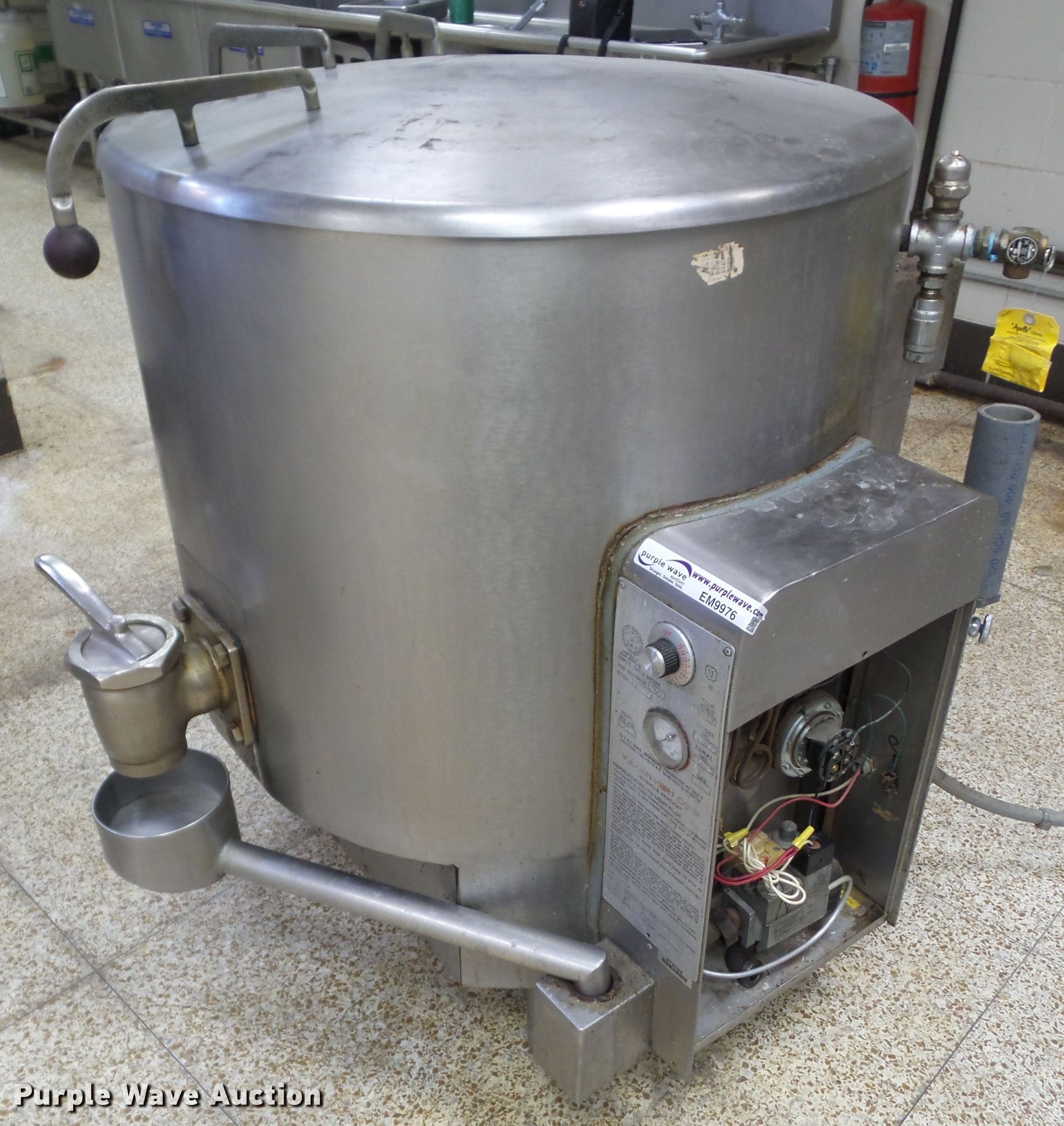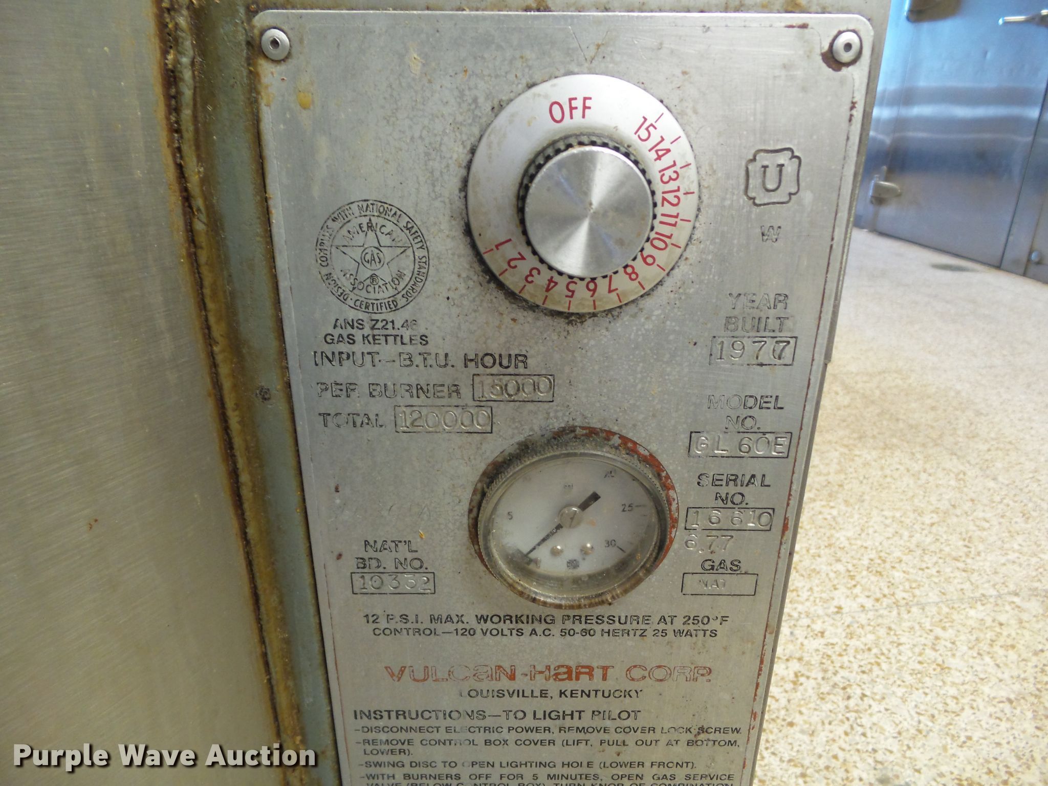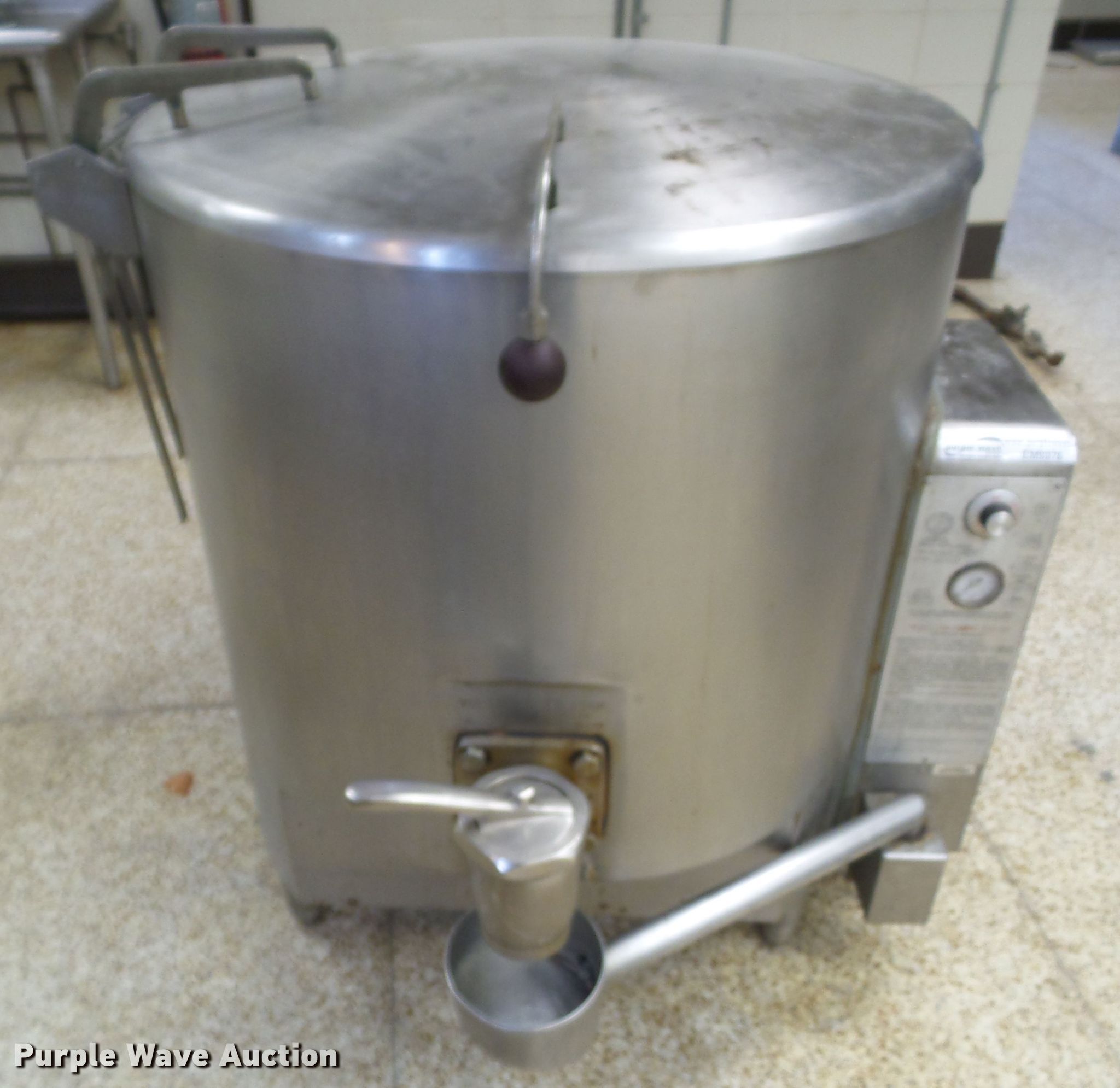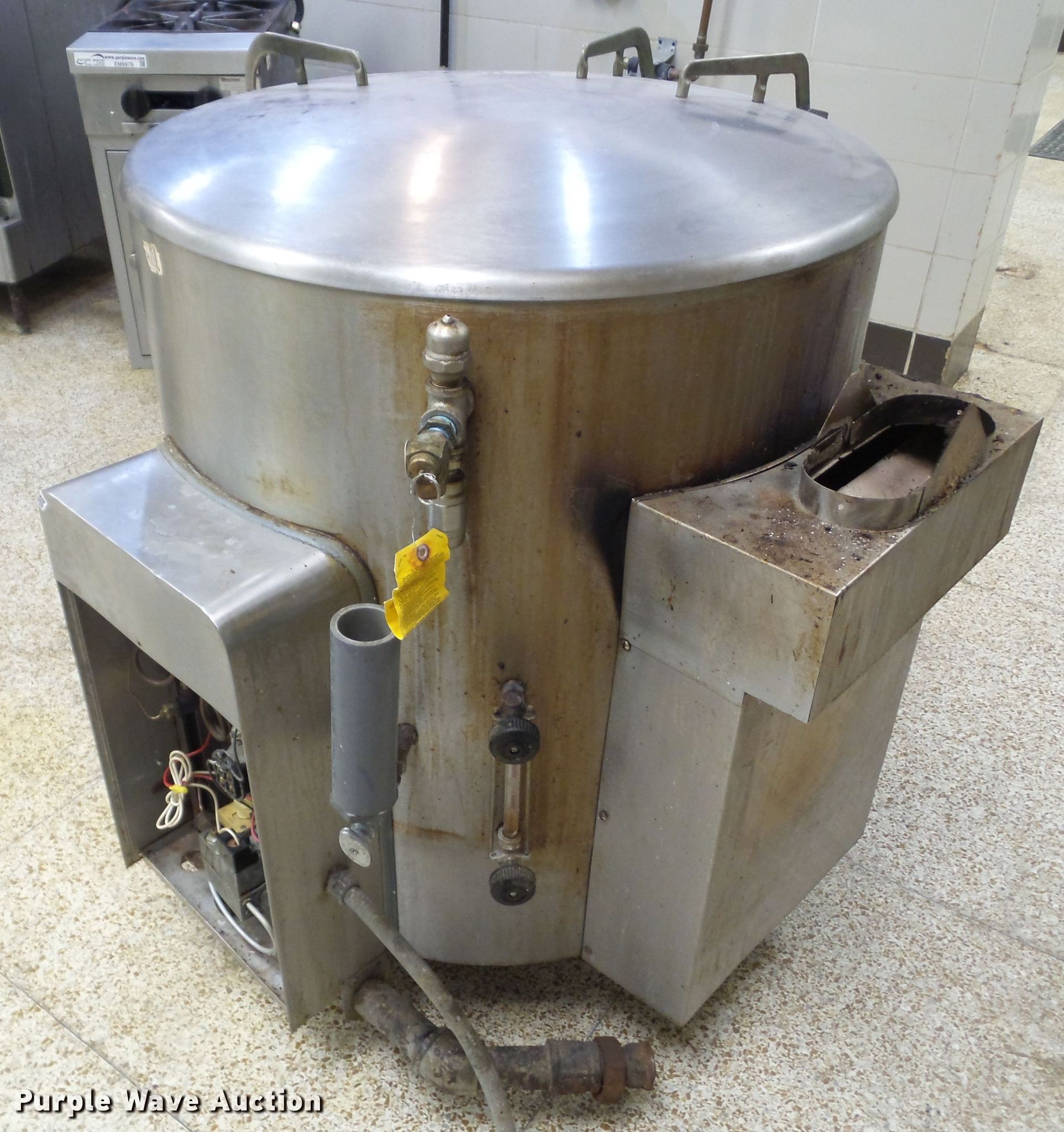 Purple Wave is selling a used Appliances in Iowa. This item is a Vulcan Hart GL60E jacketed kettle with the following: 110V, Natural gas fired, Serial 16610