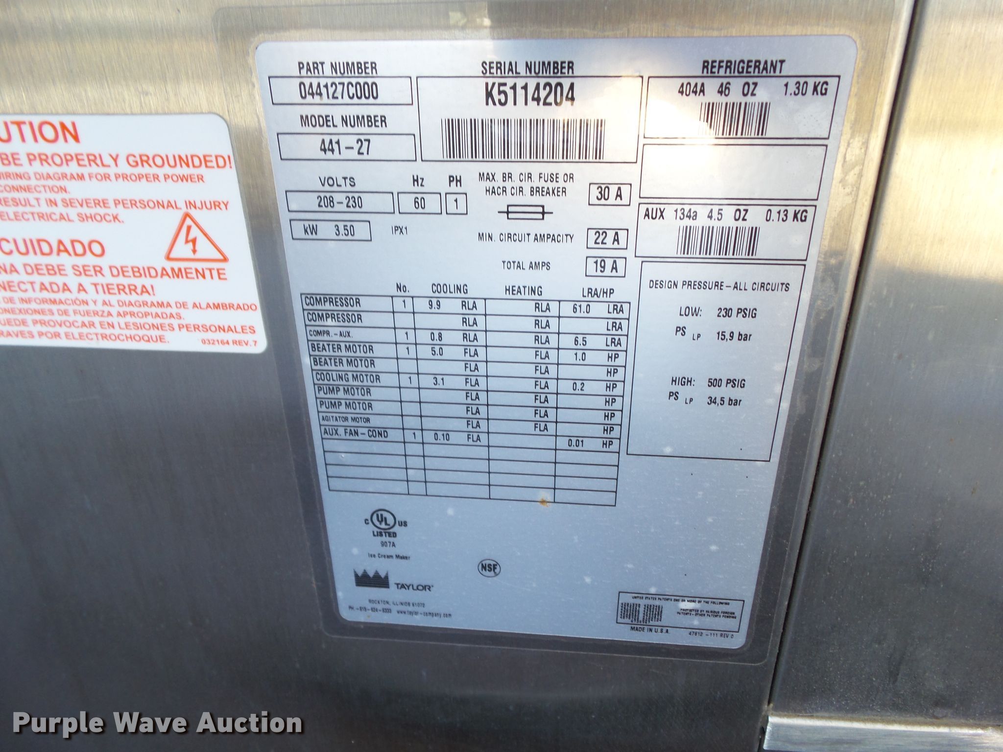 Purple Wave is selling a used Restaurant Equip. in Iowa. This item is a Taylor 441-27 soft serve machine with the following: 110/220V, Single flavor, Flavor burst machine, Serial K5114204