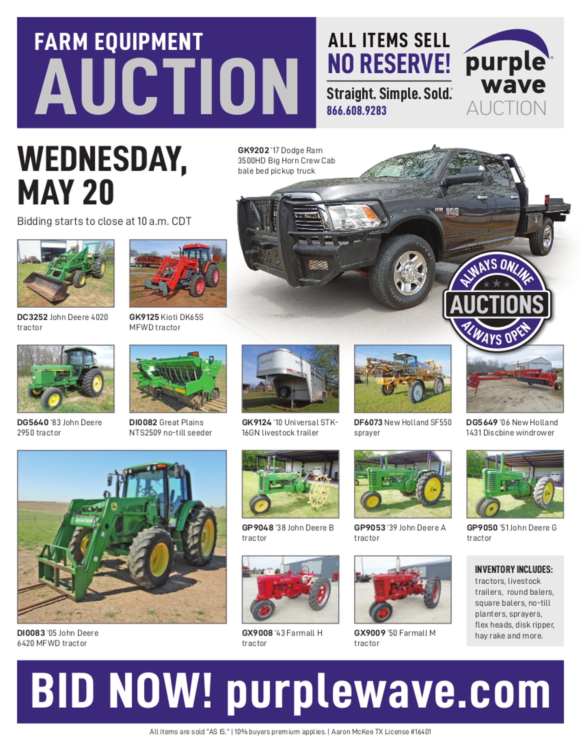This auction is conducted by Purple Wave, Inc., whose home office is 825 Levee Drive, Manhattan, Kansas. Aaron McKee, Texas auctioneer license # 16401, operates Purple Wave, Inc. Complaints against us may be directed to the Texas Department of Licensing and Regulation, P.O. Box 12157, Austin, Texas 78711, (512) 463-6599. For additional required information, see the attached document.