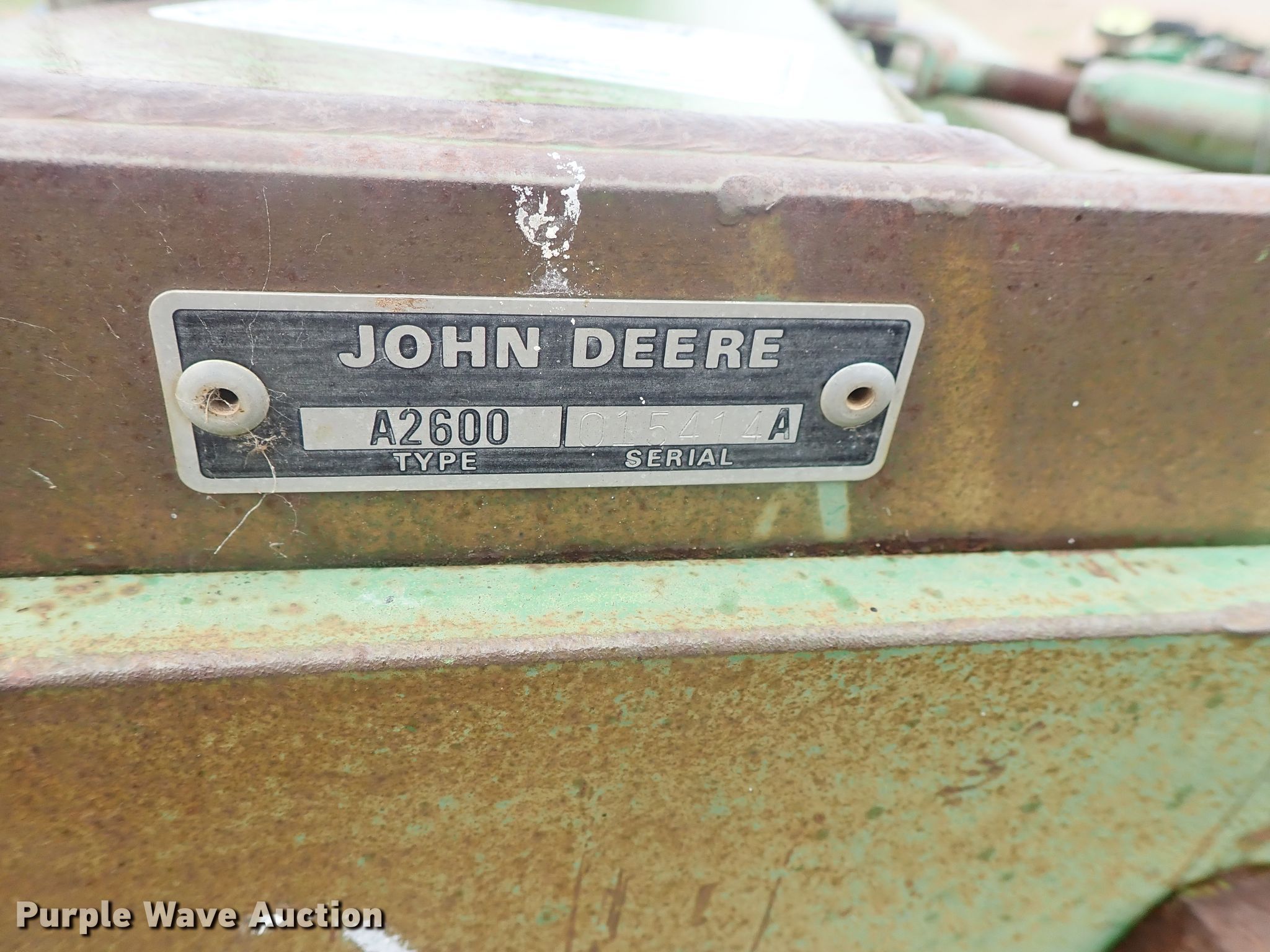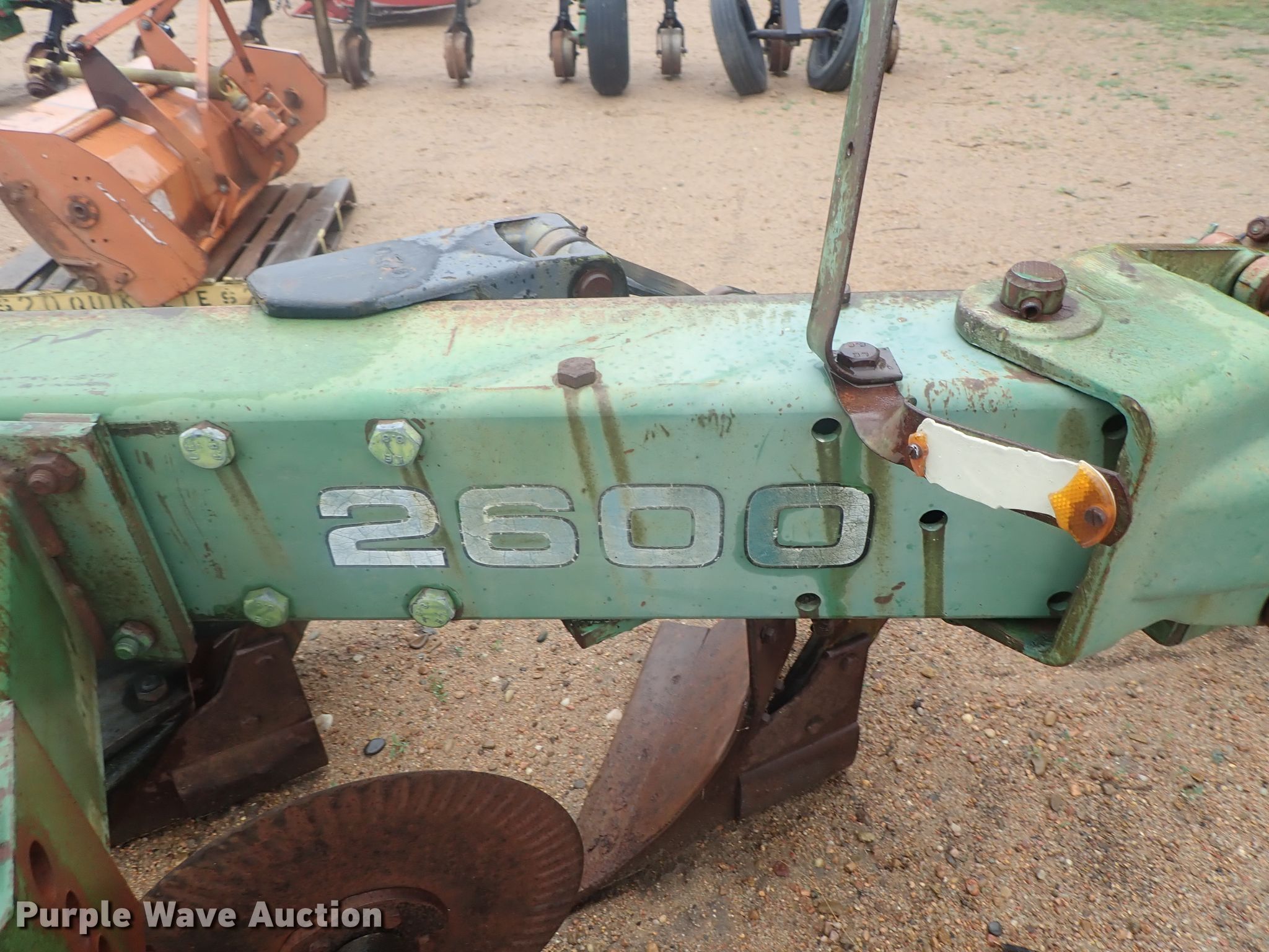 Purple Wave is selling a used Plow in Kansas. This item is a John Deere 2600 six bottom plow with the following: Hydraulic lift, Three point hitch, 9.5L-14 transport tires, Serial 015414A