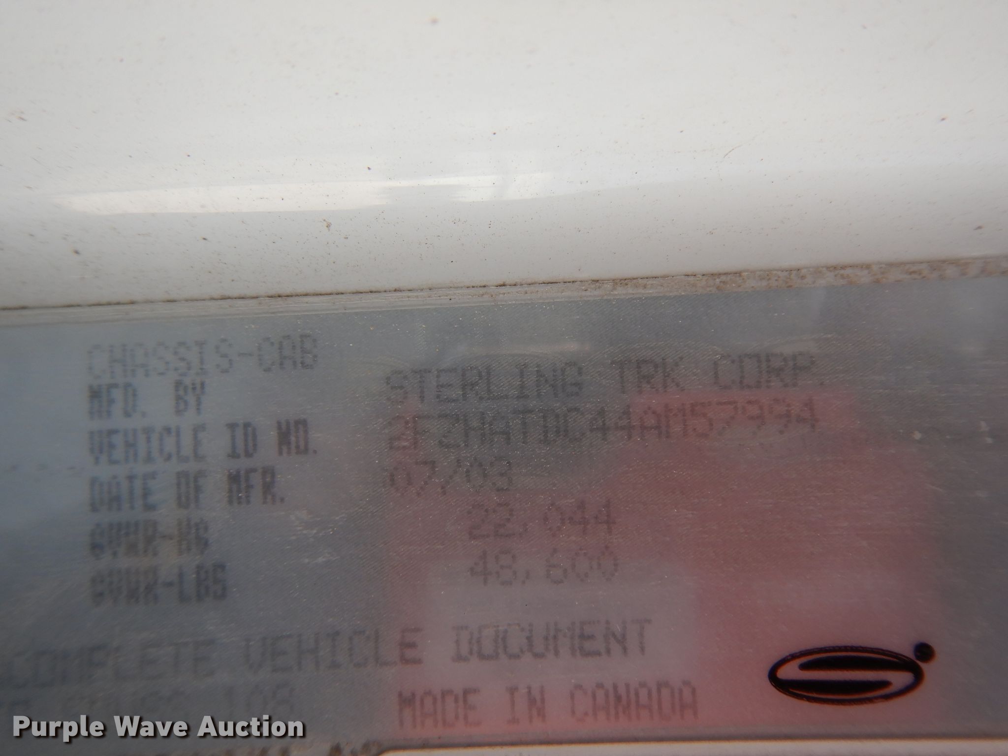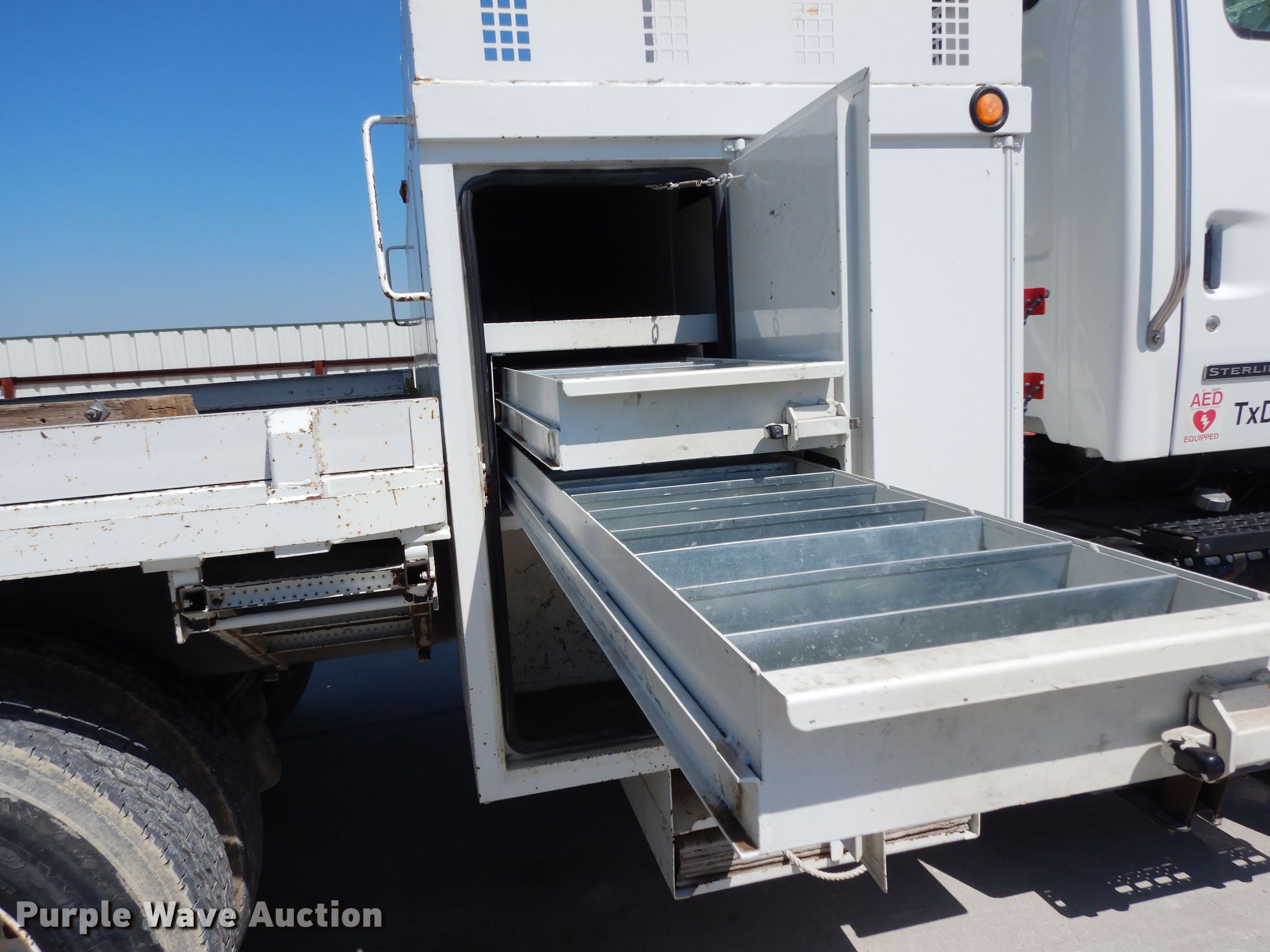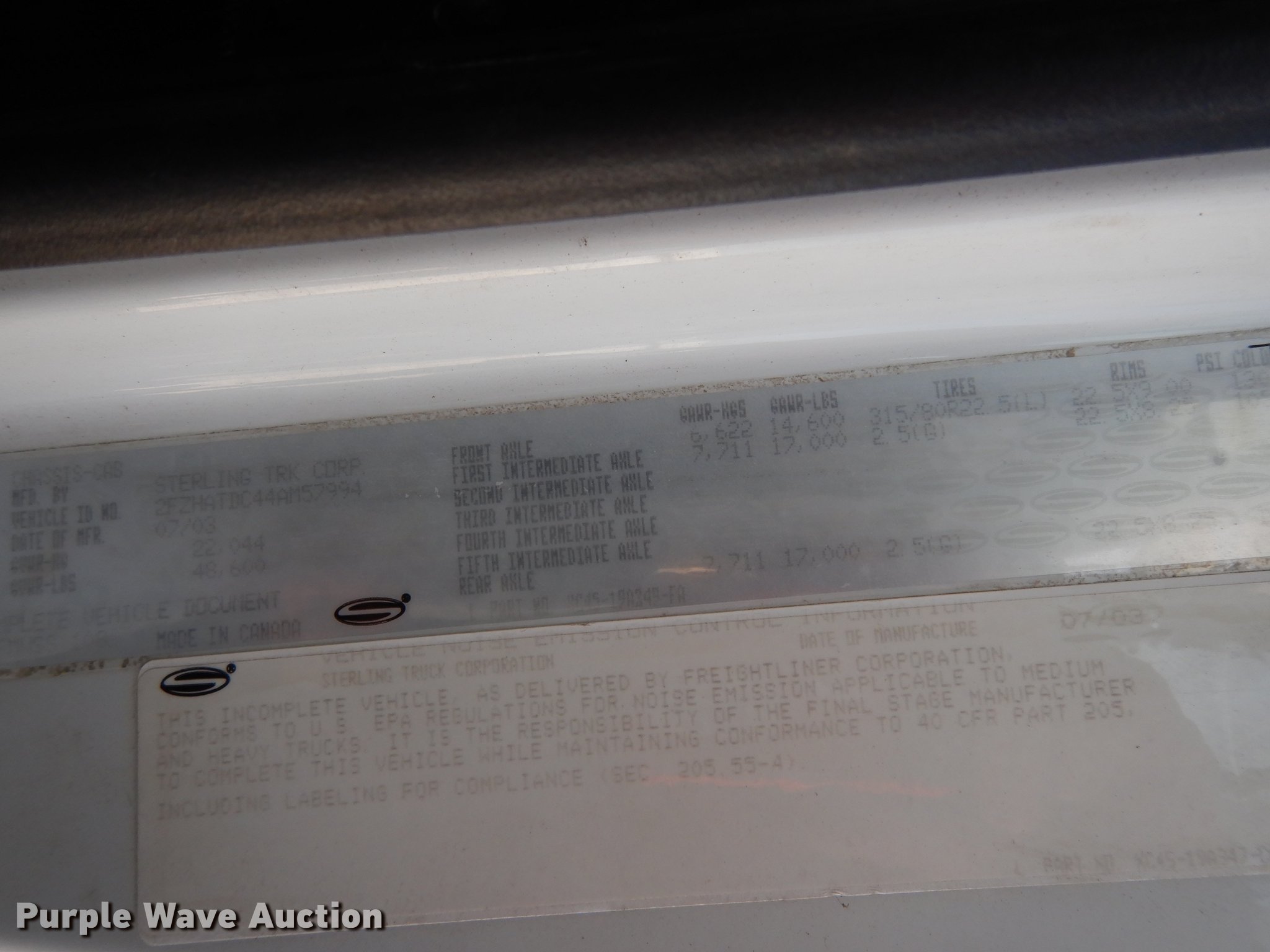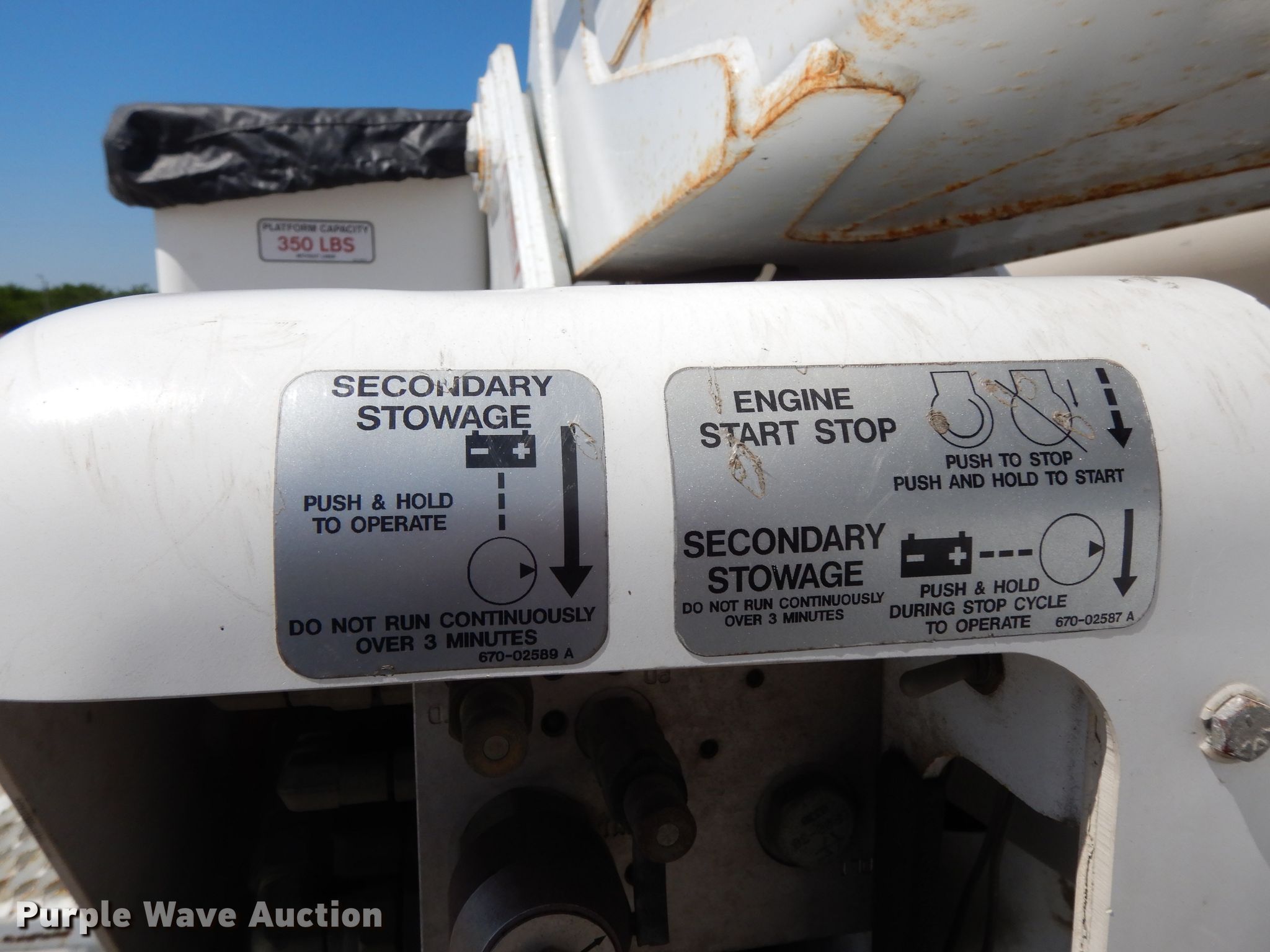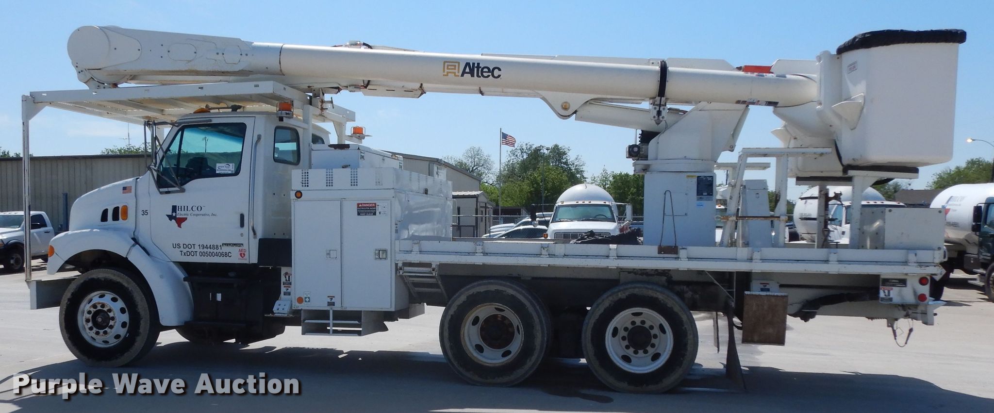 Purple Wave is selling a used Bucket Truck in Texas. This item is a 2004 Sterling L-Line bucket truck with the following: 74,267 miles on odometer, 4,681 hours on meter, Caterpillar C7 7.2L L6 diesel engine, Automatic transmission, Tandem axle, Inter-axle differential lock, AC and heat, Brake controller, PTO, Wet kit, Altec utility bed, 19'L x 8'4"W, 2003 Altec AM55 articulating boom, 30' boom length, 11.3' stowed mast height, 350 lbs maximum lift capacity, 55' maximum lift height, Man basket, Platform and ground controls, Spring suspension, Air brakes, 192" wheelbase, 315/80R22.5 front tires, 11R22.5 rear tires, GVWR 48,600 lbs, Non-operational backup camera, Passenger man basket did not pass dielectric test