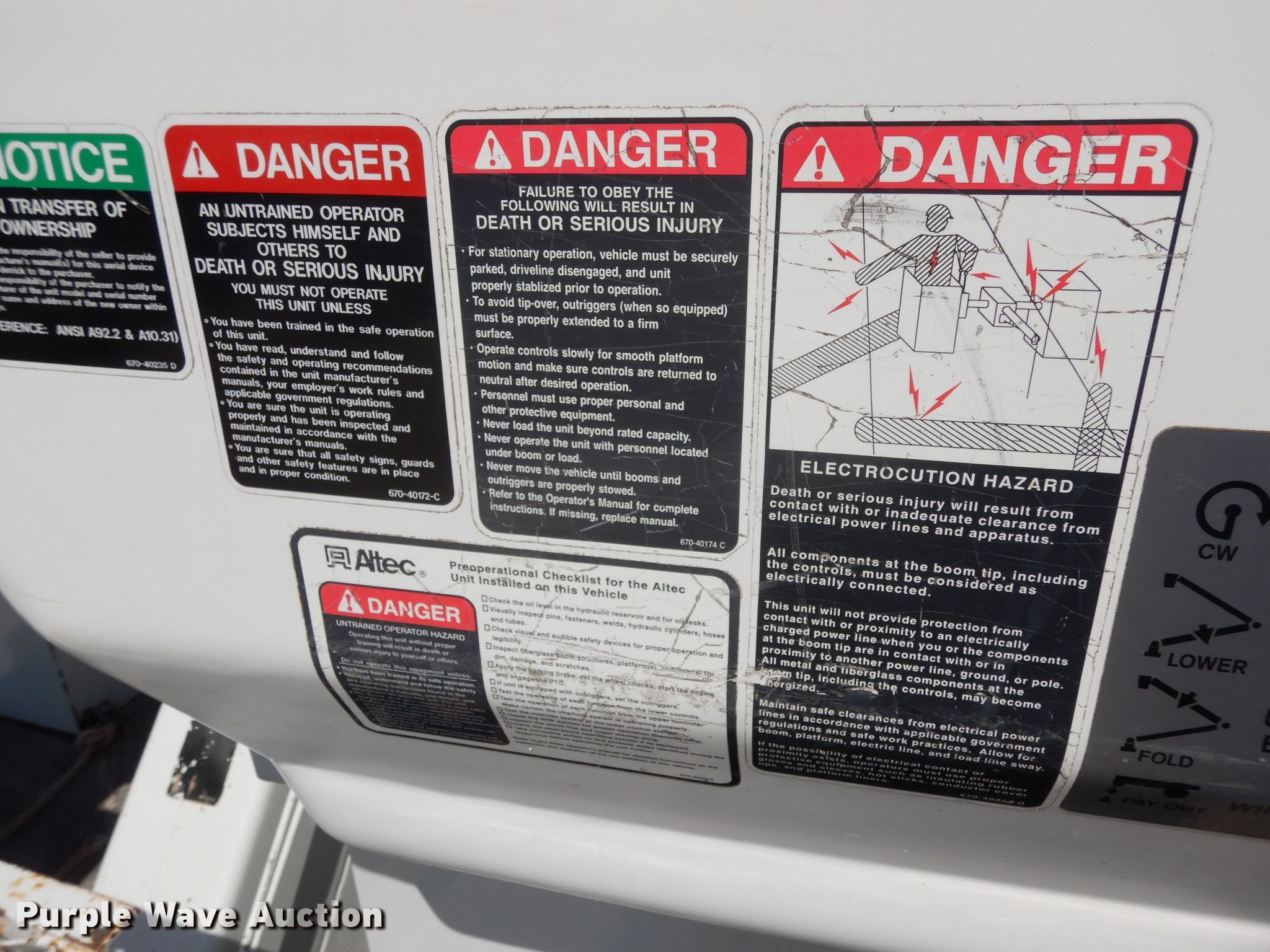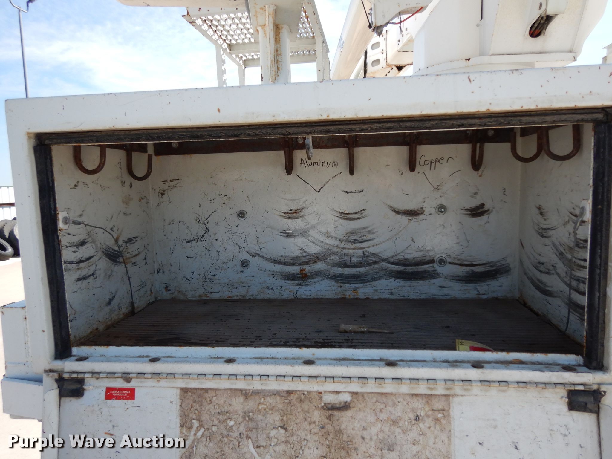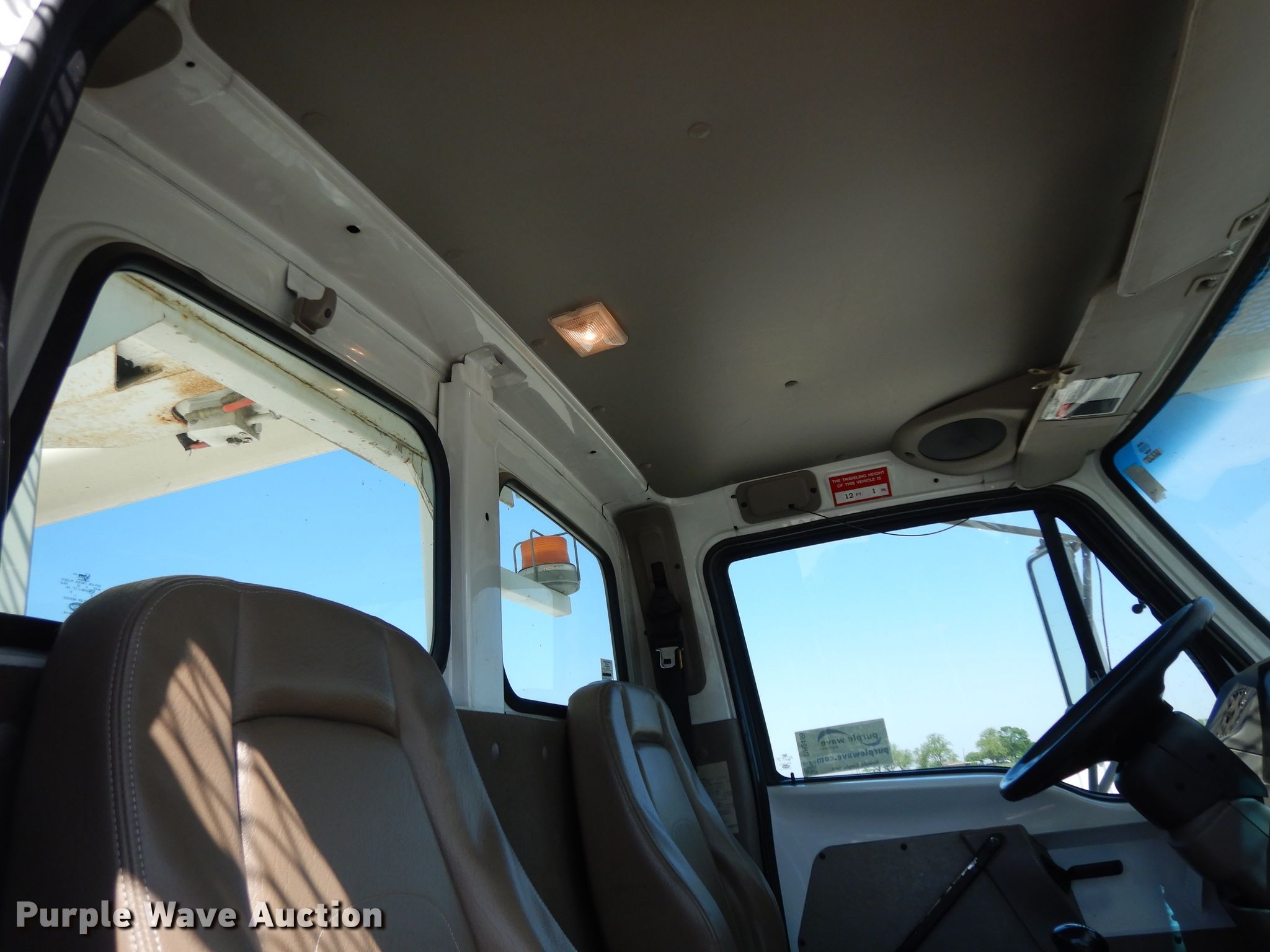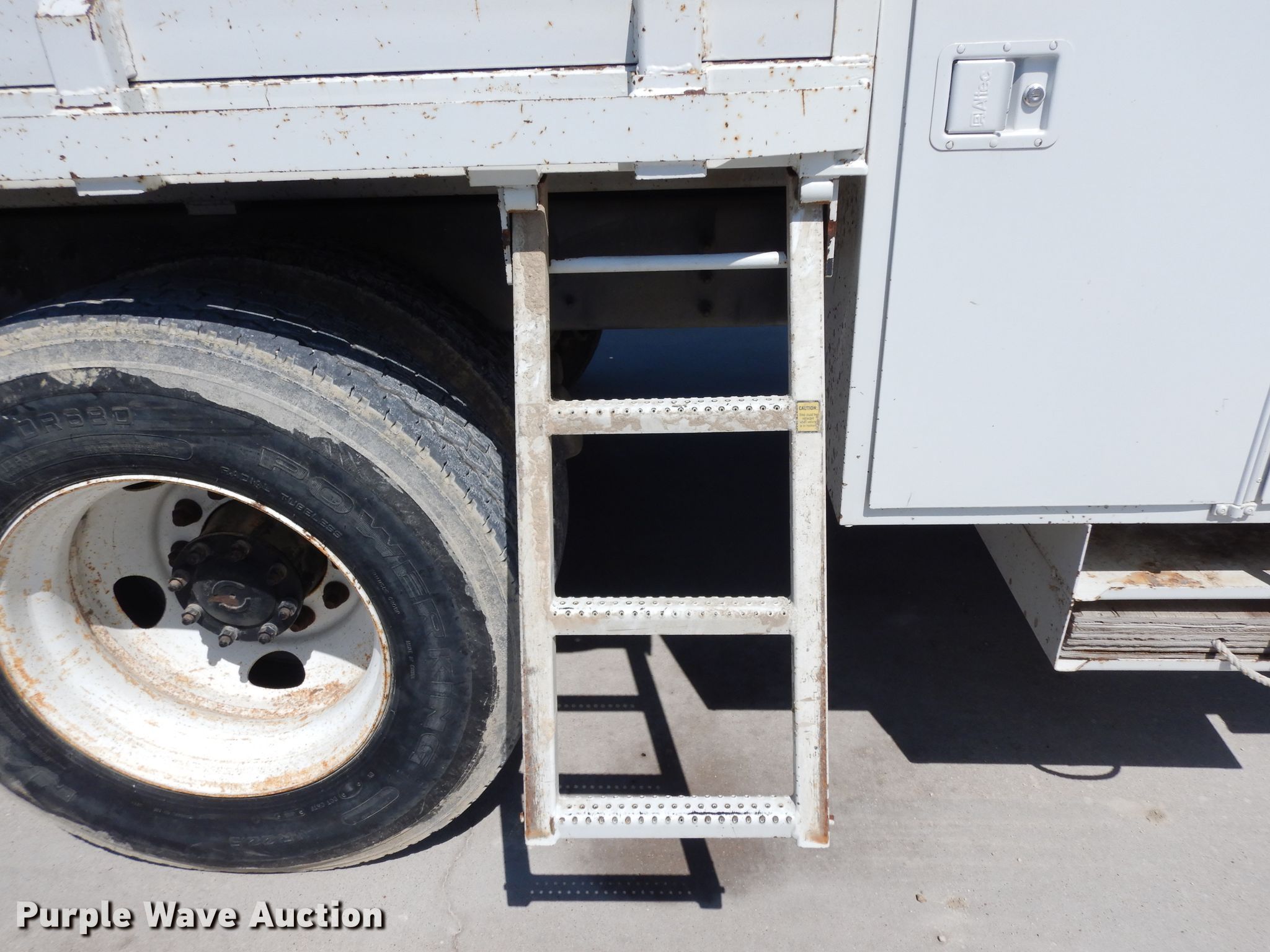 Purple Wave is selling a used Bucket Truck in Texas. This item is a 2004 Sterling L-Line bucket truck with the following: 74,267 miles on odometer, 4,681 hours on meter, Caterpillar C7 7.2L L6 diesel engine, Automatic transmission, Tandem axle, Inter-axle differential lock, AC and heat, Brake controller, PTO, Wet kit, Altec utility bed, 19'L x 8'4"W, 2003 Altec AM55 articulating boom, 30' boom length, 11.3' stowed mast height, 350 lbs maximum lift capacity, 55' maximum lift height, Man basket, Platform and ground controls, Spring suspension, Air brakes, 192" wheelbase, 315/80R22.5 front tires, 11R22.5 rear tires, GVWR 48,600 lbs, Non-operational backup camera, Passenger man basket did not pass dielectric test