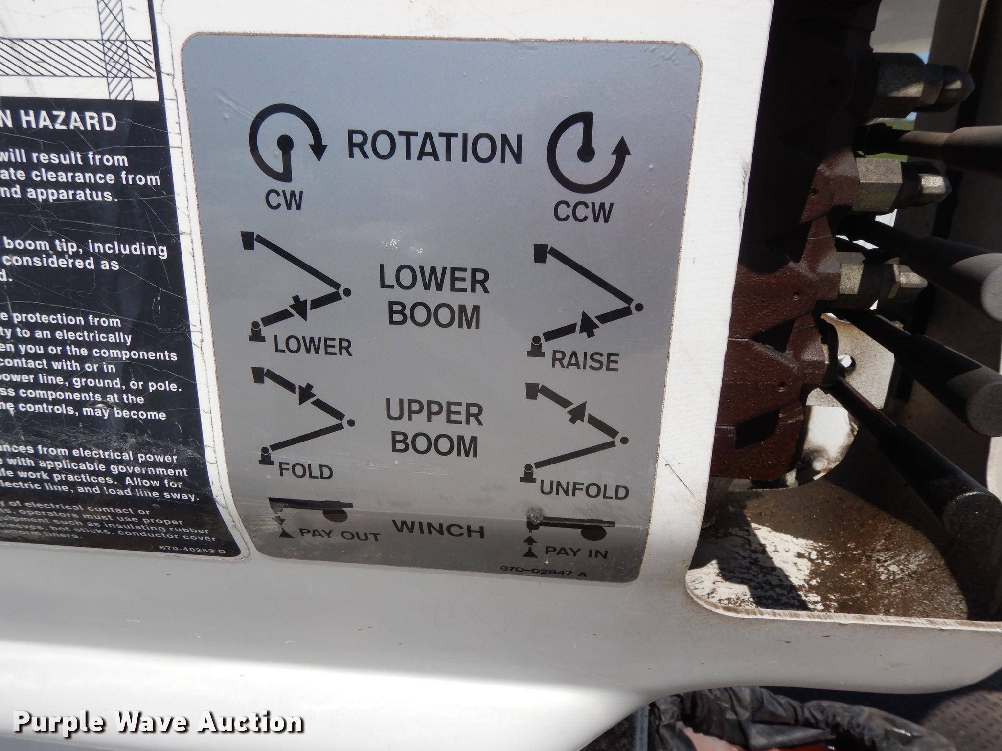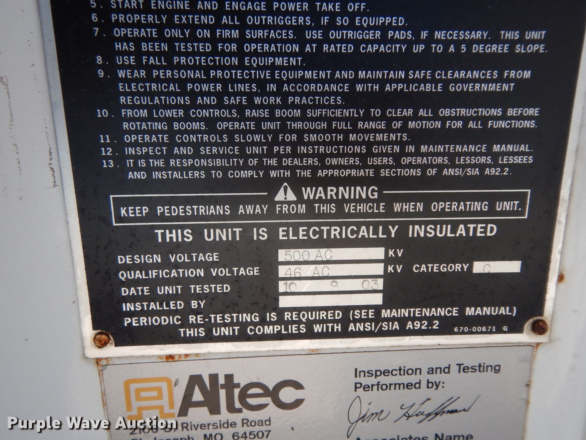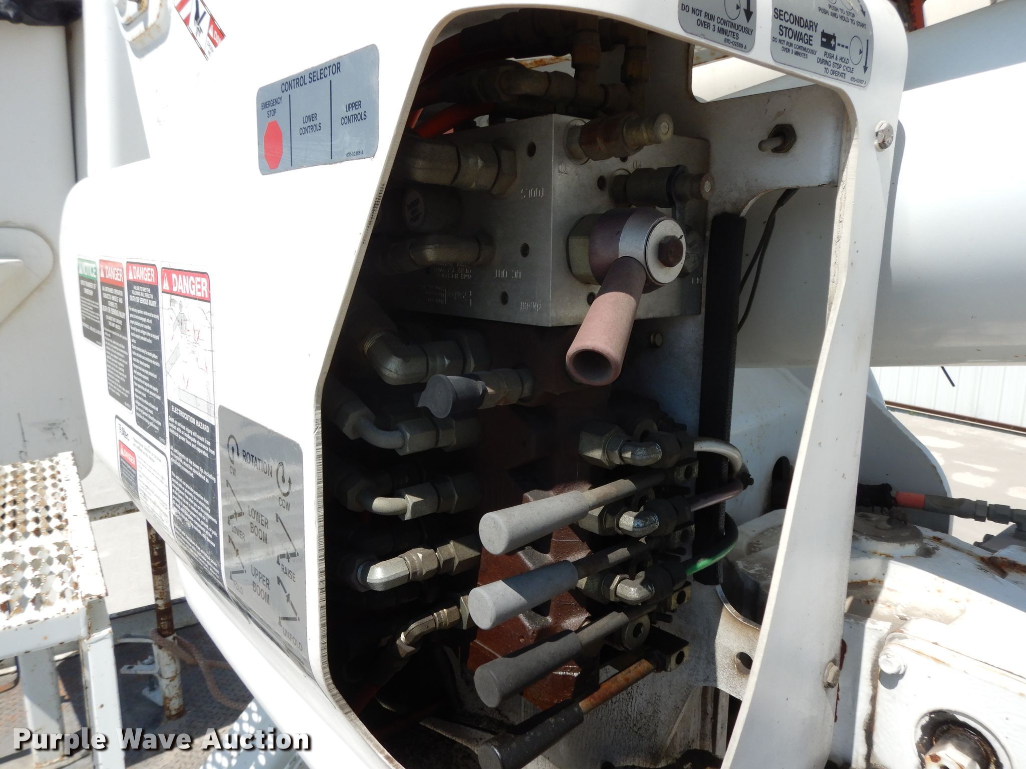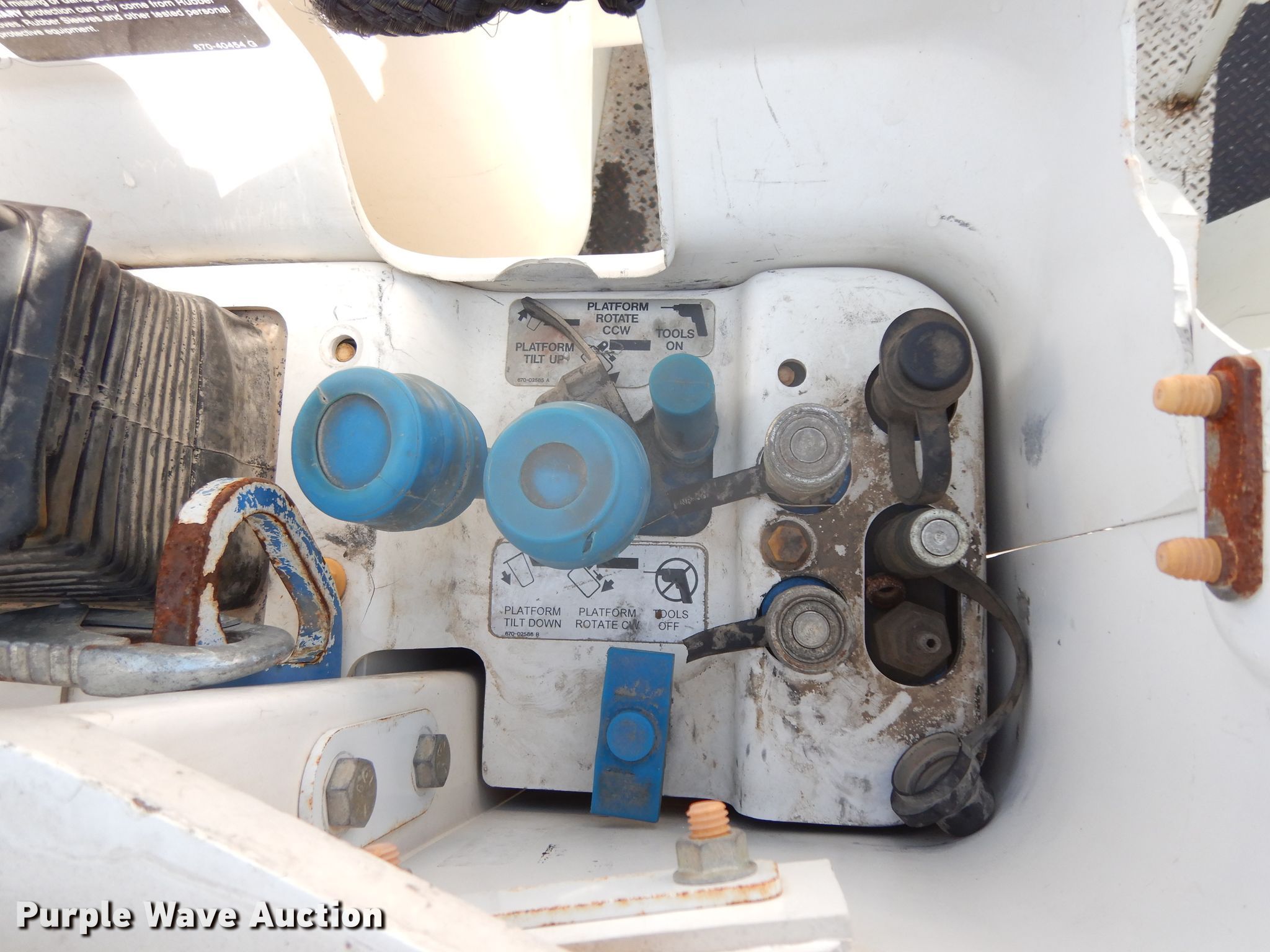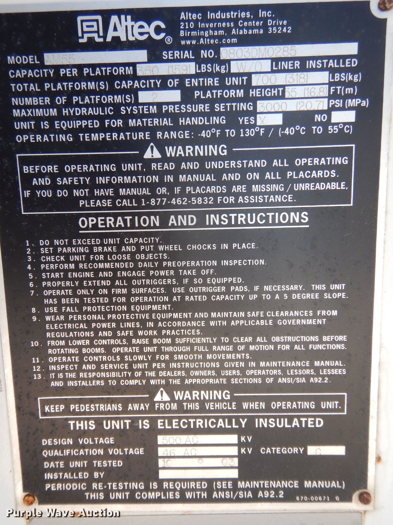 Purple Wave is selling a used Bucket Truck in Texas. This item is a 2004 Sterling L-Line bucket truck with the following: 74,267 miles on odometer, 4,681 hours on meter, Caterpillar C7 7.2L L6 diesel engine, Automatic transmission, Tandem axle, Inter-axle differential lock, AC and heat, Brake controller, PTO, Wet kit, Altec utility bed, 19'L x 8'4"W, 2003 Altec AM55 articulating boom, 30' boom length, 11.3' stowed mast height, 350 lbs maximum lift capacity, 55' maximum lift height, Man basket, Platform and ground controls, Spring suspension, Air brakes, 192" wheelbase, 315/80R22.5 front tires, 11R22.5 rear tires, GVWR 48,600 lbs, Non-operational backup camera, Passenger man basket did not pass dielectric test