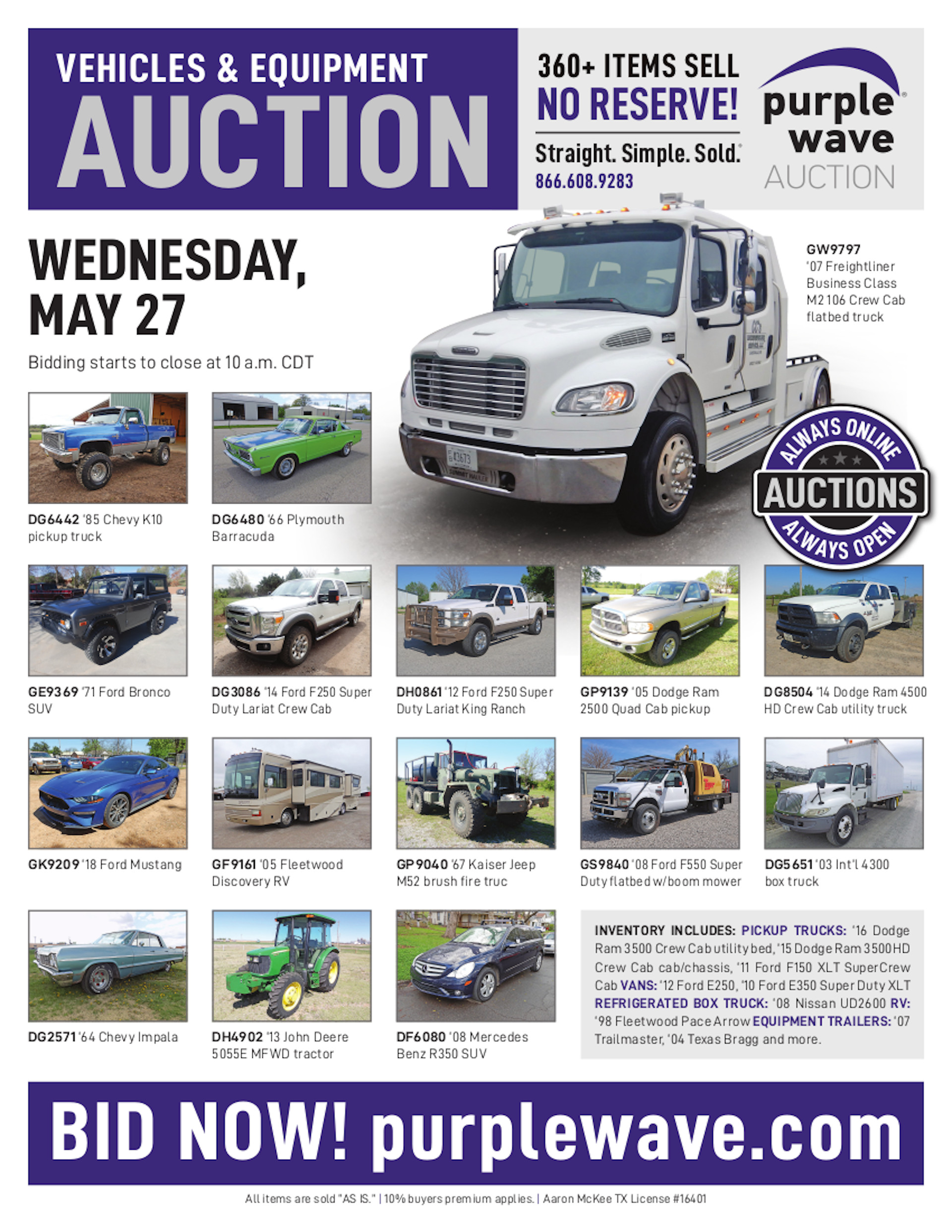 This auction is conducted by Purple Wave, Inc., whose home office is 825 Levee Drive, Manhattan, Kansas. Aaron McKee, Texas auctioneer license # 16401, operates Purple Wave, Inc. Complaints against us may be directed to the Texas Department of Licensing and Regulation, P.O. Box 12157, Austin, Texas 78711, (512) 463-6599. For additional required information, see the attached document.
