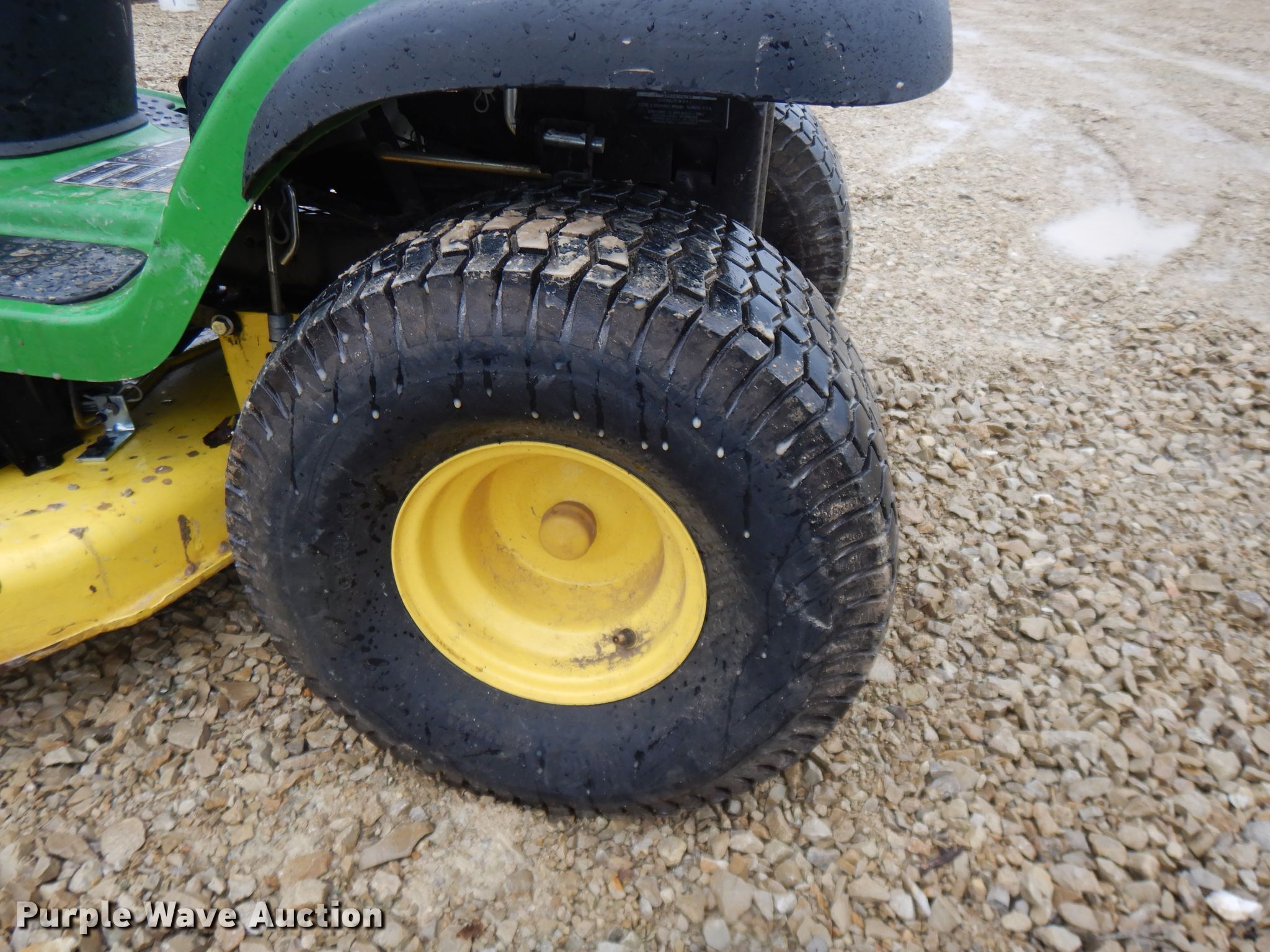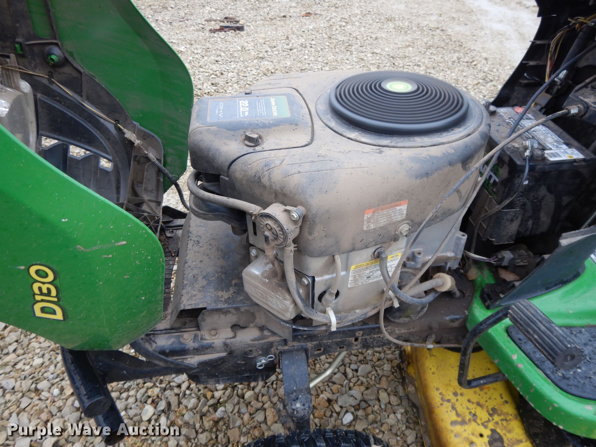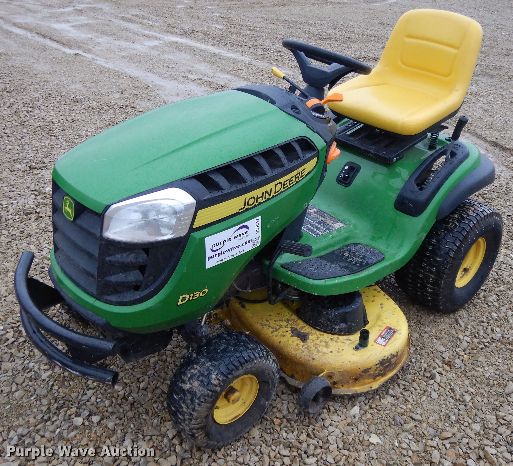 Purple Wave is selling a used Lawn Mower in Kansas. This item is a John Deere D130 lawn mower with the following: 189 hours on meter, 42" cut, Two cylinder gas engine, 22 HP, Hydrostatic transmission, 15x6.00x6 front tires, 20x10x8 rear tires, Front tires leaks air, Serial 1GXD130ELEE513368, Unit# 167033