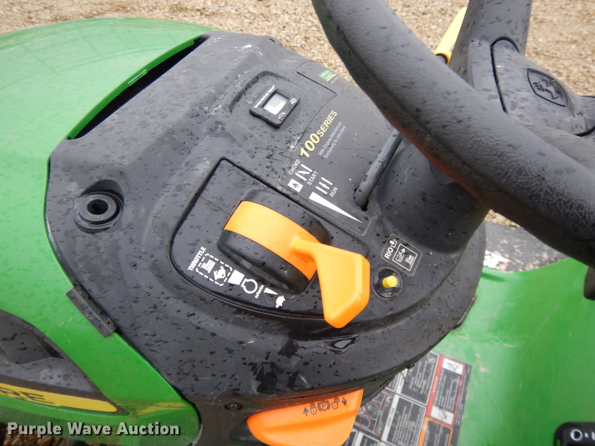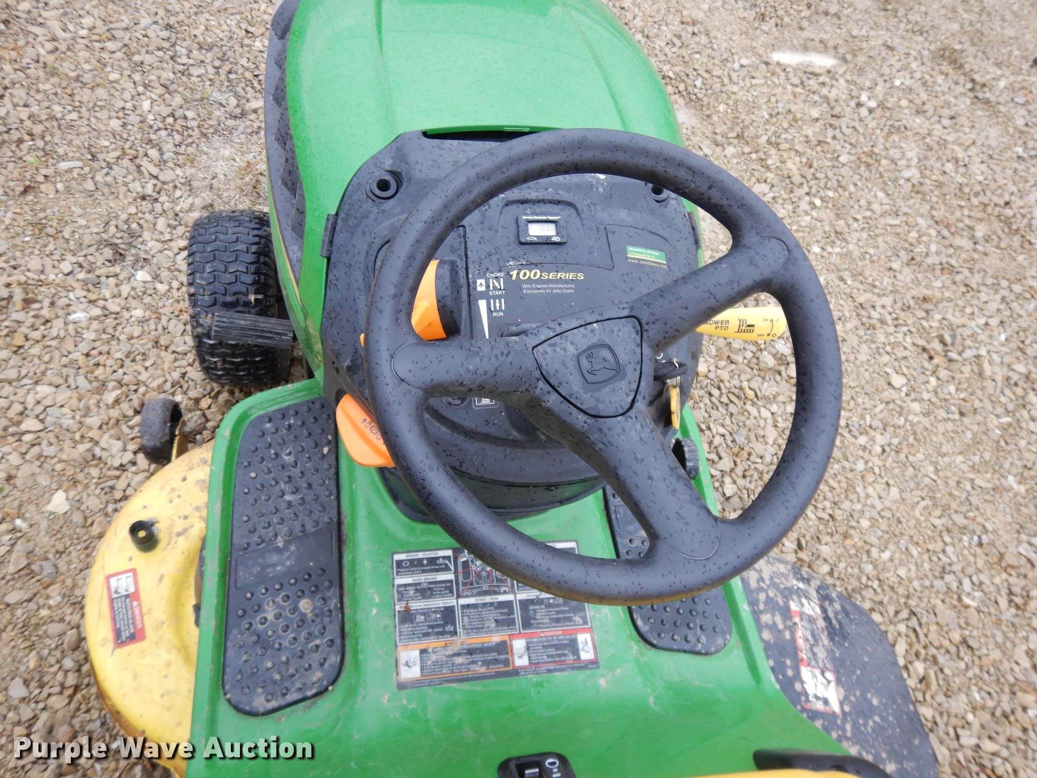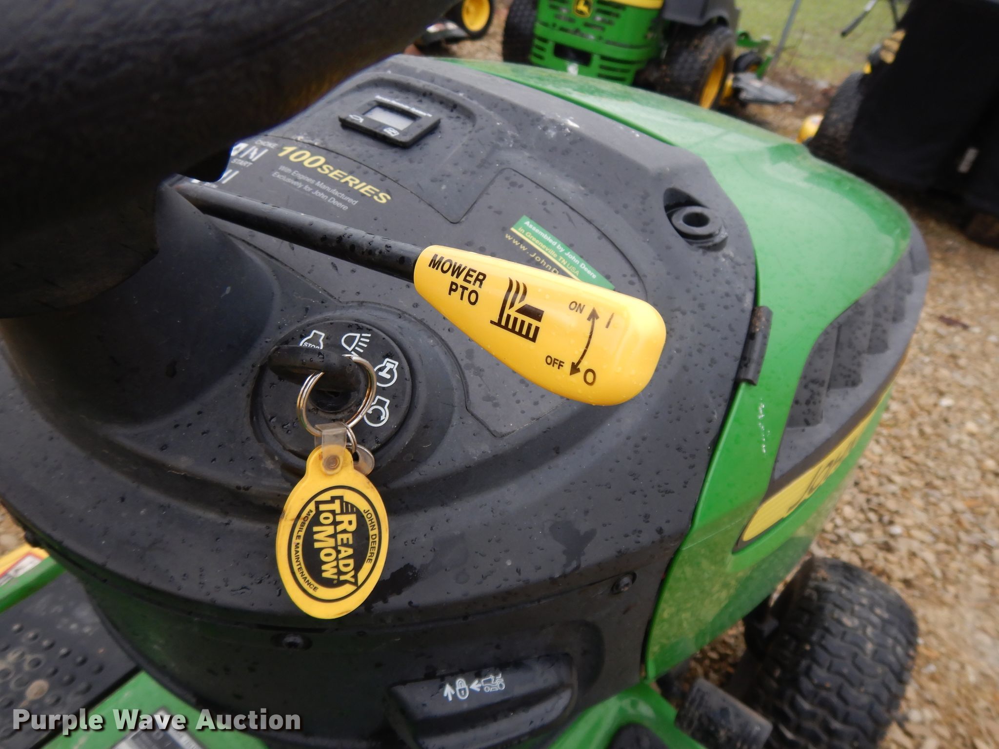Purple Wave is selling a used Lawn Mower in Kansas. This item is a John Deere D130 lawn mower with the following: 189 hours on meter, 42" cut, Two cylinder gas engine, 22 HP, Hydrostatic transmission, 15x6.00x6 front tires, 20x10x8 rear tires, Front tires leaks air, Serial 1GXD130ELEE513368, Unit# 167033