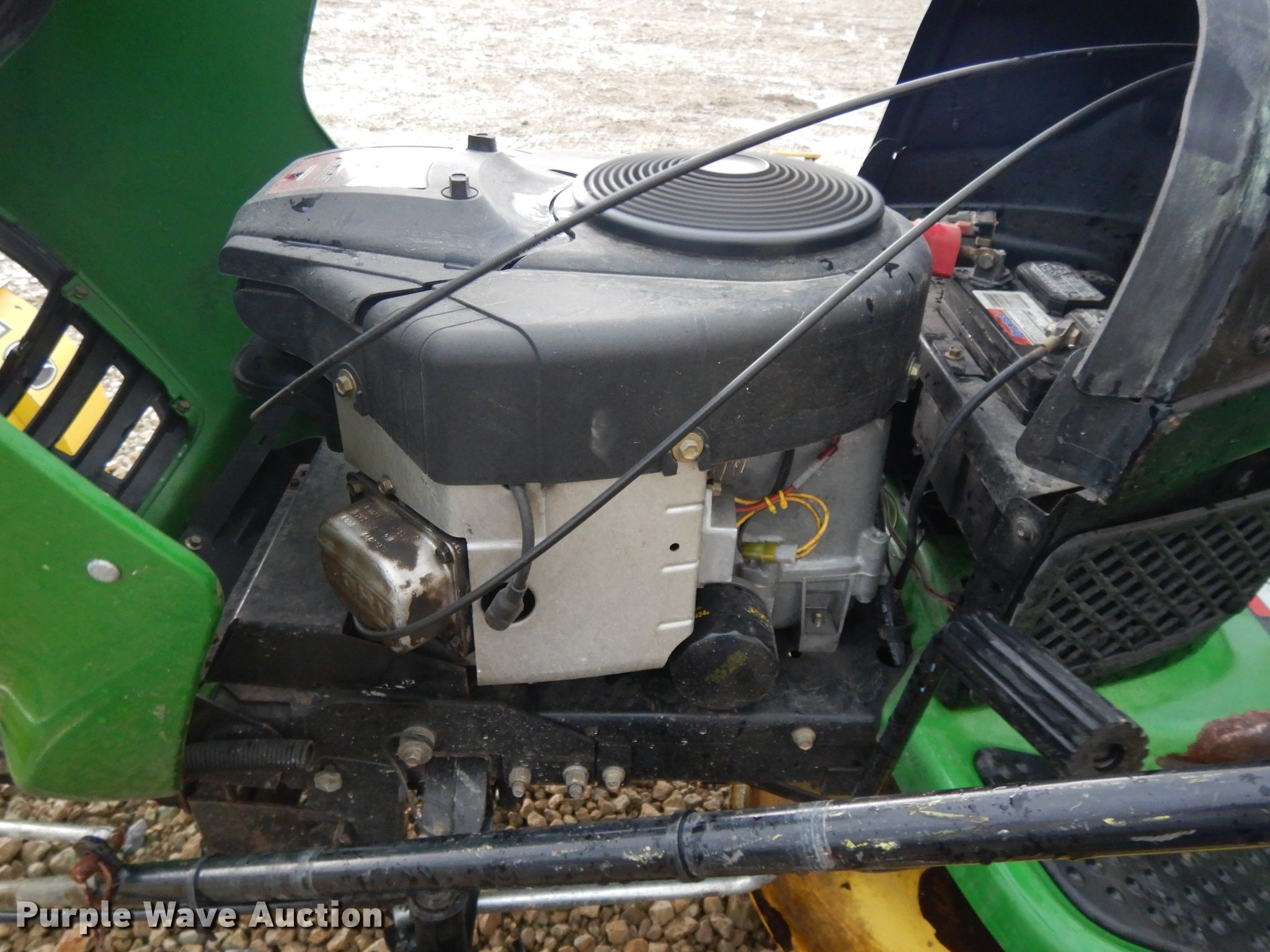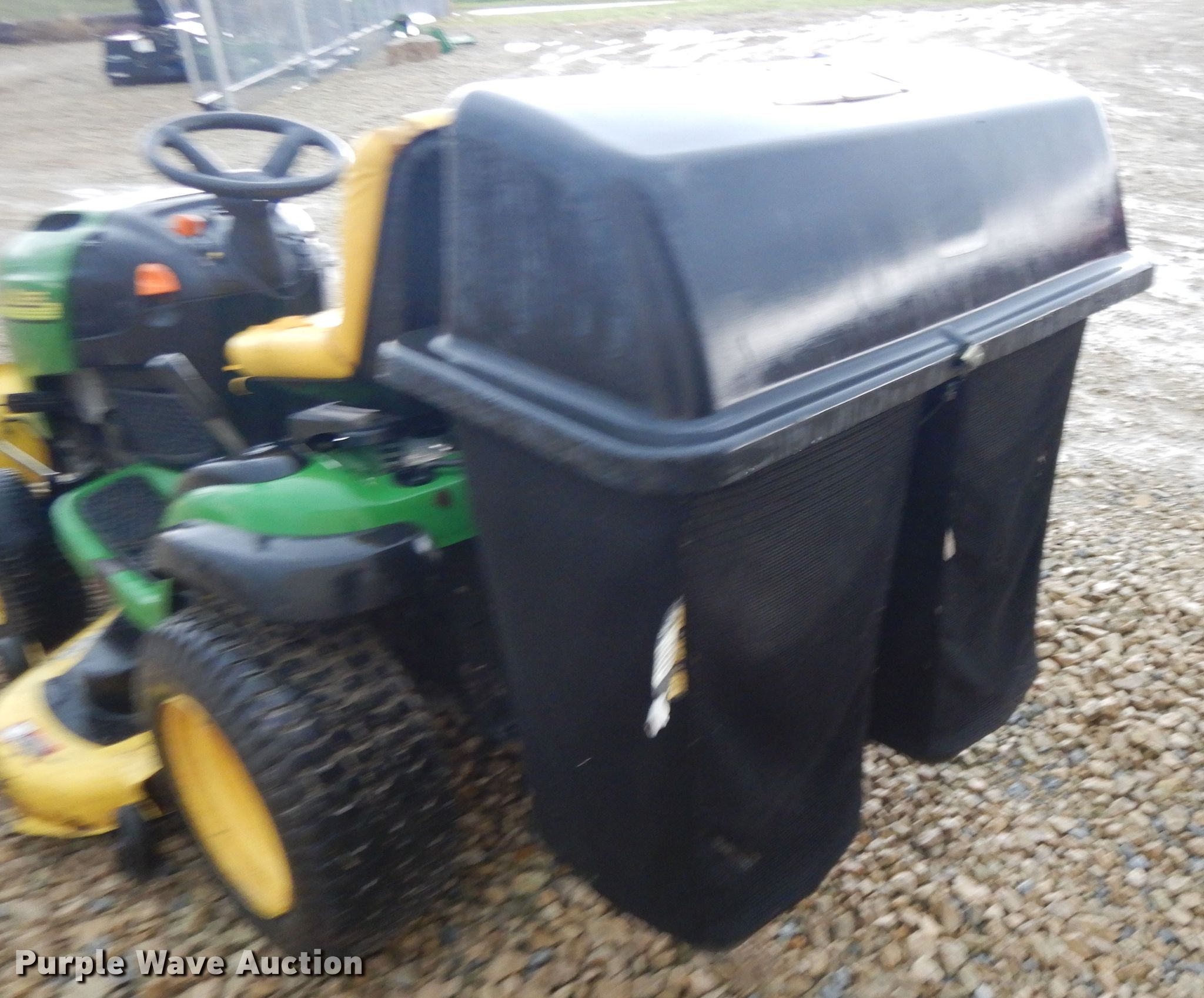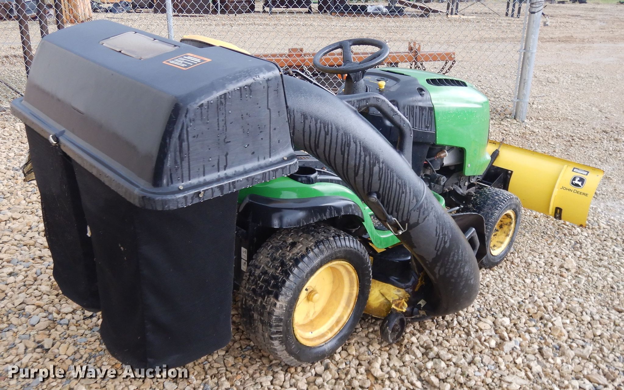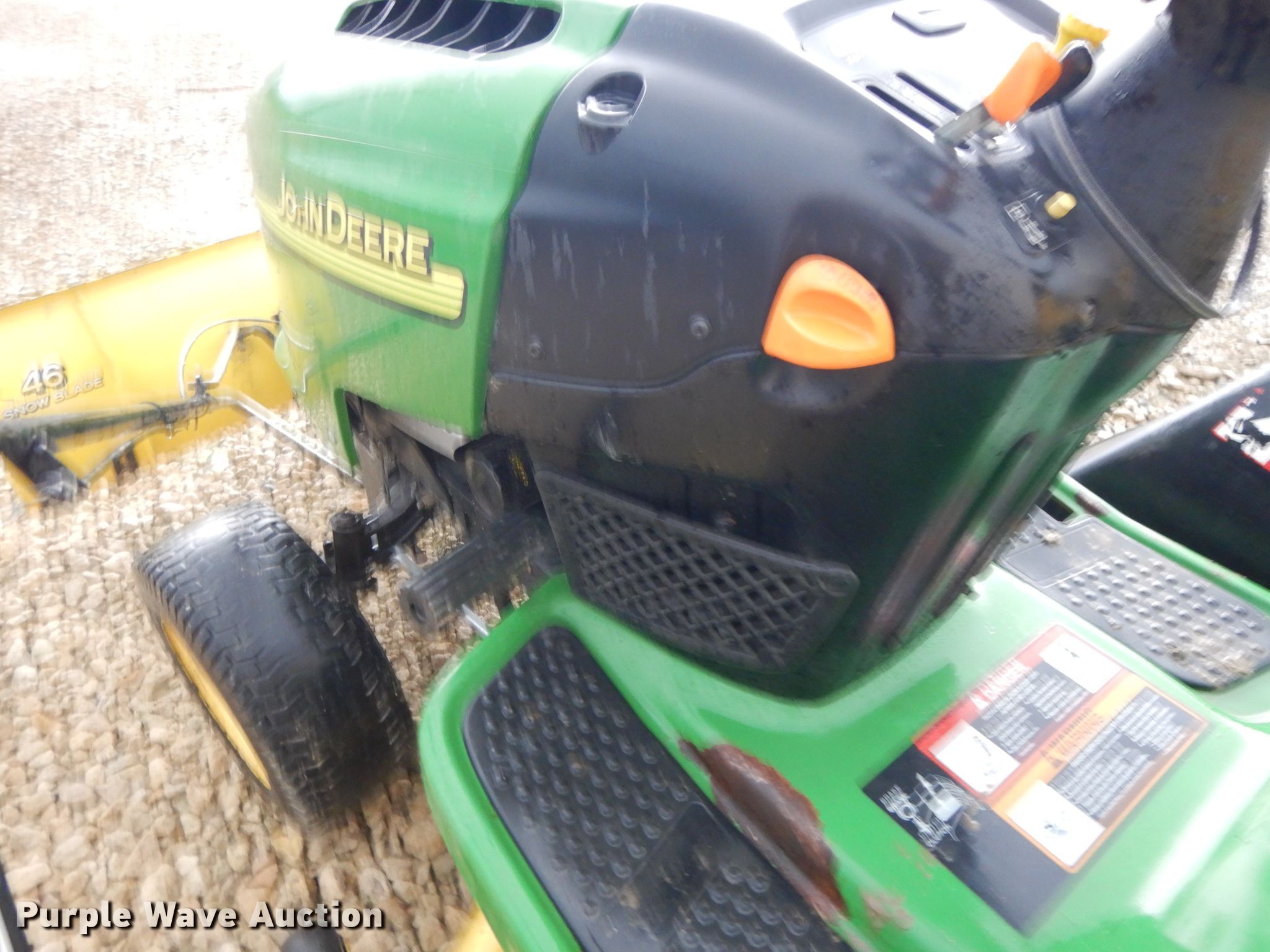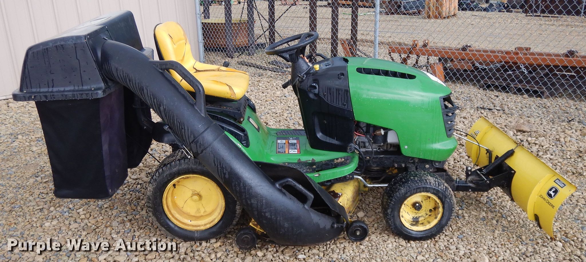 Purple Wave is selling a used Lawn Mower in Kansas. This item is a John Deere L120 lawn mower with the following: 701 hours on meter, 48" cut, Briggs & Stratton two cylinder gas engine, 20 HP, Hydrostatic transmission, John Deere 46"W front blade, John Deere mower deck, Grass bagger, 16x6.50-8 front tires, 22x9.50-12 rear tires, Serial GXL120A111571, Unit# 166882
