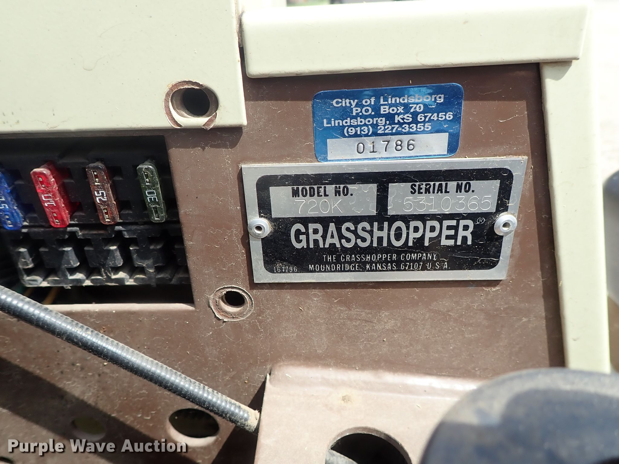 Grasshopper 720K ZTR lawn mower. 1,526 hours on meter, 52" cut, Kohler gas engine, Hydrostatic transmission, 21x11-8 tires, PTO engage issues, Serial 5310365. City of Lindsborg. Lindsborg, KS 67456