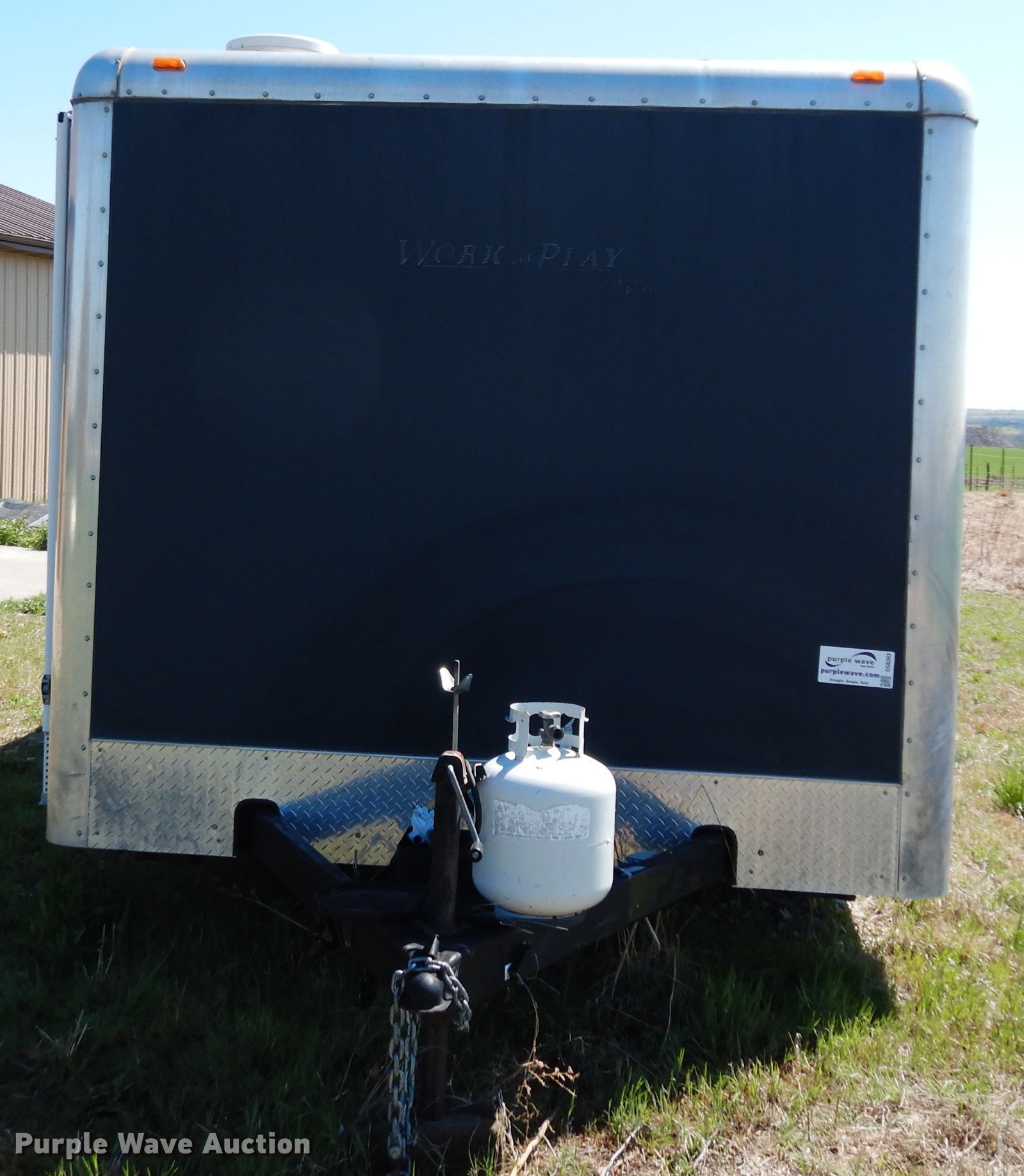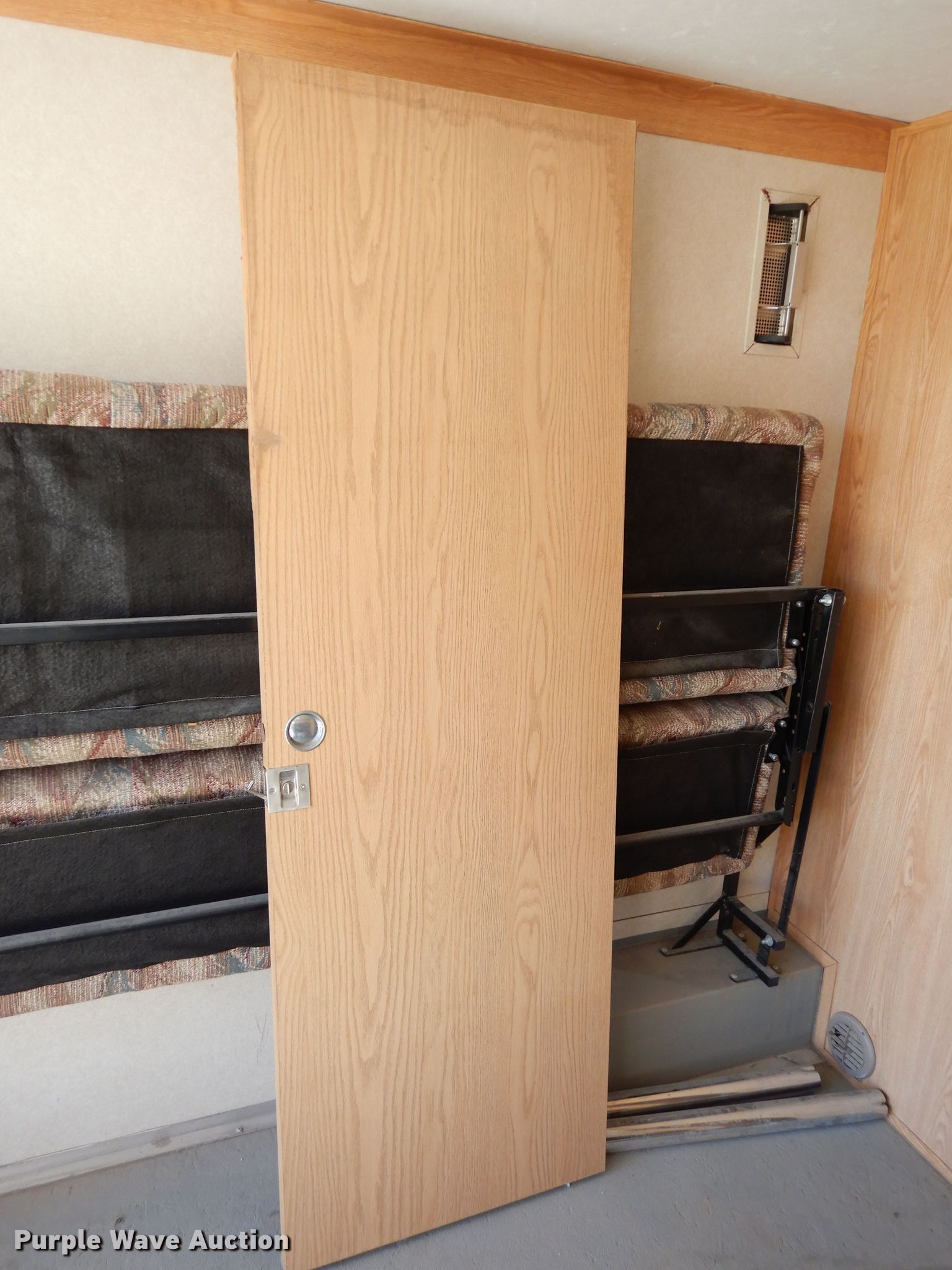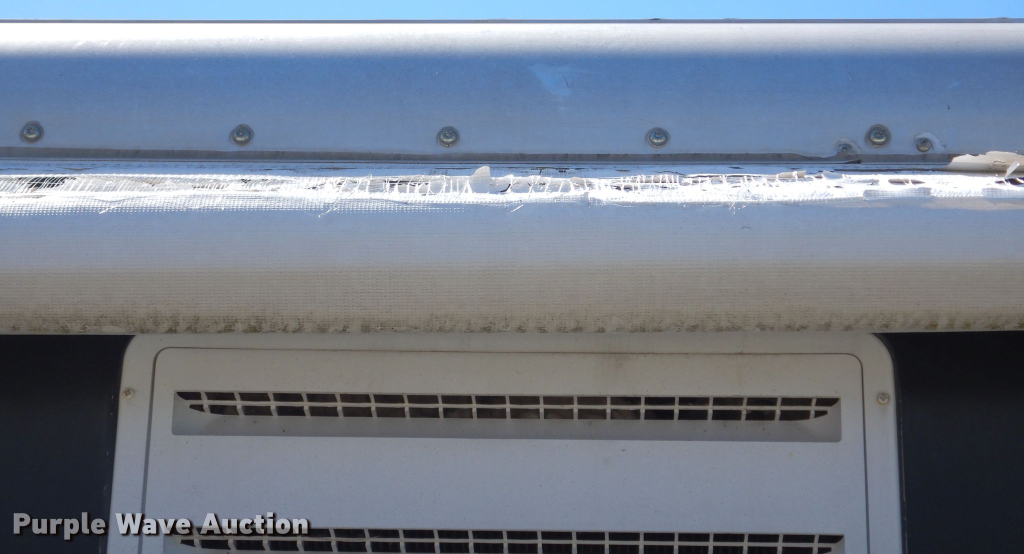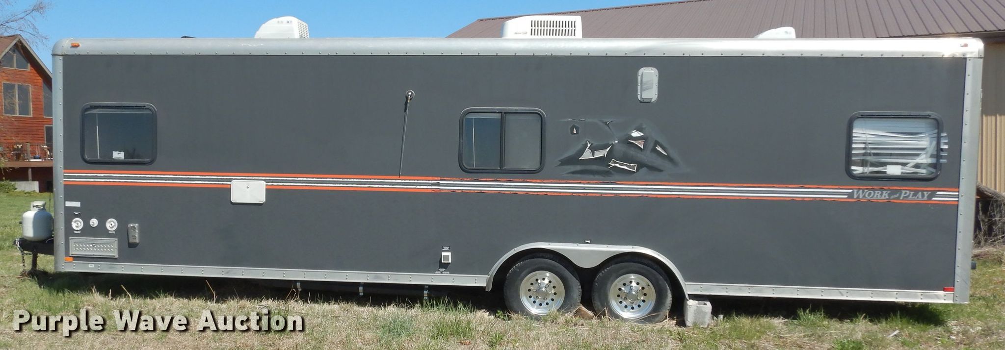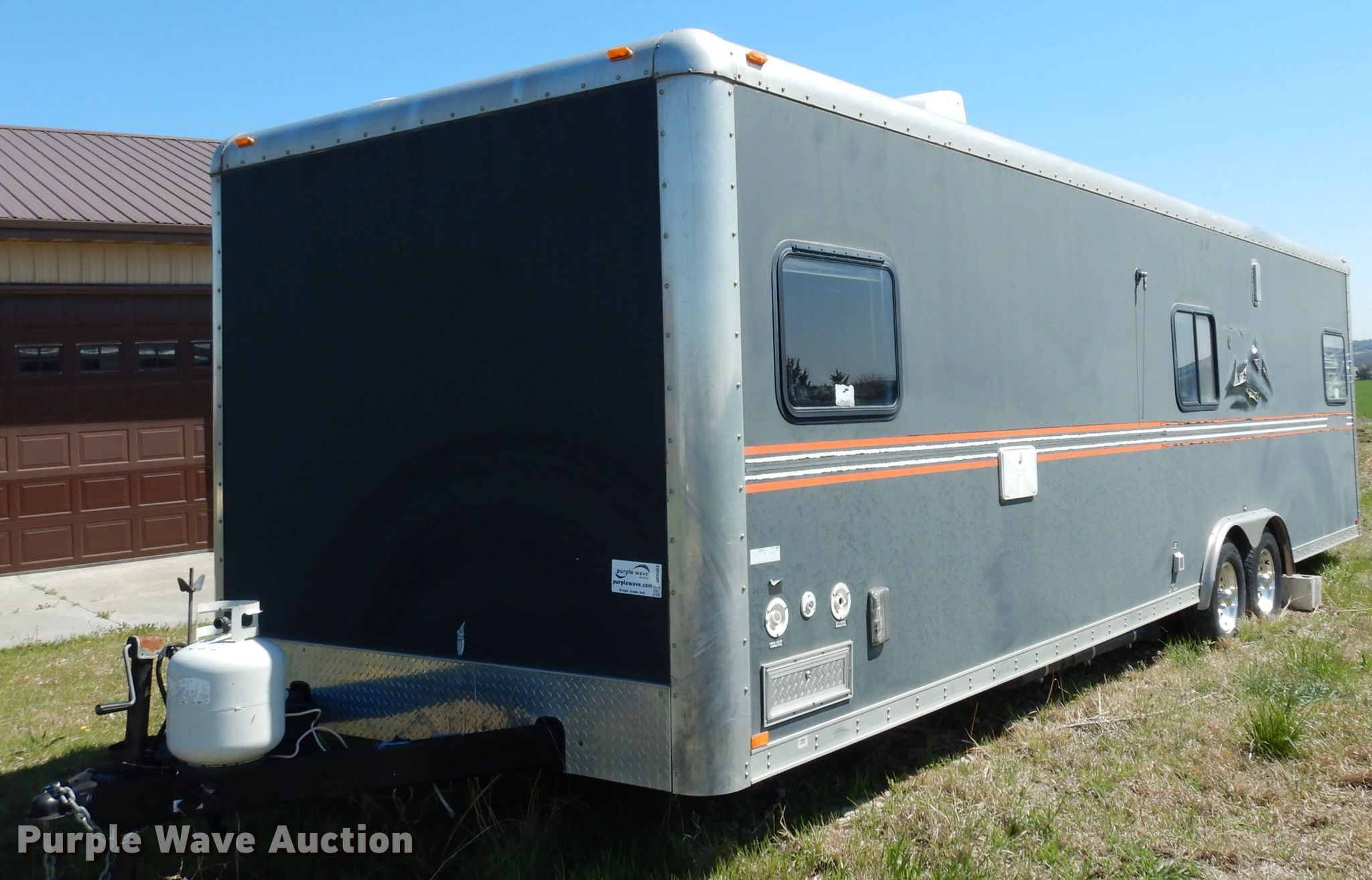 Purple Wave is selling a used Enclosed Cargo Trailer in Kansas. This item is a 2006 Forest River enclosed cargo trailer with the following: 27'L x 8'W x 88"H overall, Awning, Front living quarters, Bedroom, Bathroom, Toilet, Shower, Kitchen, Sink, Propane stove, Refrigerator/freezer, Microwave, Table with bench seats,, (2) fold up bunk beds, Turf carpet, Dual Therm roof top climate control unit, Vizio 24" television, Satellite dish, Radio, 2 5/16" ball hitch, Tandem axle, 225/75R15 tires, Screen door latch broken, Interior water damage, Awning worn