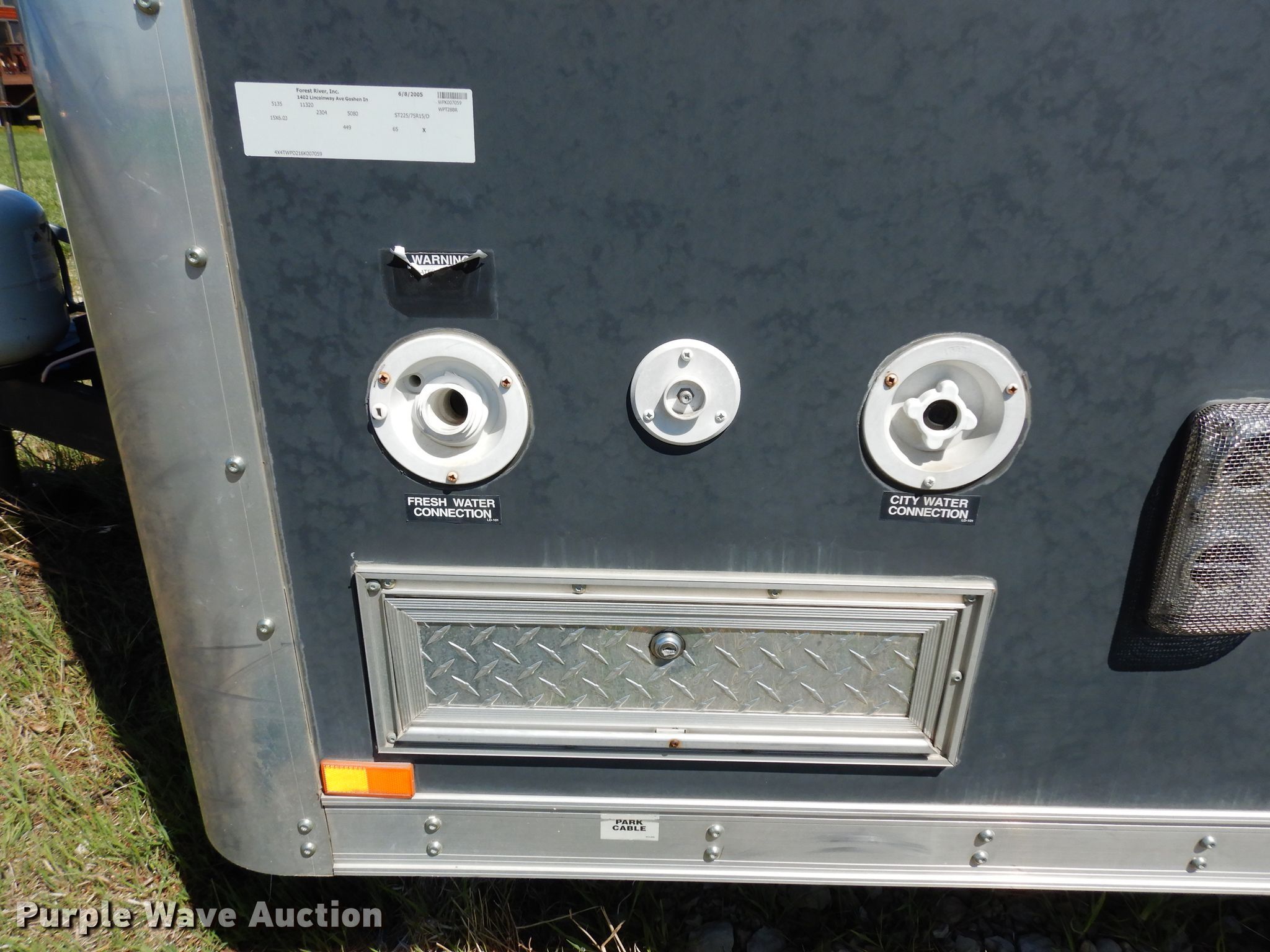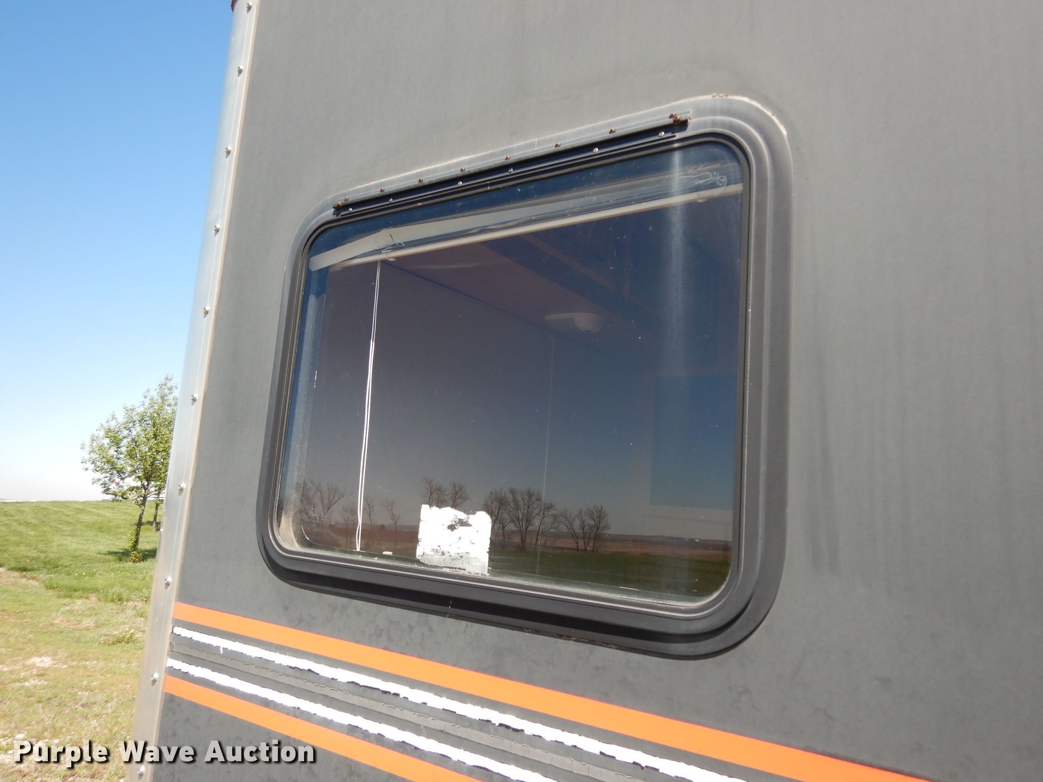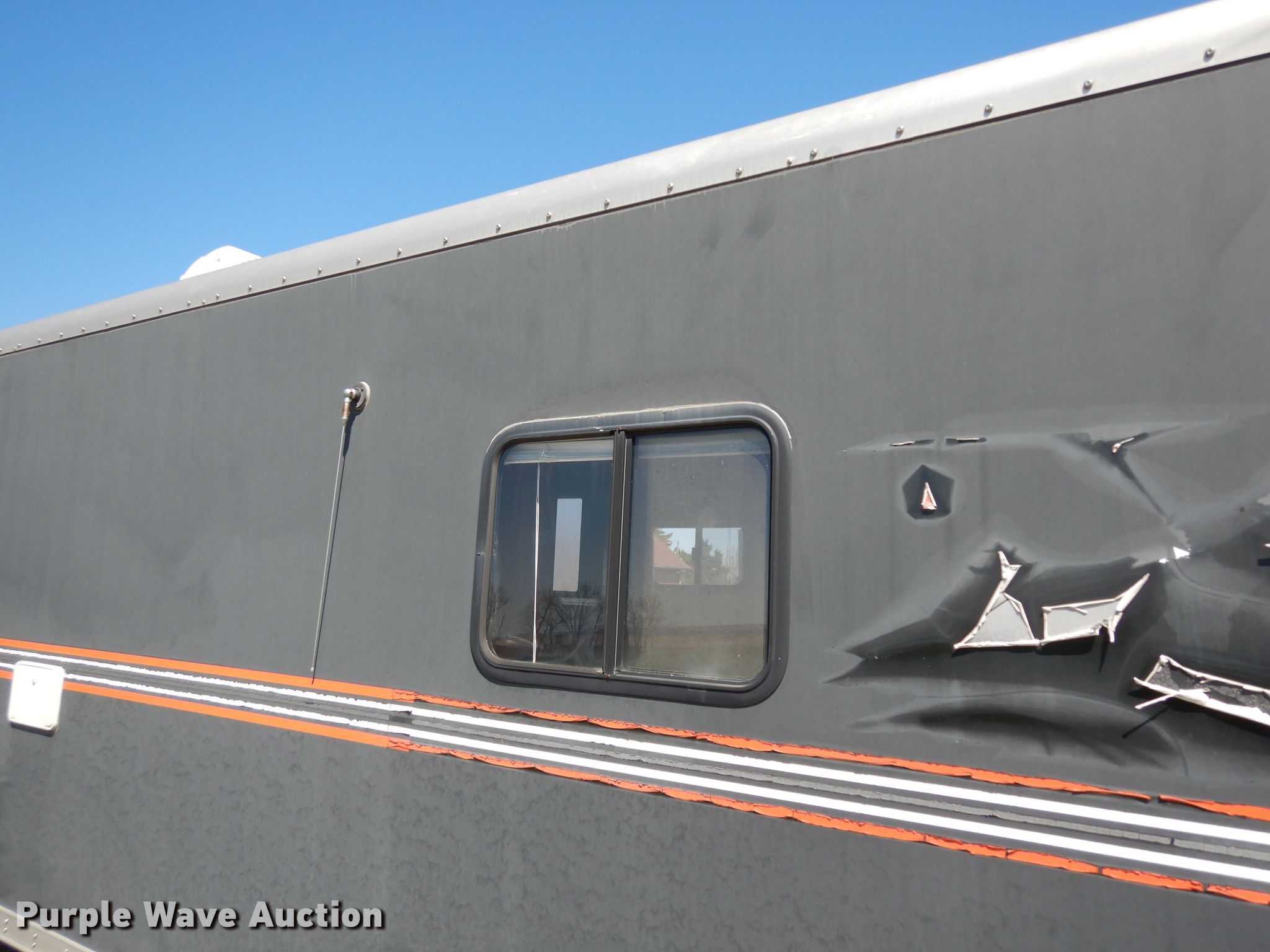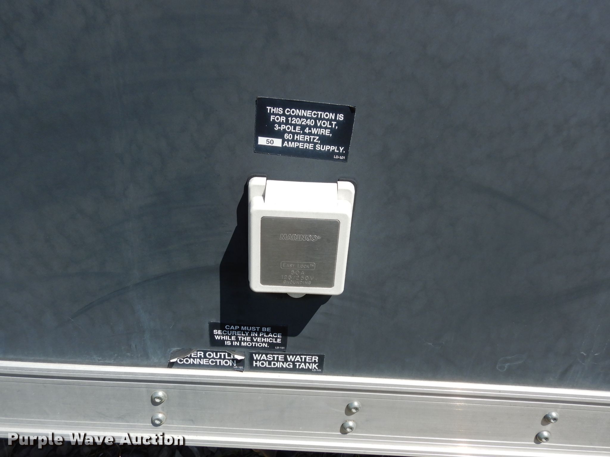 Purple Wave is selling a used Enclosed Cargo Trailer in Kansas. This item is a 2006 Forest River enclosed cargo trailer with the following: 27'L x 8'W x 88"H overall, Awning, Front living quarters, Bedroom, Bathroom, Toilet, Shower, Kitchen, Sink, Propane stove, Refrigerator/freezer, Microwave, Table with bench seats,, (2) fold up bunk beds, Turf carpet, Dual Therm roof top climate control unit, Vizio 24" television, Satellite dish, Radio, 2 5/16" ball hitch, Tandem axle, 225/75R15 tires, Screen door latch broken, Interior water damage, Awning worn