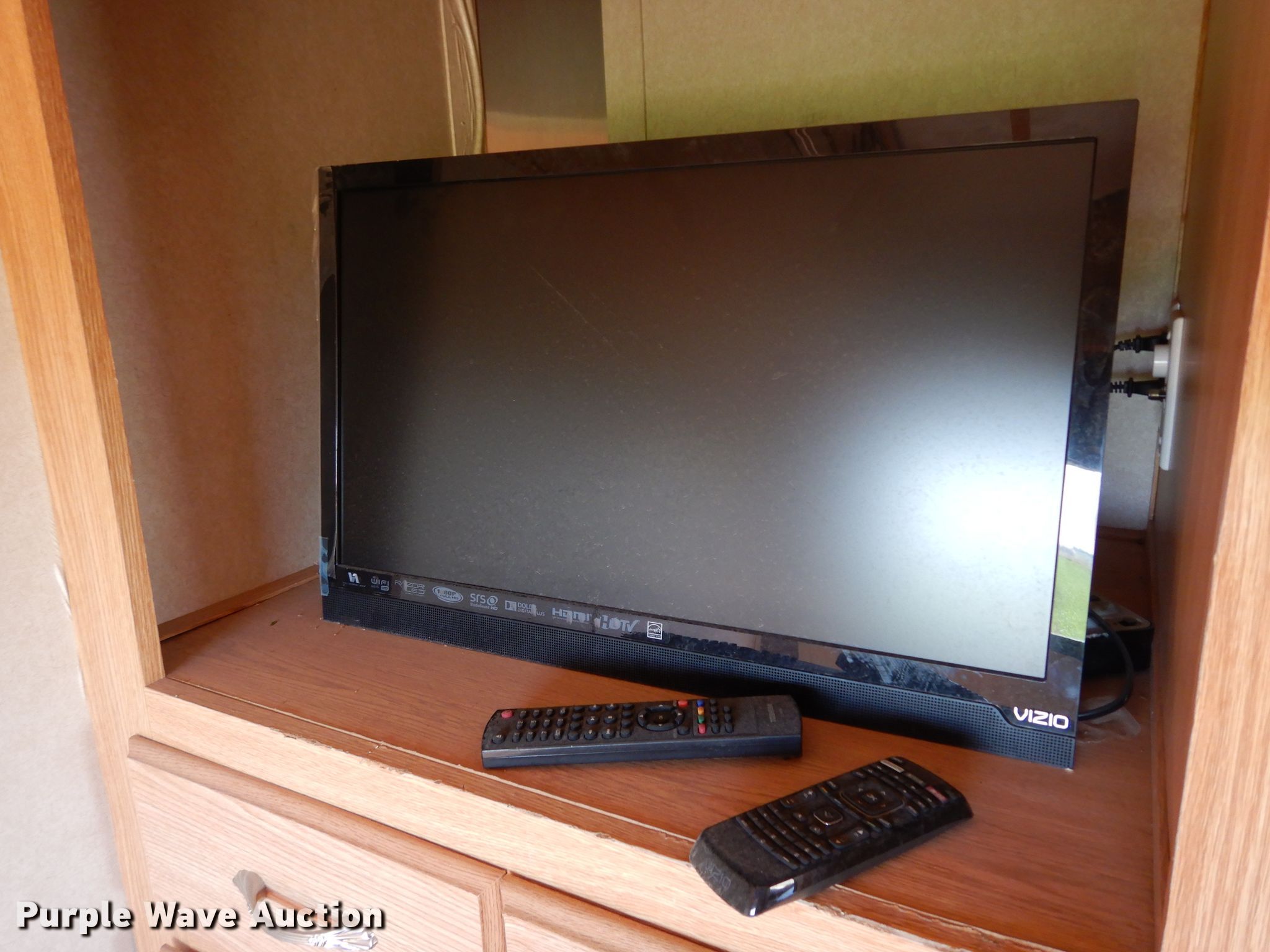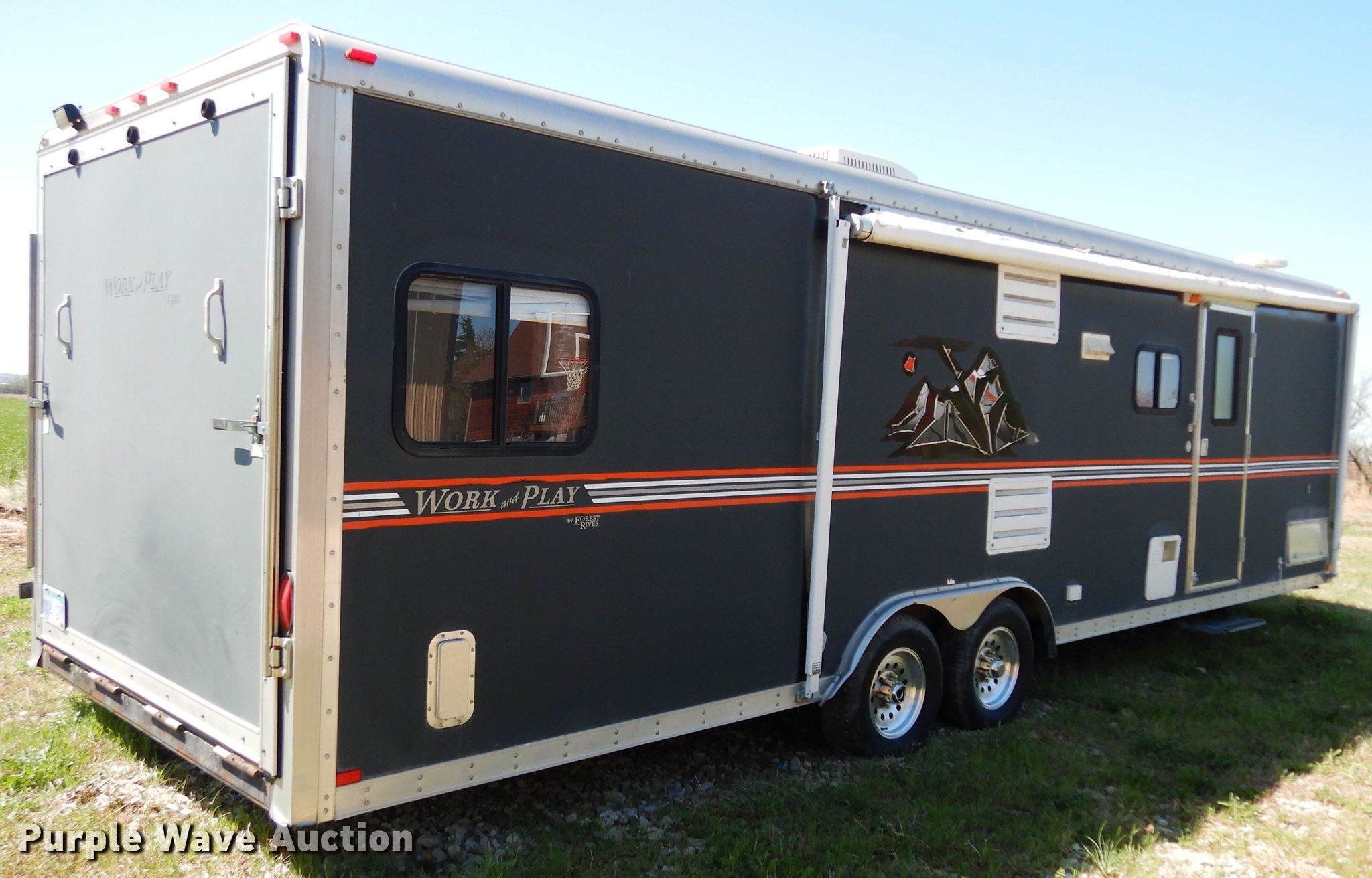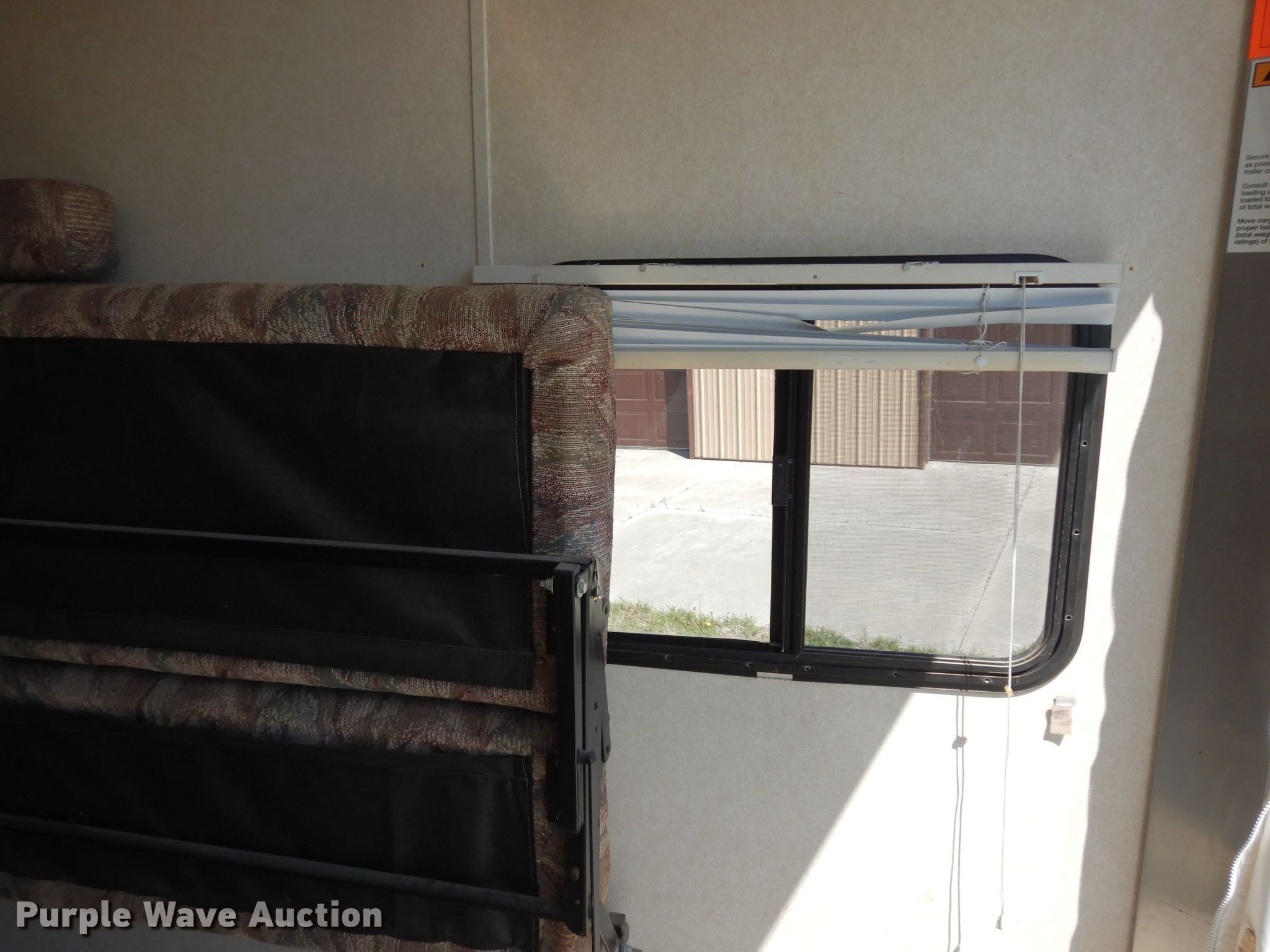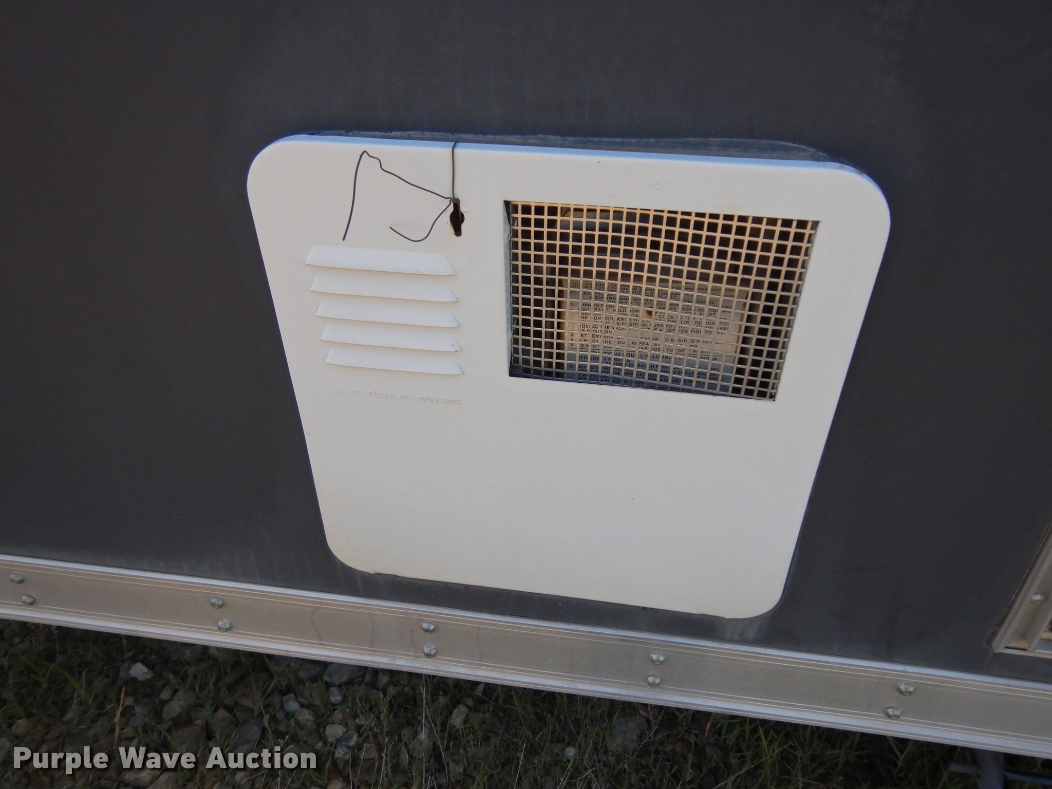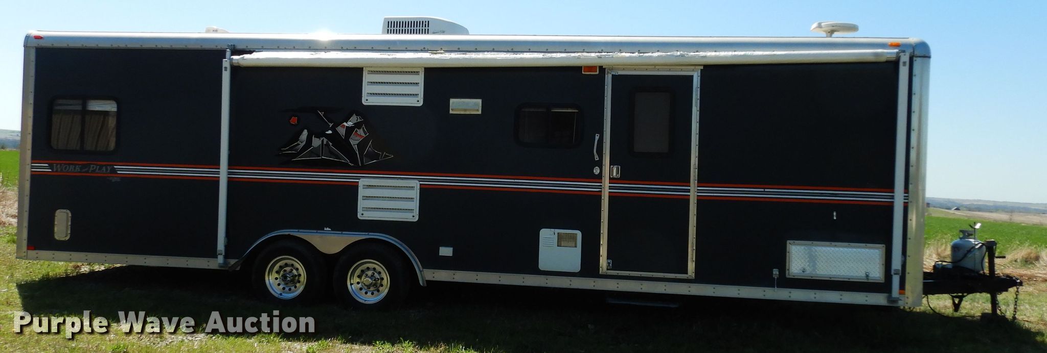 Purple Wave is selling a used Enclosed Cargo Trailer in Kansas. This item is a 2006 Forest River enclosed cargo trailer with the following: 27'L x 8'W x 88"H overall, Awning, Front living quarters, Bedroom, Bathroom, Toilet, Shower, Kitchen, Sink, Propane stove, Refrigerator/freezer, Microwave, Table with bench seats,, (2) fold up bunk beds, Turf carpet, Dual Therm roof top climate control unit, Vizio 24" television, Satellite dish, Radio, 2 5/16" ball hitch, Tandem axle, 225/75R15 tires, Screen door latch broken, Interior water damage, Awning worn