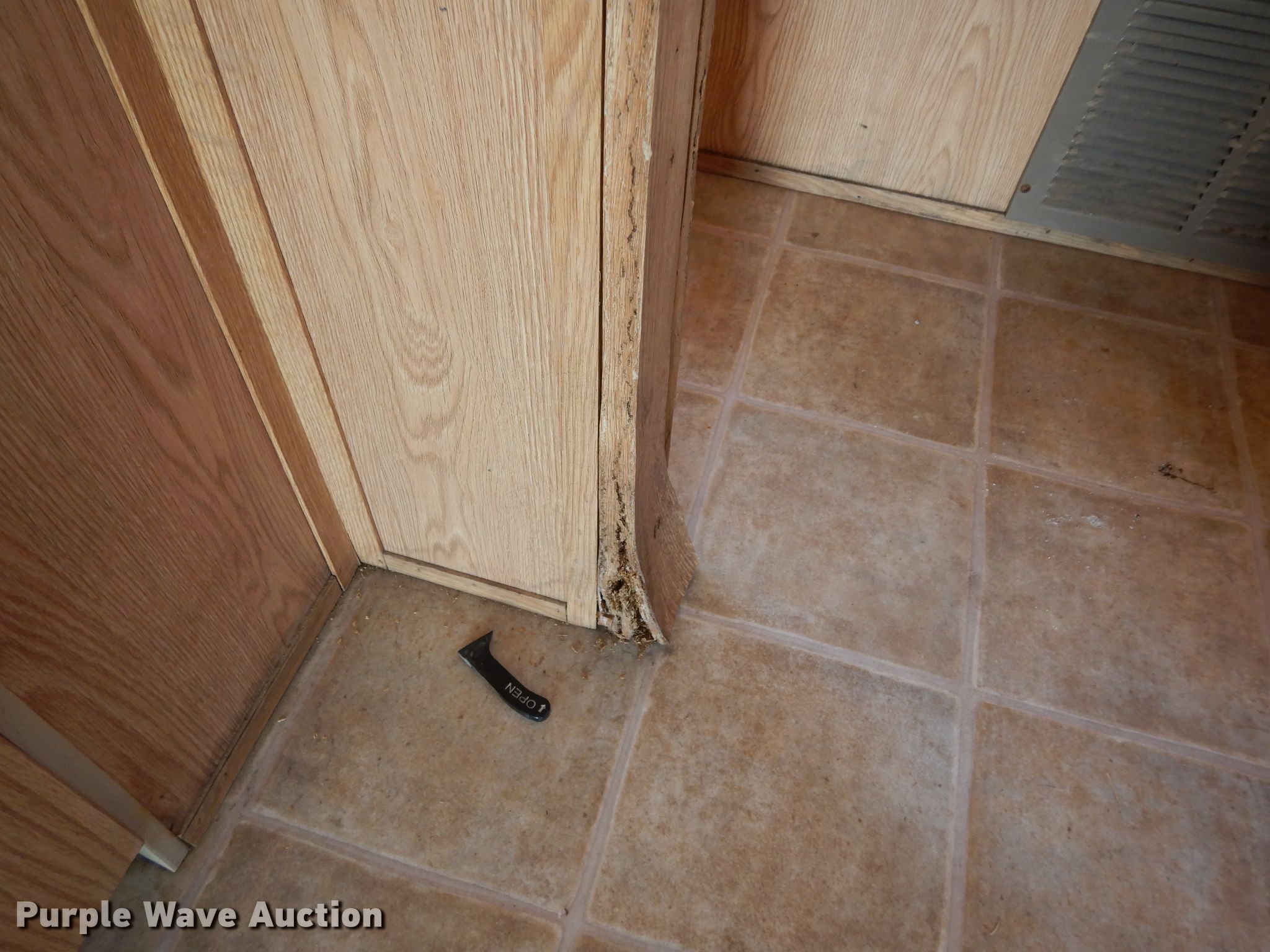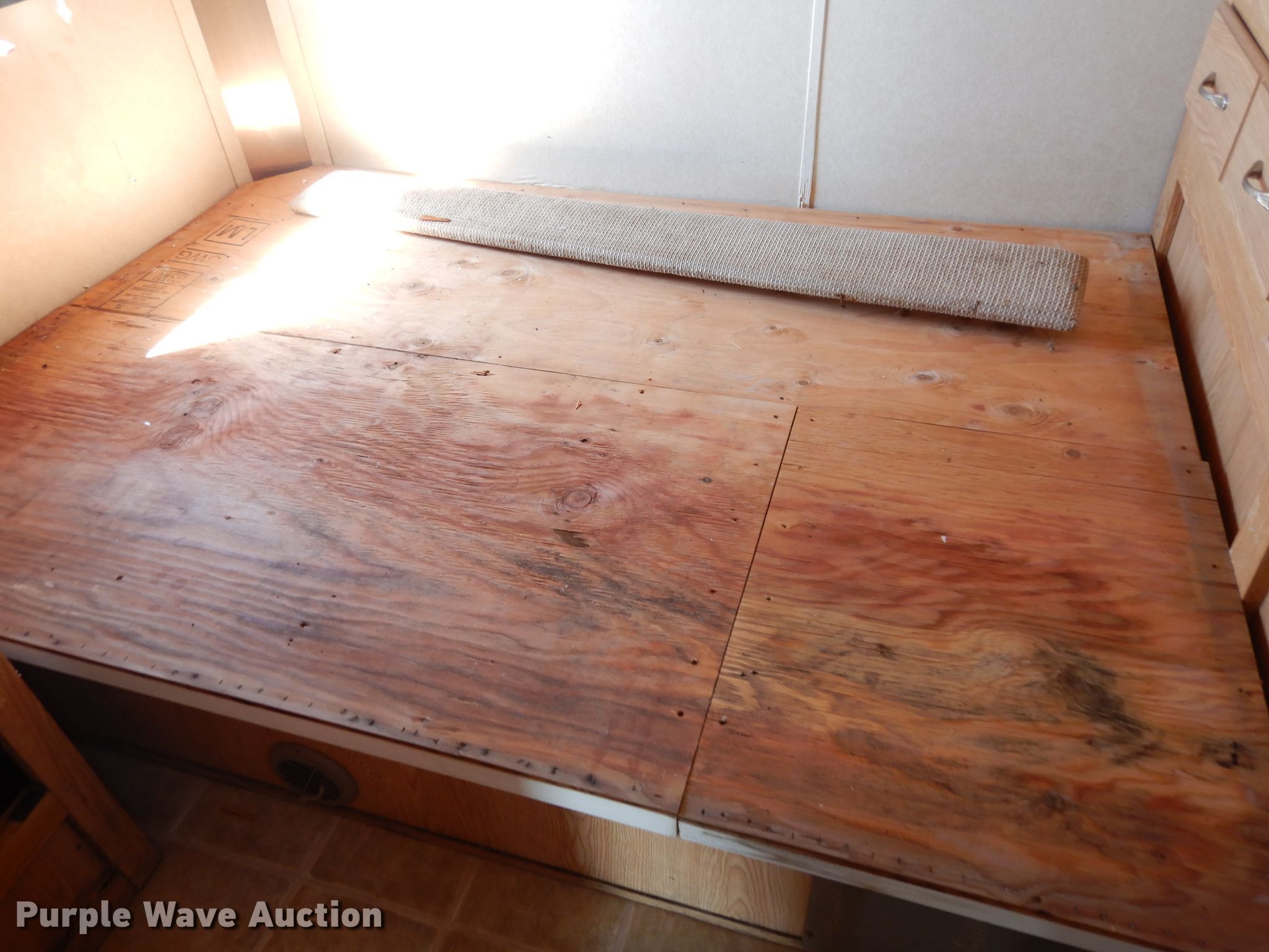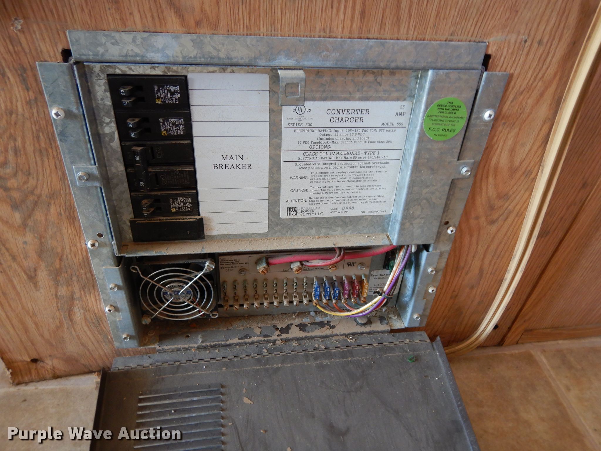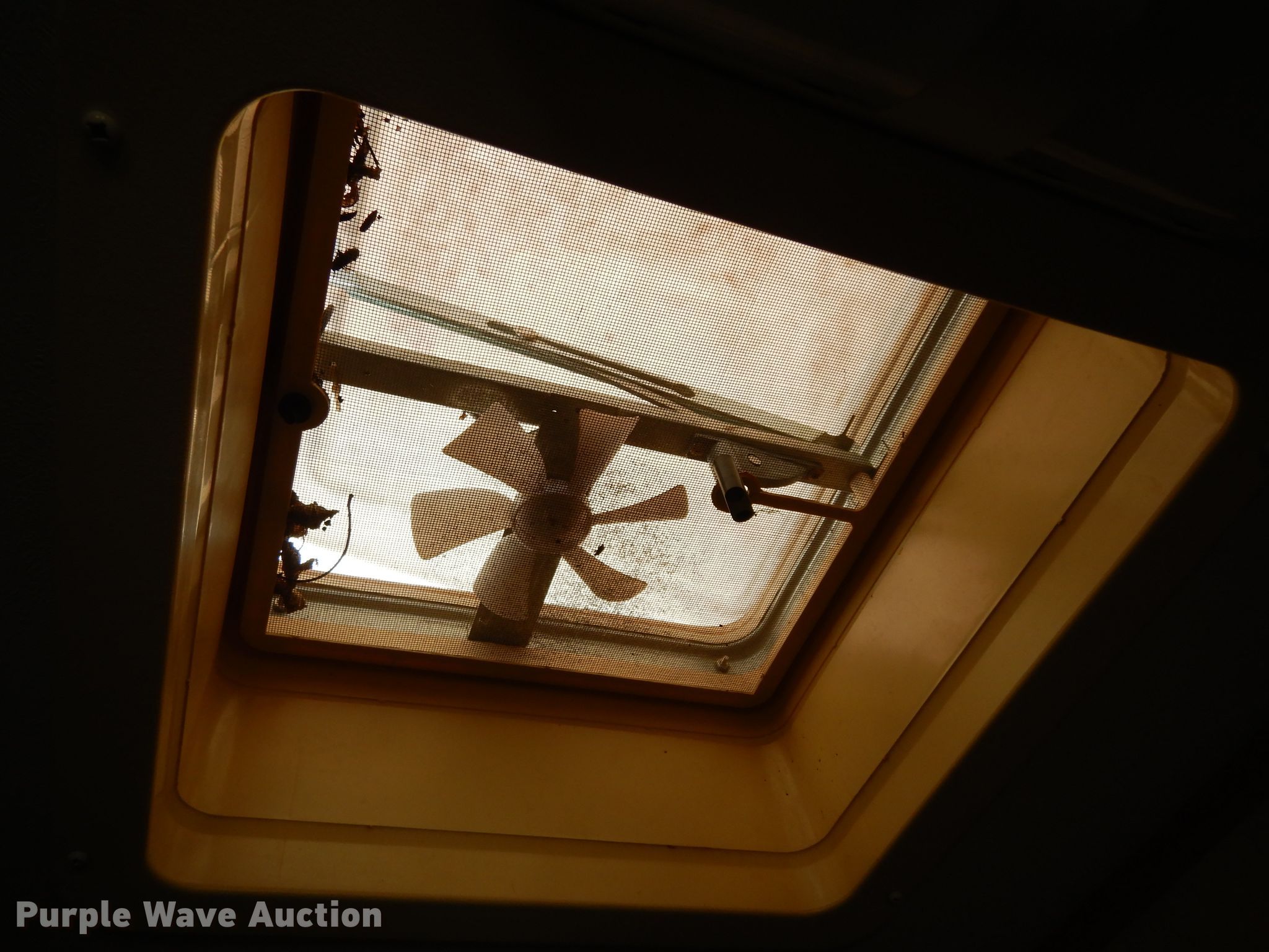 Purple Wave is selling a used Enclosed Cargo Trailer in Kansas. This item is a 2006 Forest River enclosed cargo trailer with the following: 27'L x 8'W x 88"H overall, Awning, Front living quarters, Bedroom, Bathroom, Toilet, Shower, Kitchen, Sink, Propane stove, Refrigerator/freezer, Microwave, Table with bench seats,, (2) fold up bunk beds, Turf carpet, Dual Therm roof top climate control unit, Vizio 24" television, Satellite dish, Radio, 2 5/16" ball hitch, Tandem axle, 225/75R15 tires, Screen door latch broken, Interior water damage, Awning worn