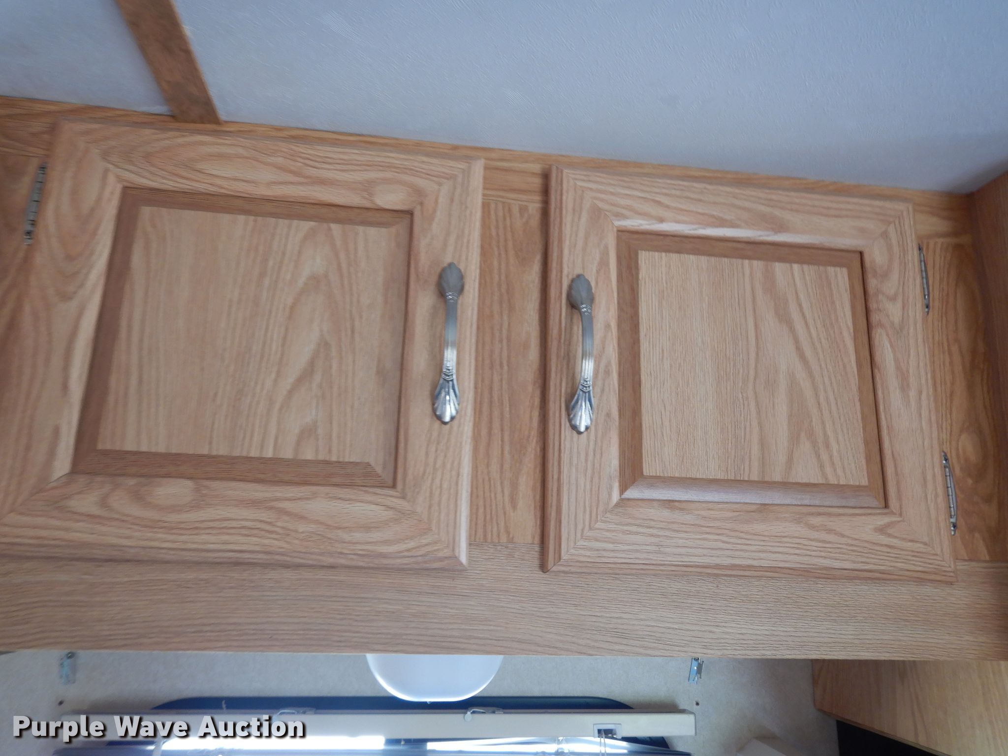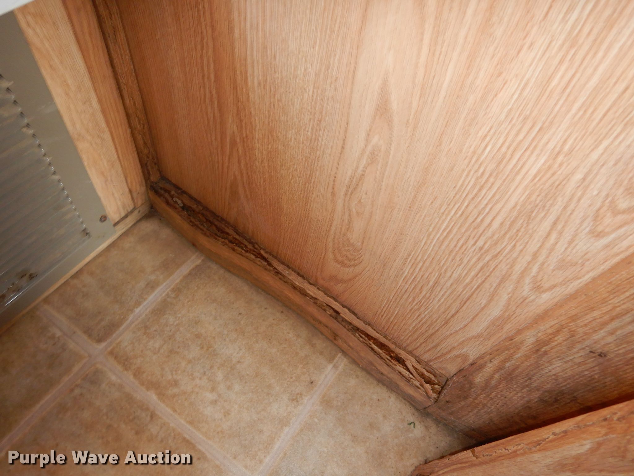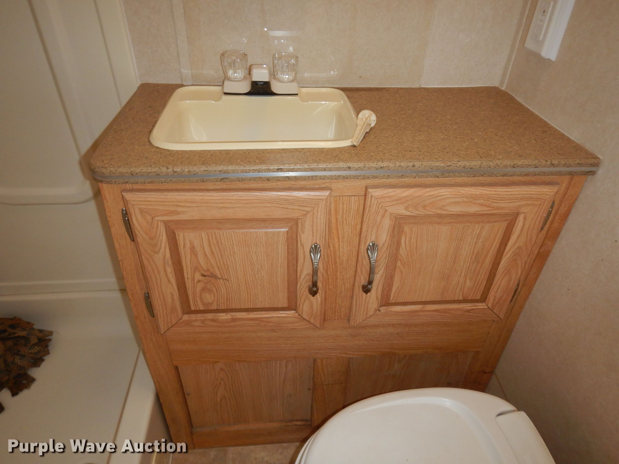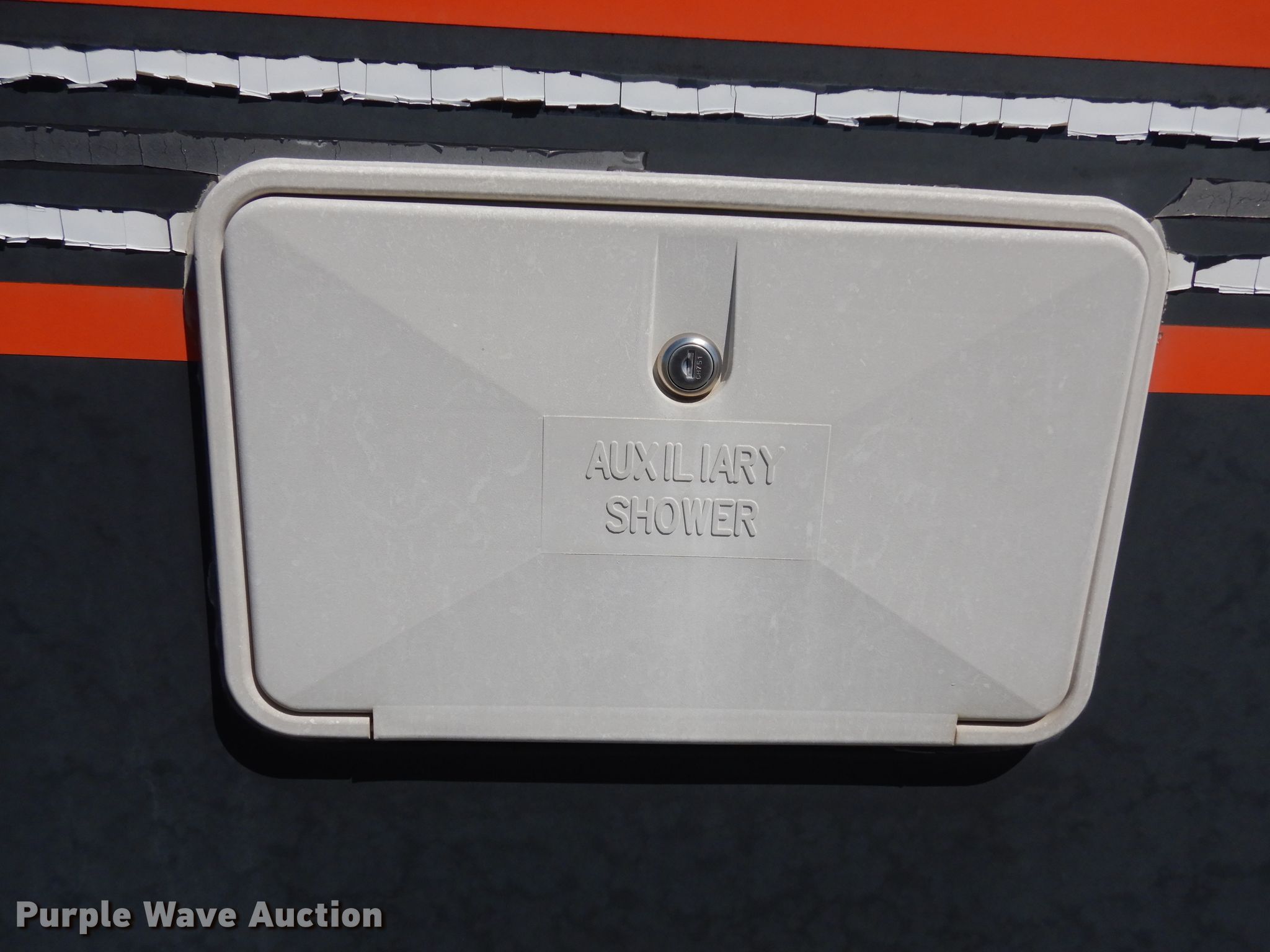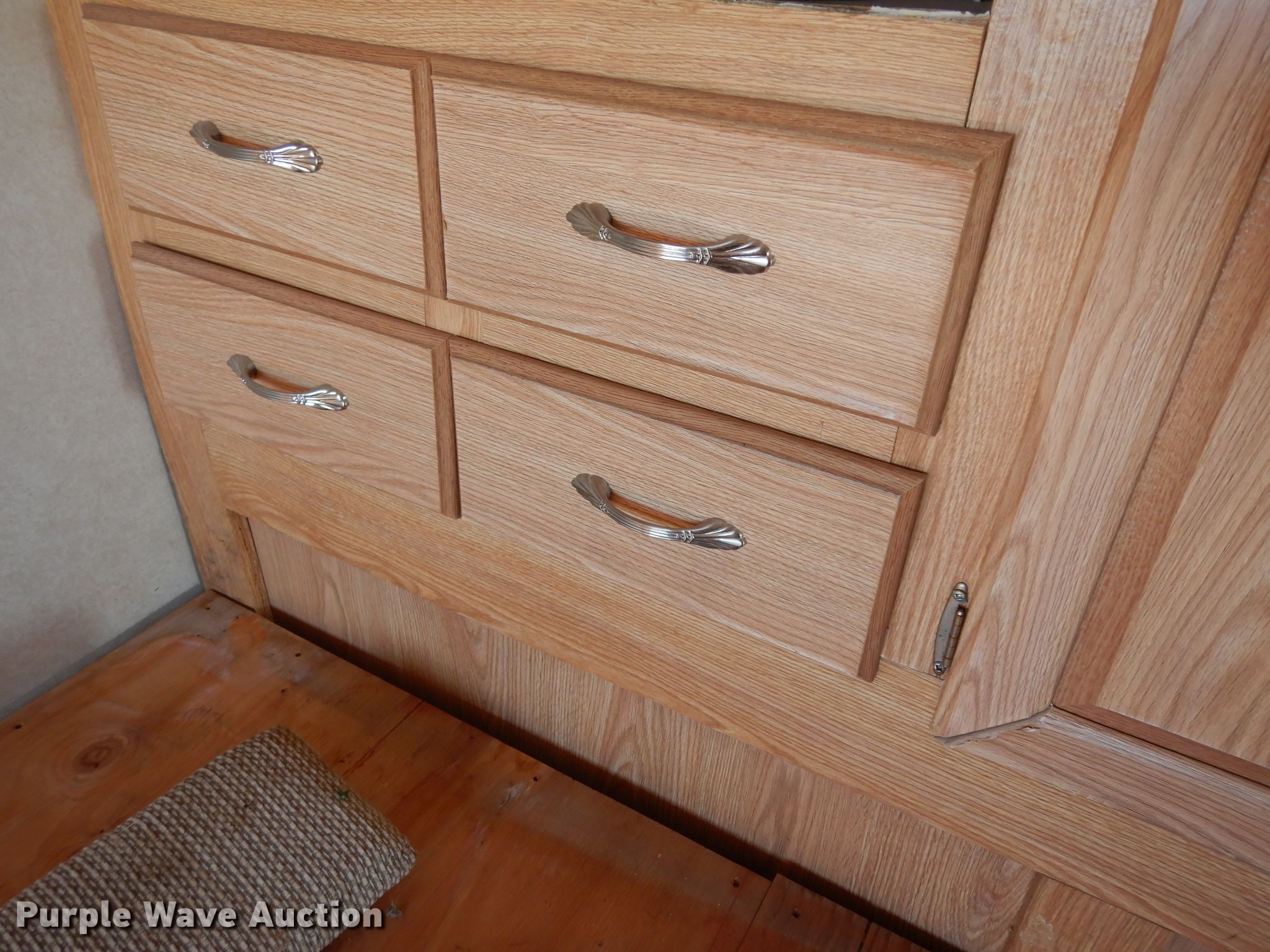 Purple Wave is selling a used Enclosed Cargo Trailer in Kansas. This item is a 2006 Forest River enclosed cargo trailer with the following: 27'L x 8'W x 88"H overall, Awning, Front living quarters, Bedroom, Bathroom, Toilet, Shower, Kitchen, Sink, Propane stove, Refrigerator/freezer, Microwave, Table with bench seats,, (2) fold up bunk beds, Turf carpet, Dual Therm roof top climate control unit, Vizio 24" television, Satellite dish, Radio, 2 5/16" ball hitch, Tandem axle, 225/75R15 tires, Screen door latch broken, Interior water damage, Awning worn