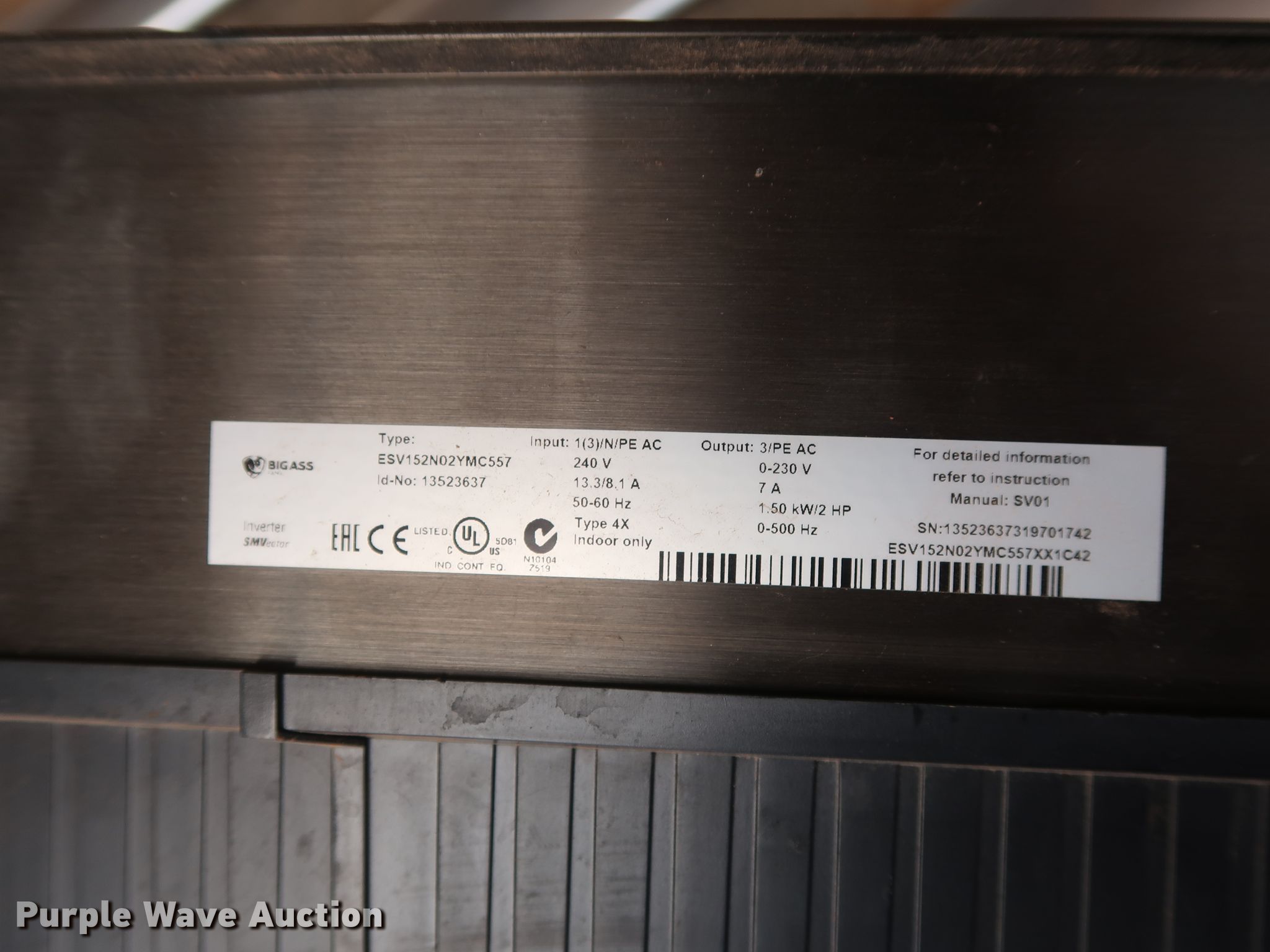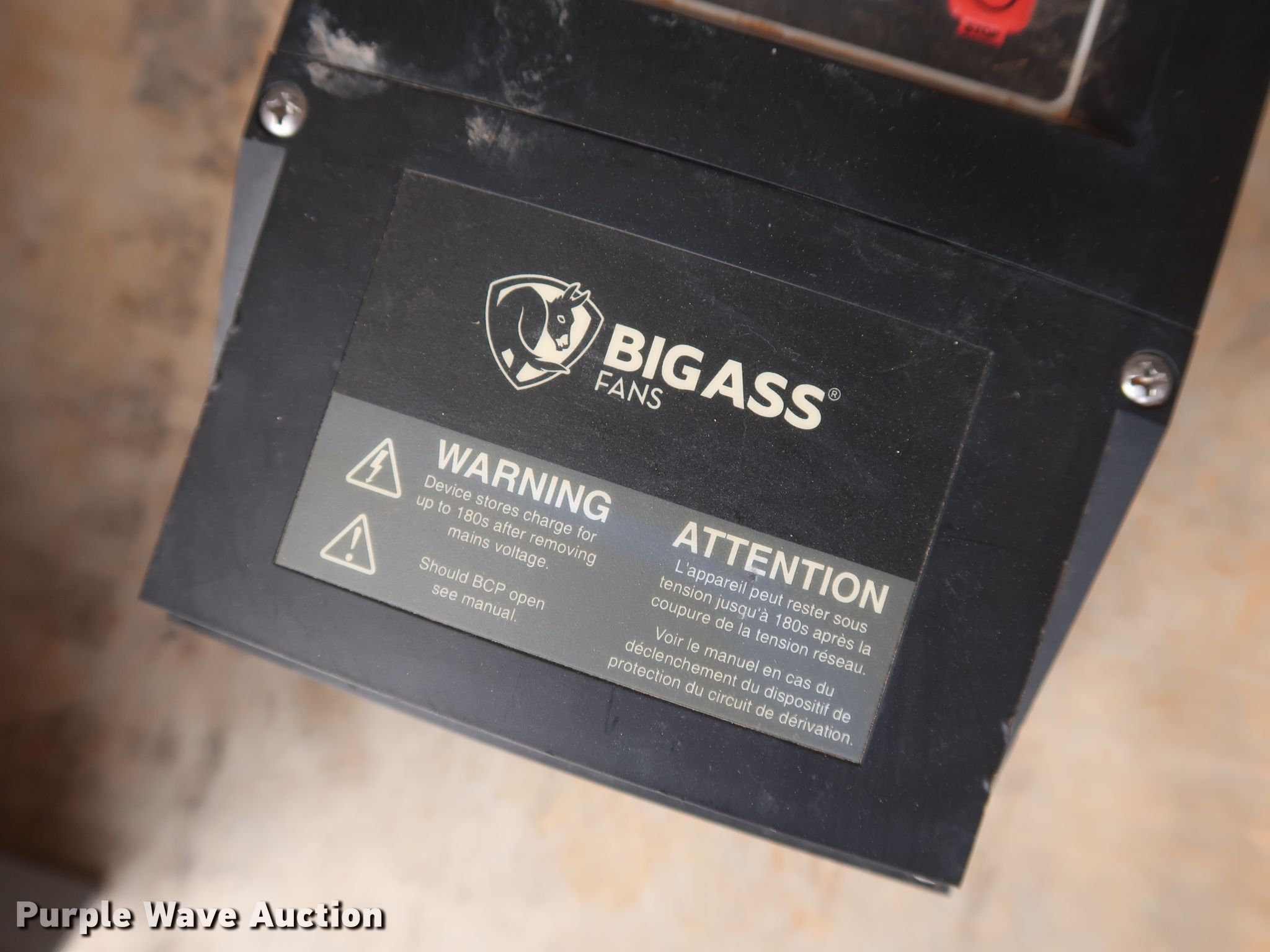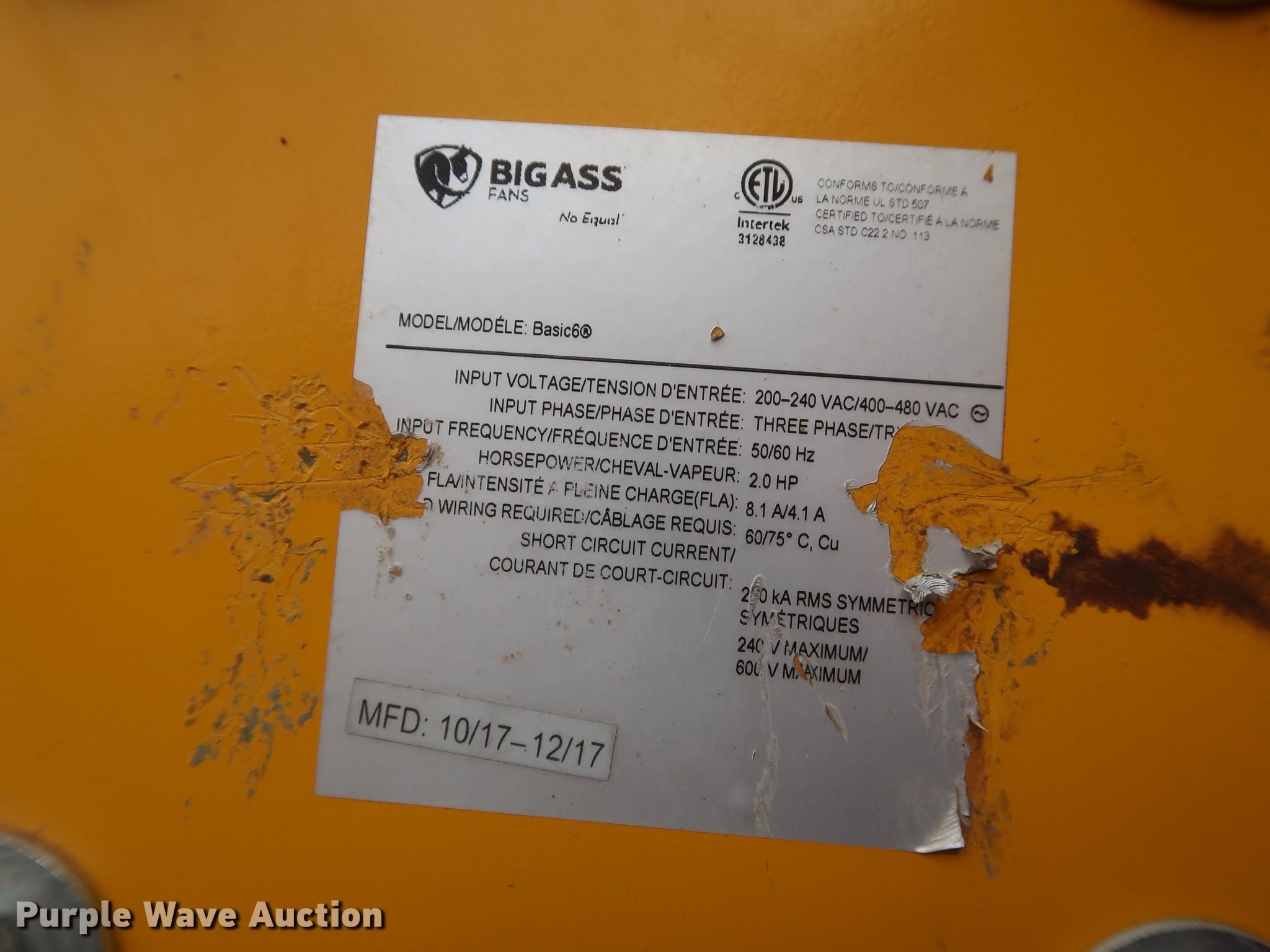 Purple Wave is selling a used Building Materials in Oklahoma. This item is a Big Ass Basic 6 ceiling fan with the following: 200-240VAC/400-480VAC, Three phase, 2.0 HP, 16' diameter, Digital control station, Unused
