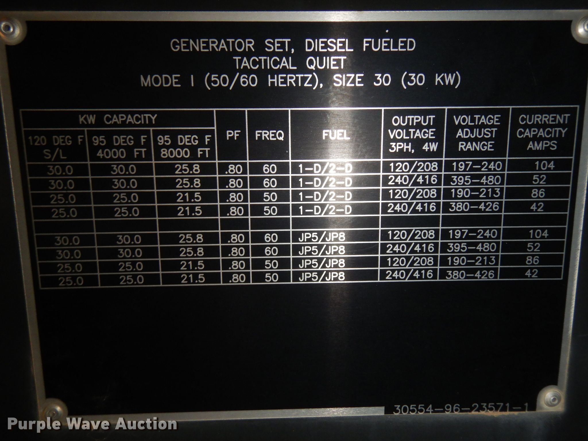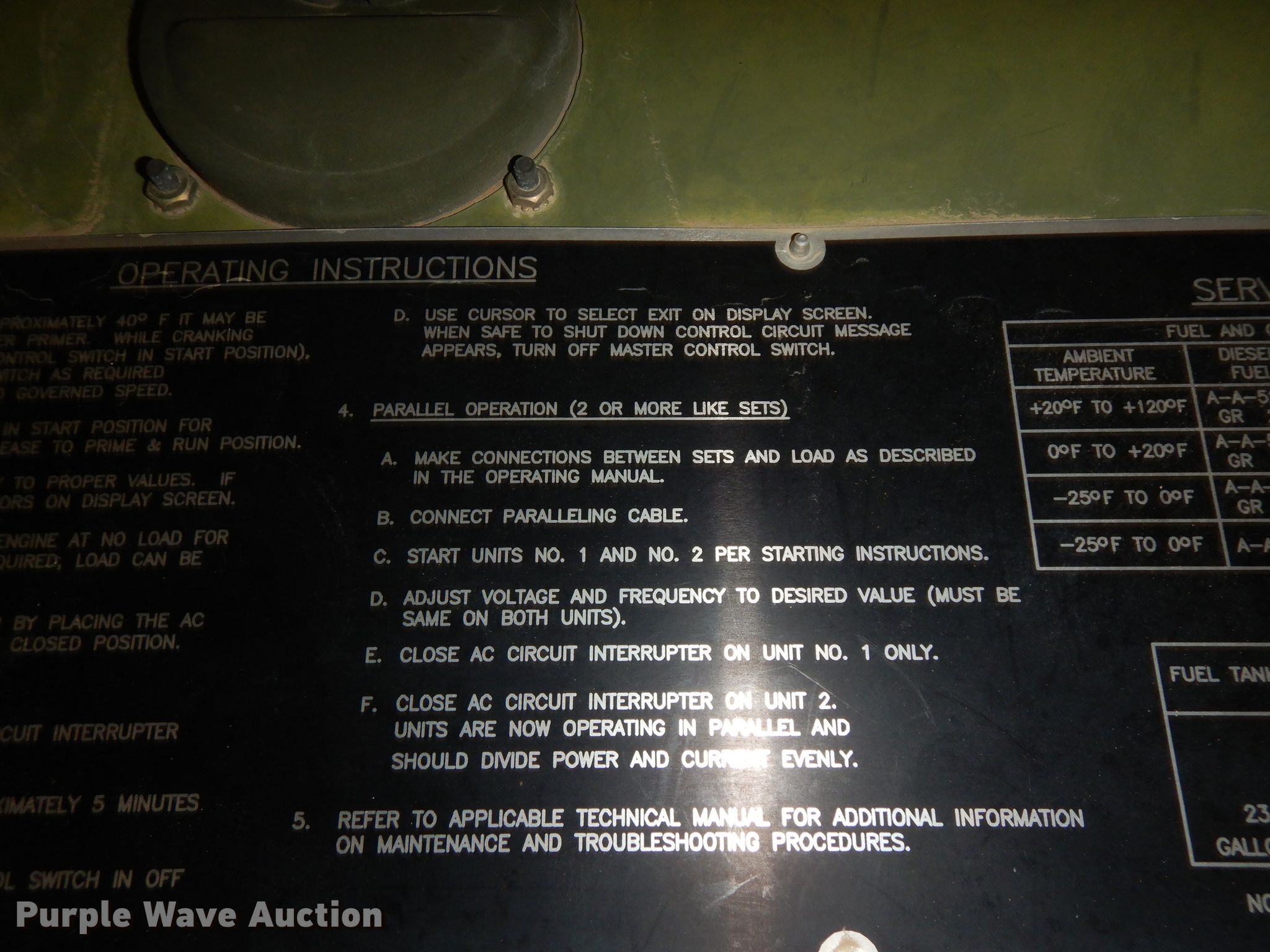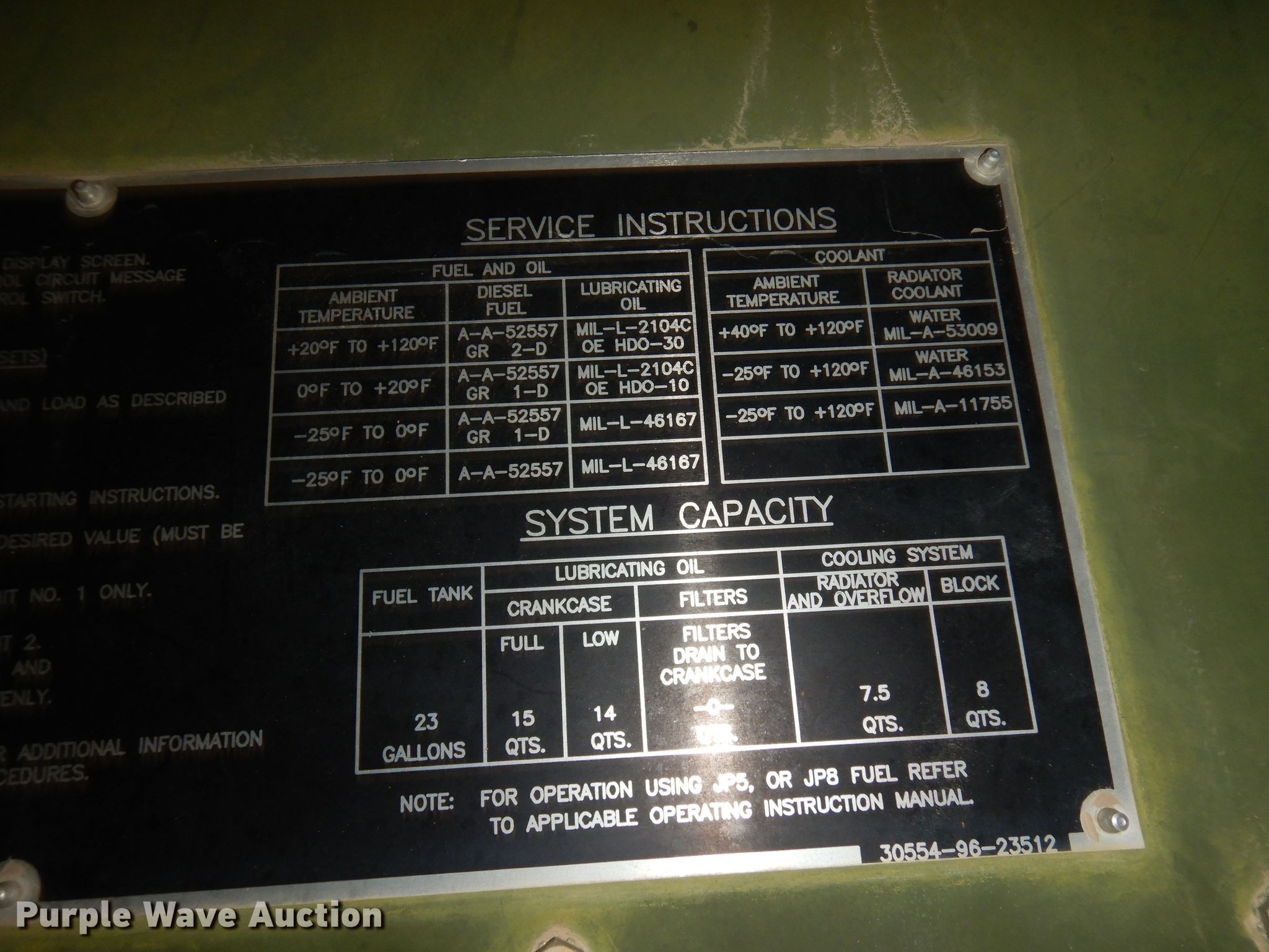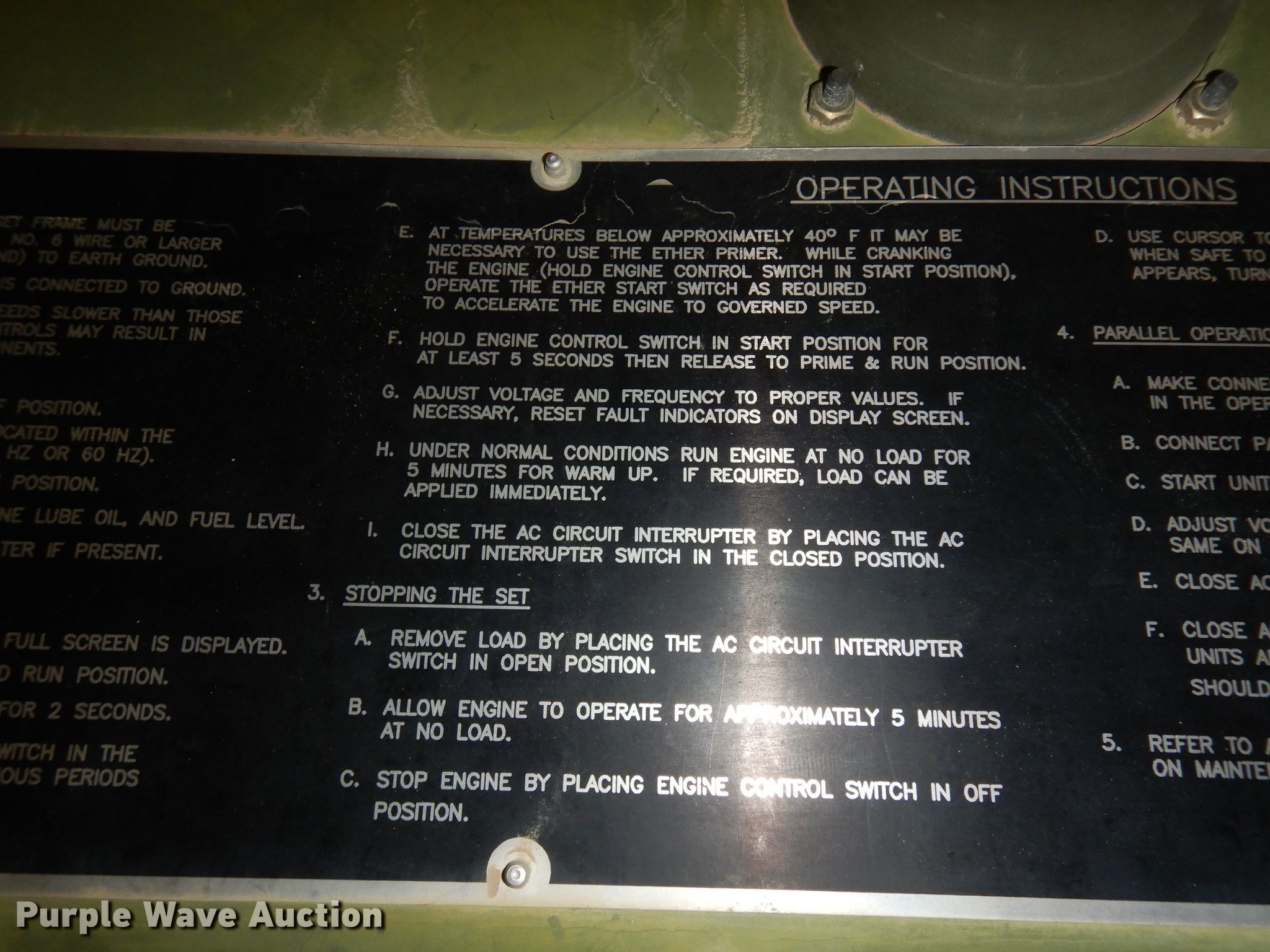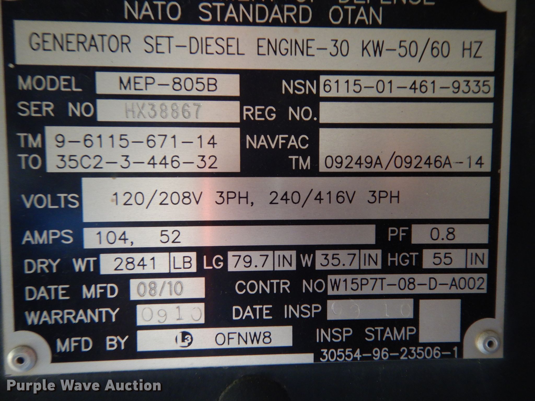 Purple Wave is selling a used Generator Set in Texas. This item is a 2010 generator with the following: Model MEP-805B, 32 hours on meter, John Deere 4045TF151 4.5L four cylinder diesel engine, Serial PE4045T795489, 30 kW, Three phase, Electric start, Fuel tank, Skid mounted, Dead crank switch, Trailer not included, Serial HX38867