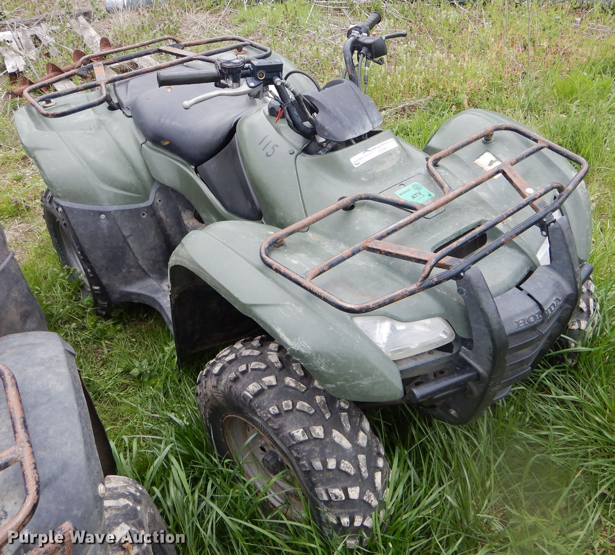 Purple Wave is selling a used ATV in Missouri. This item is a 2007 Honda ATV with the following: Single cylinder gas engine, Five speed manual transmission, Electric start, 26x8-12 front tires, 24x10-11 rear tires, Unit# 115