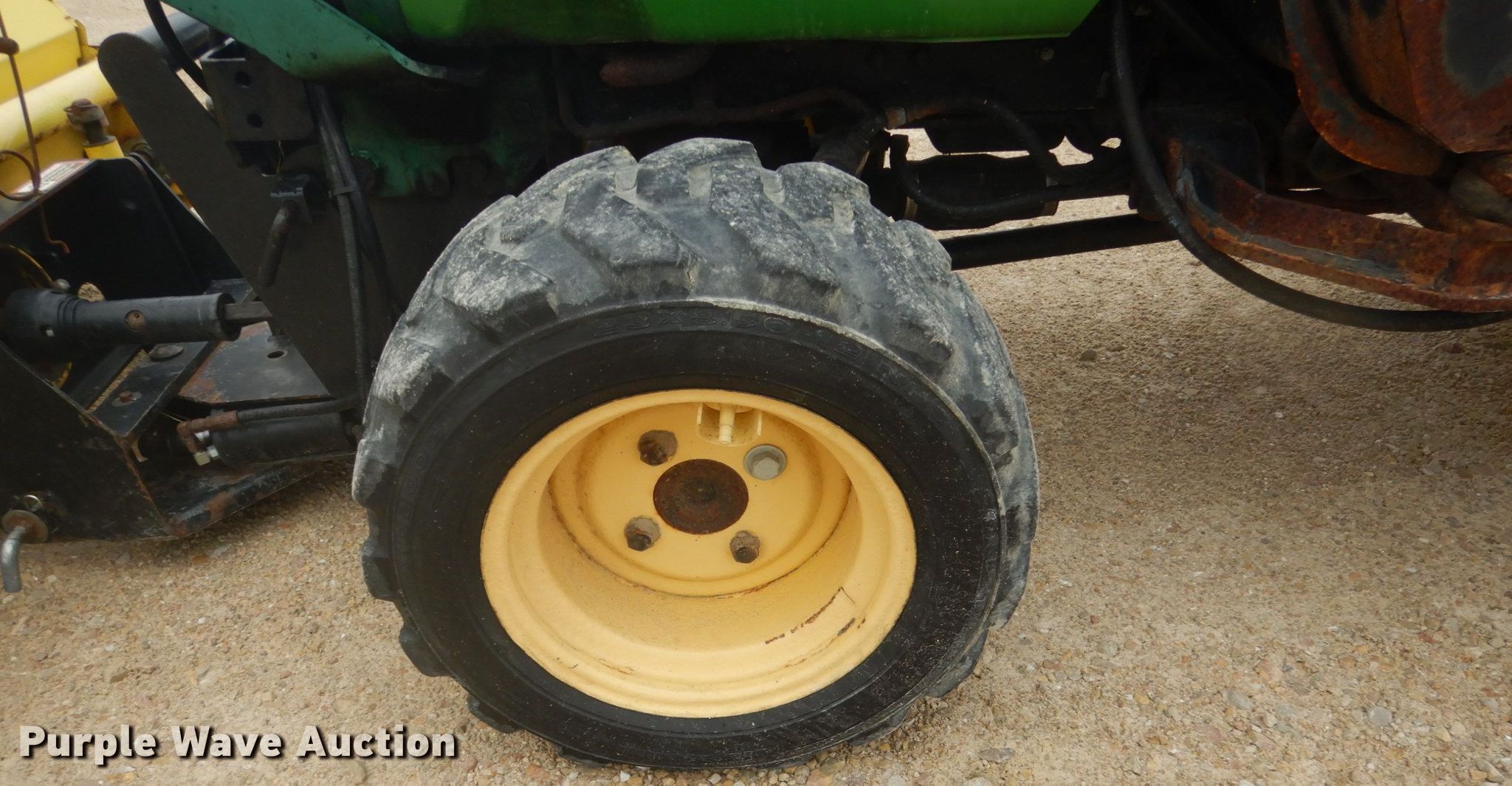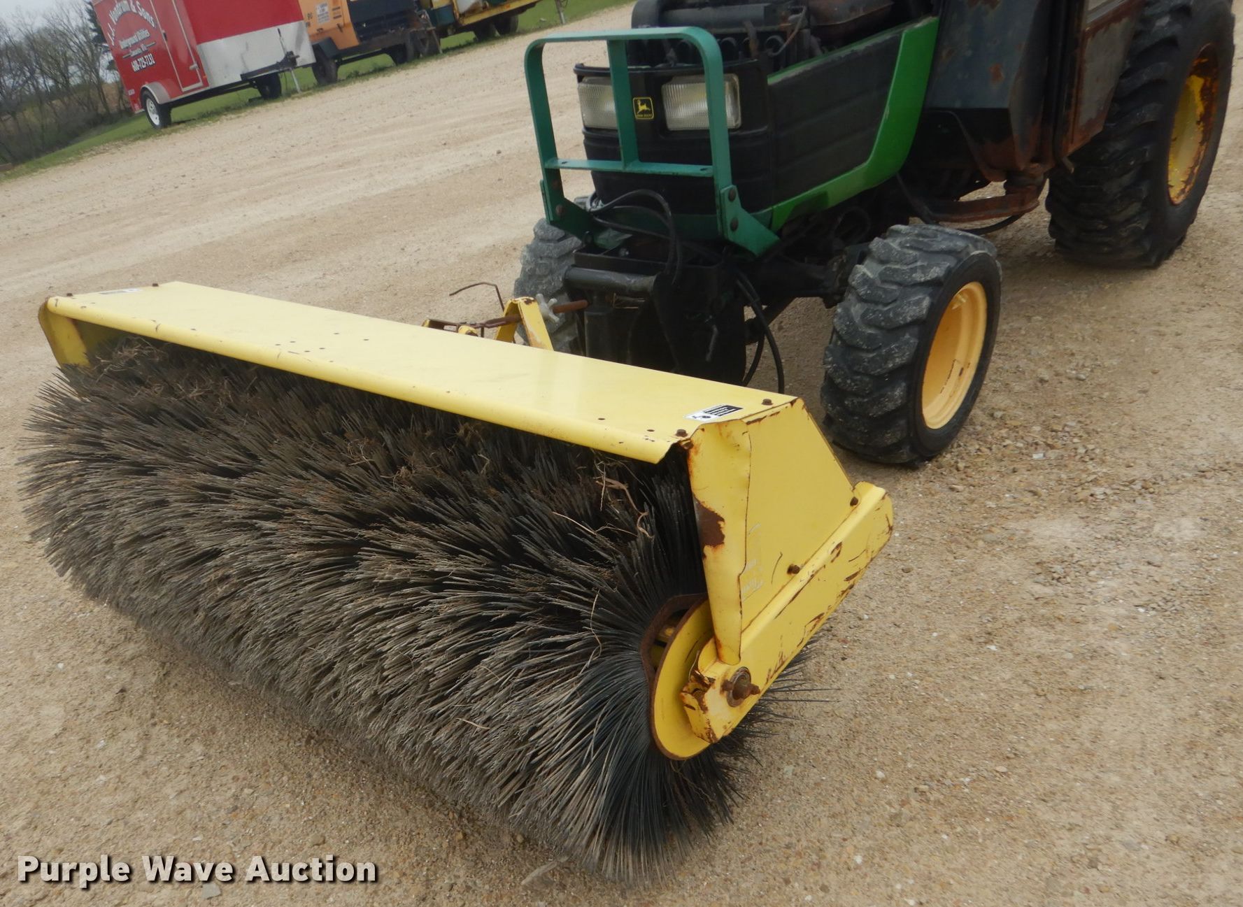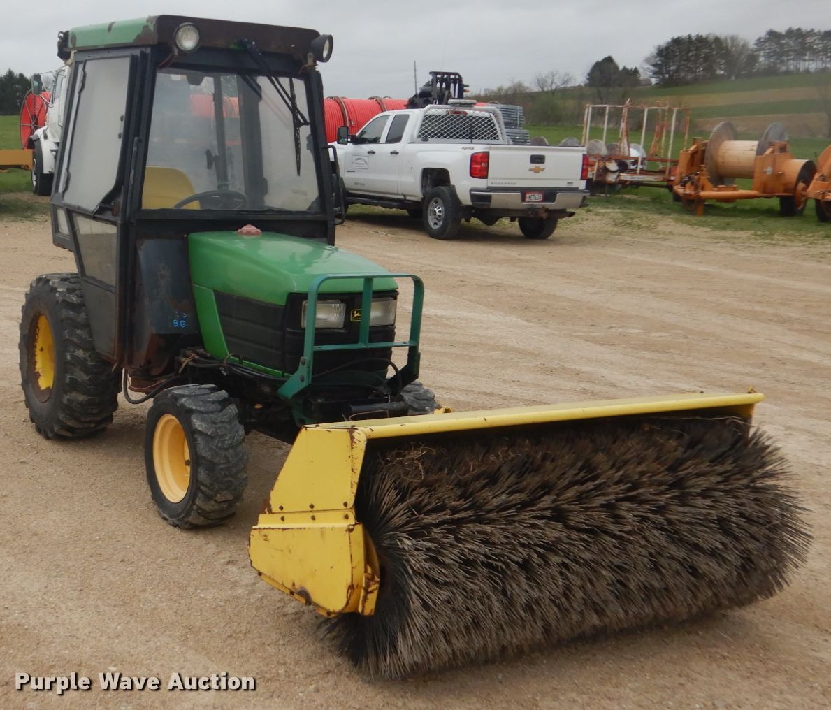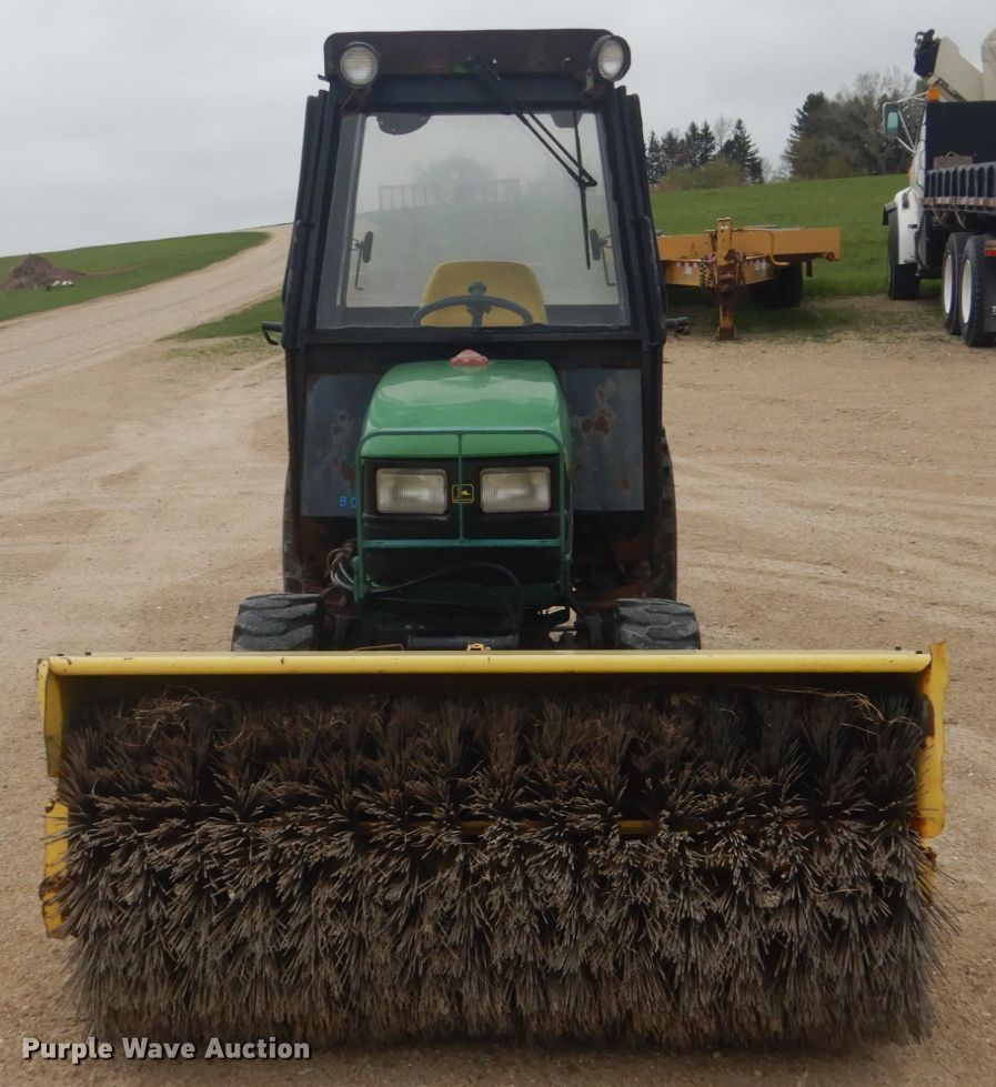 Purple Wave is selling a used Tractor in Wisconsin. This item is a John Deere 4100 MFWD tractor with the following: 1,340 hours on meter, John Deere three cylinder diesel engine, Hydrostatic transmission, Three point, Top link, 540 PTO, (2) John Deere 60"W brooms, Hydraulic angle, John Deere snow blower, 47"W, Quick attach, 23x8.50-12 front tires, 12-16.5 rear tires, Serial LV4100H313821