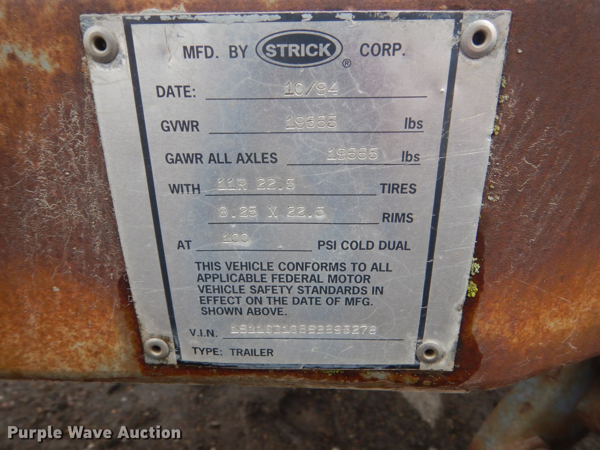 Purple Wave is selling a used Trailer Other in Nebraska. This item is a 1995 Strick trailer dolly with the following: 8'8"L, Fixed fifth wheel plate, Single leg landing gear, Spring suspension, Air brakes, Single axle, GVWR 19,655 lbs, Serial 1S11CD106SB695278