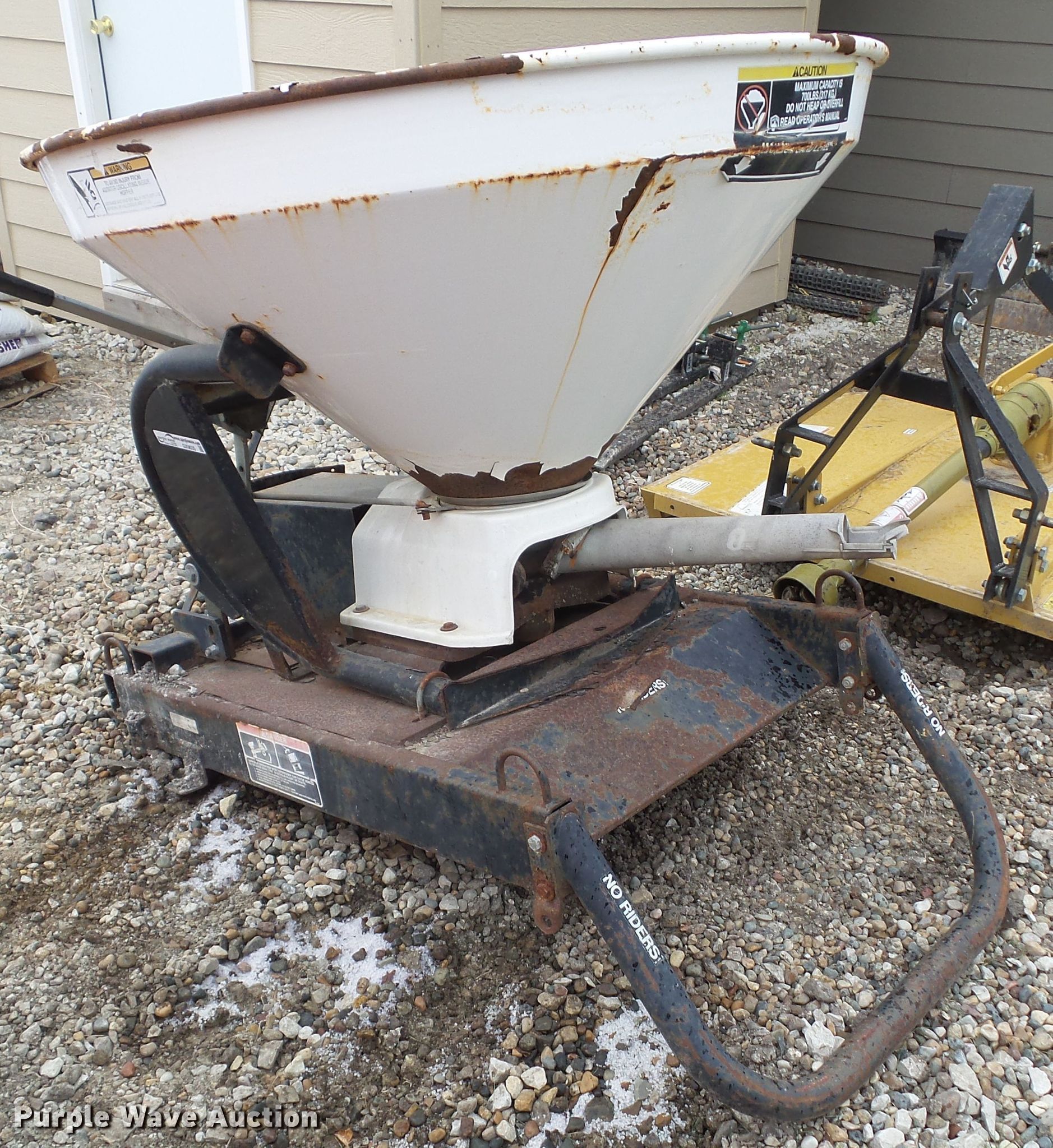Vicon spreader. Three point, 540 PTO, Toro Workman attachment, Serial 80218, 90064. Midwest Services. 1001 E Court Ave. Winterset, IA 50273