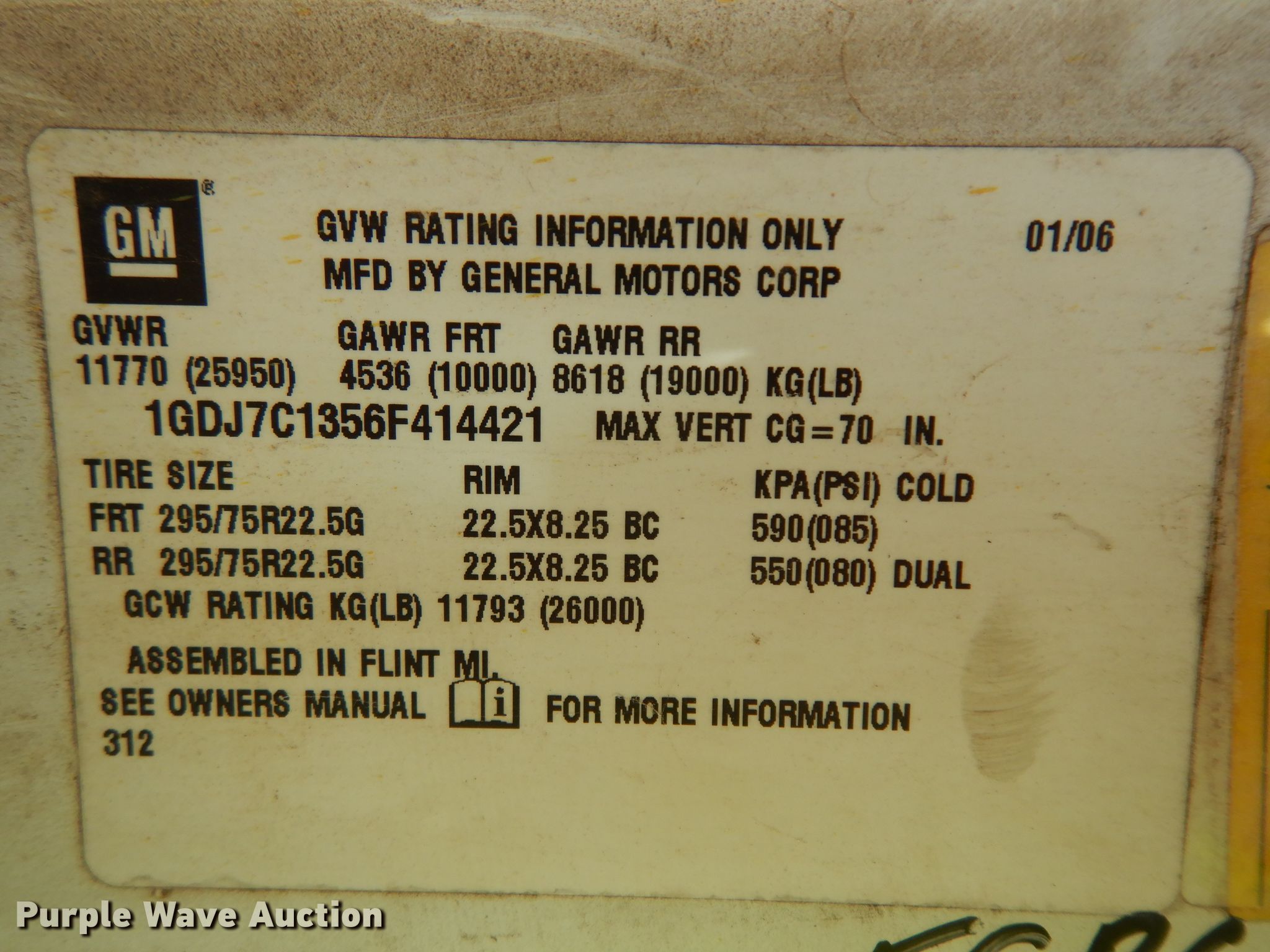 Purple Wave is selling a used Truck Chassis in Nebraska. This item is a 2006 GMC C7500 truck cab and chassis with the following: 65,080 miles on odometer, Isuzu 7.8L L6 diesel engine, Automatic transmission, Single axle, AC and heat, PTO, Generator, 12,000 watts, Dual fuel tanks, Spring suspension, Hydraulic brakes, 295/75R22.5 tires, GVWR 25,950 lbs, FAWR 10,000 lbs, RAWR 19,000 lbs