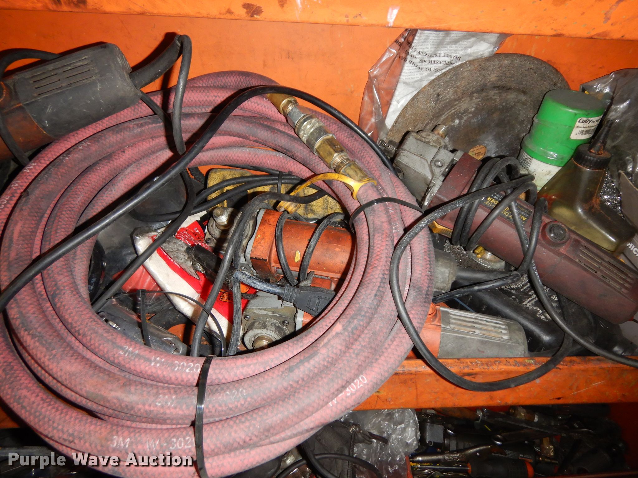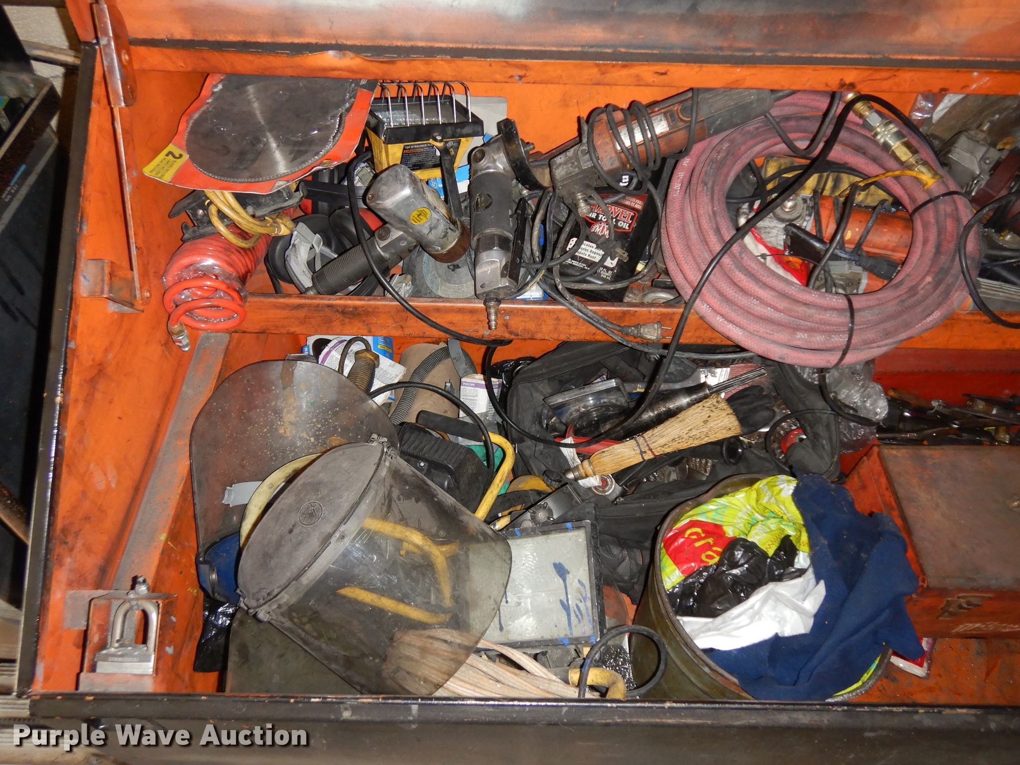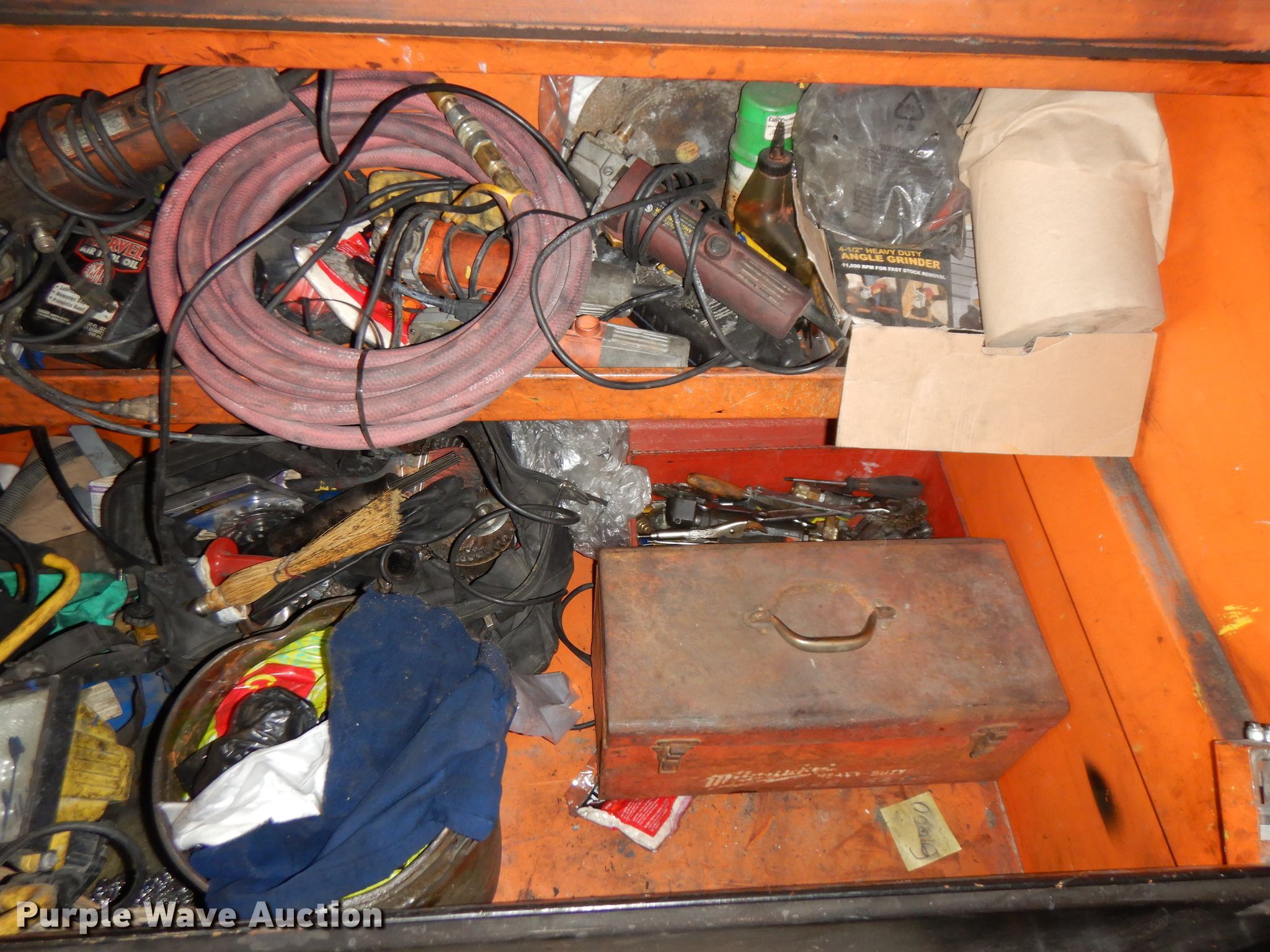 Purple Wave is selling a used Tools in Kansas. This item is a Jobox storage box with the following: Air tools, Extension cords, Hand tools, Plastic face masks, Electric angle grinders