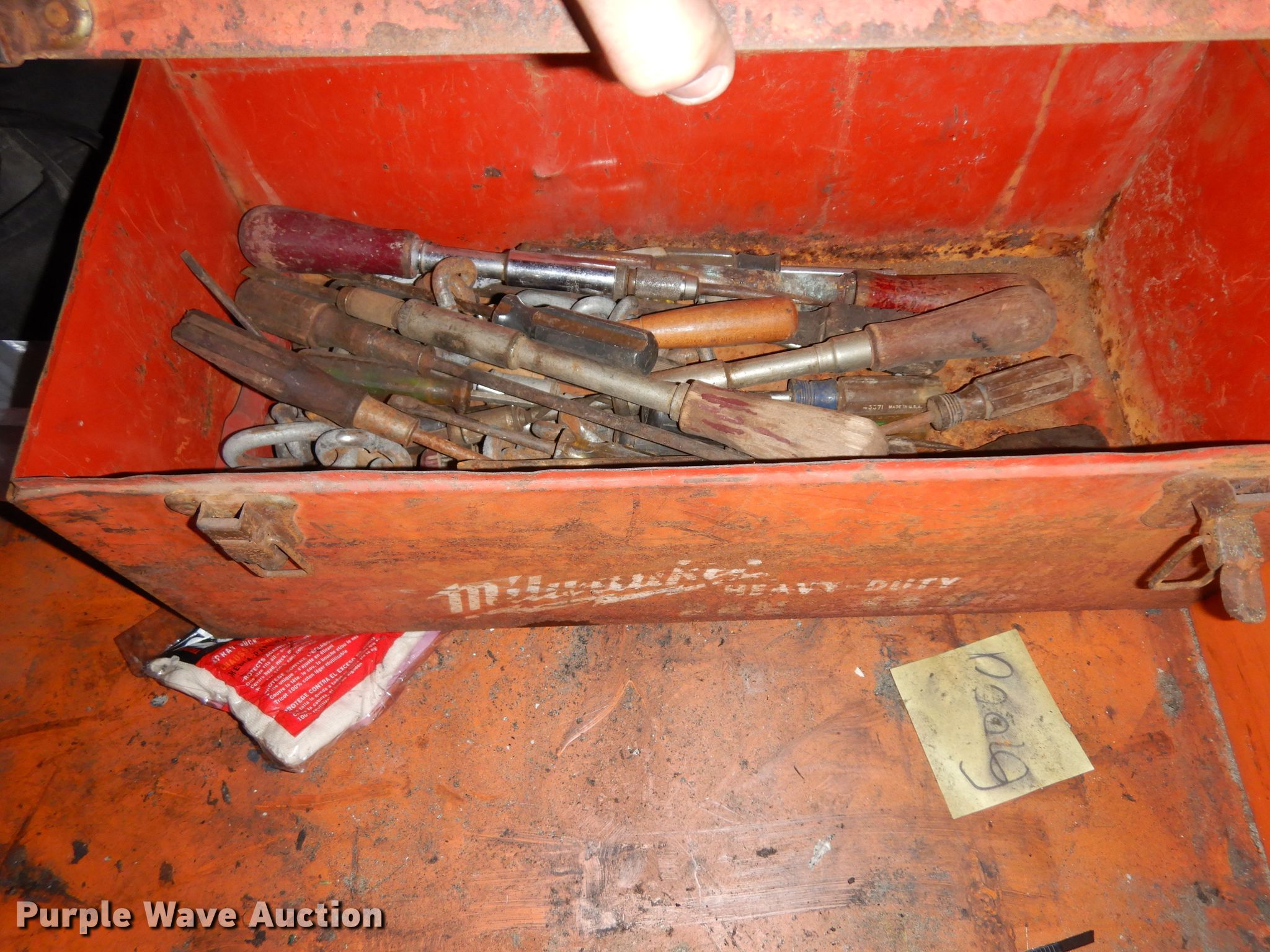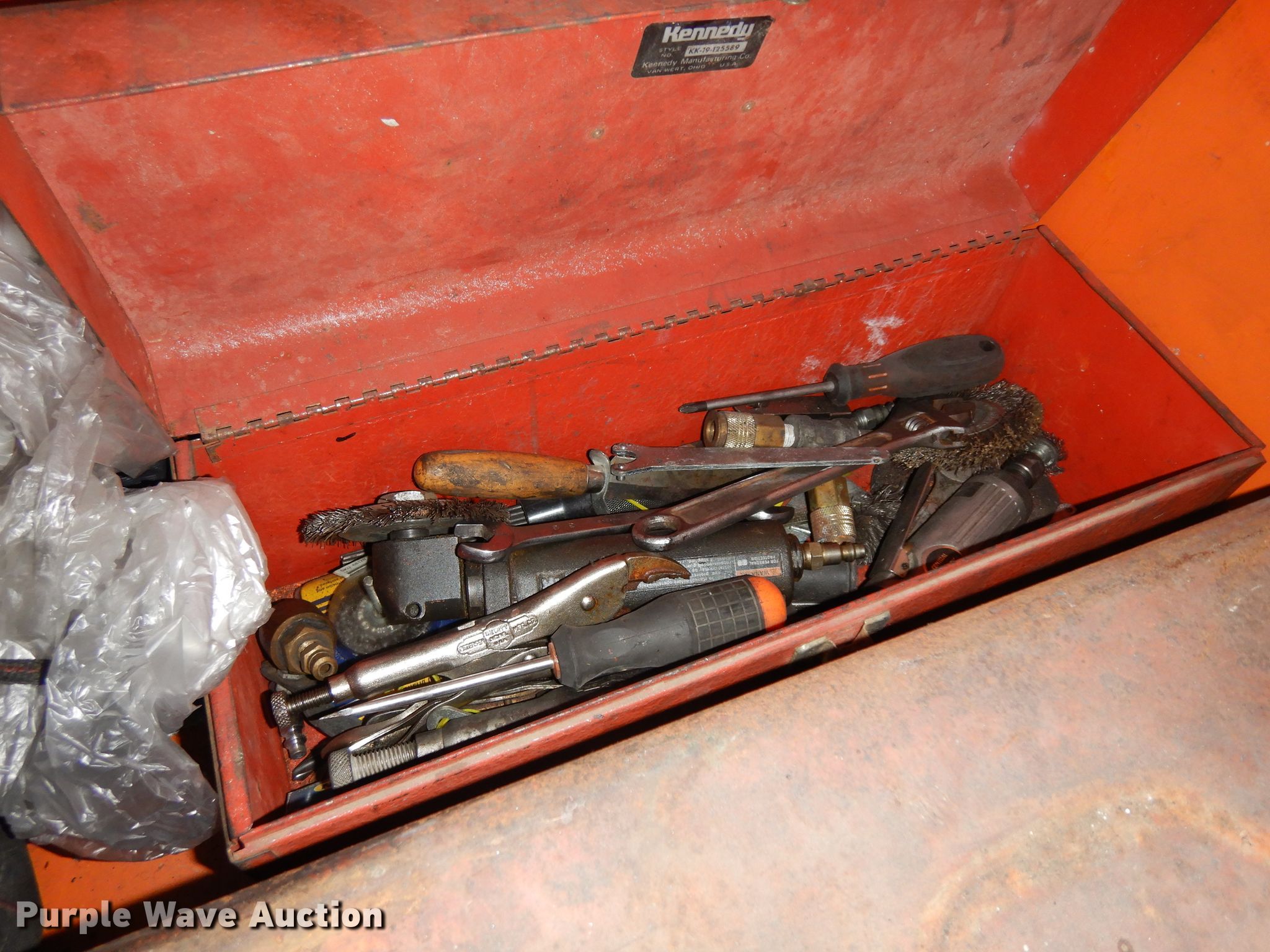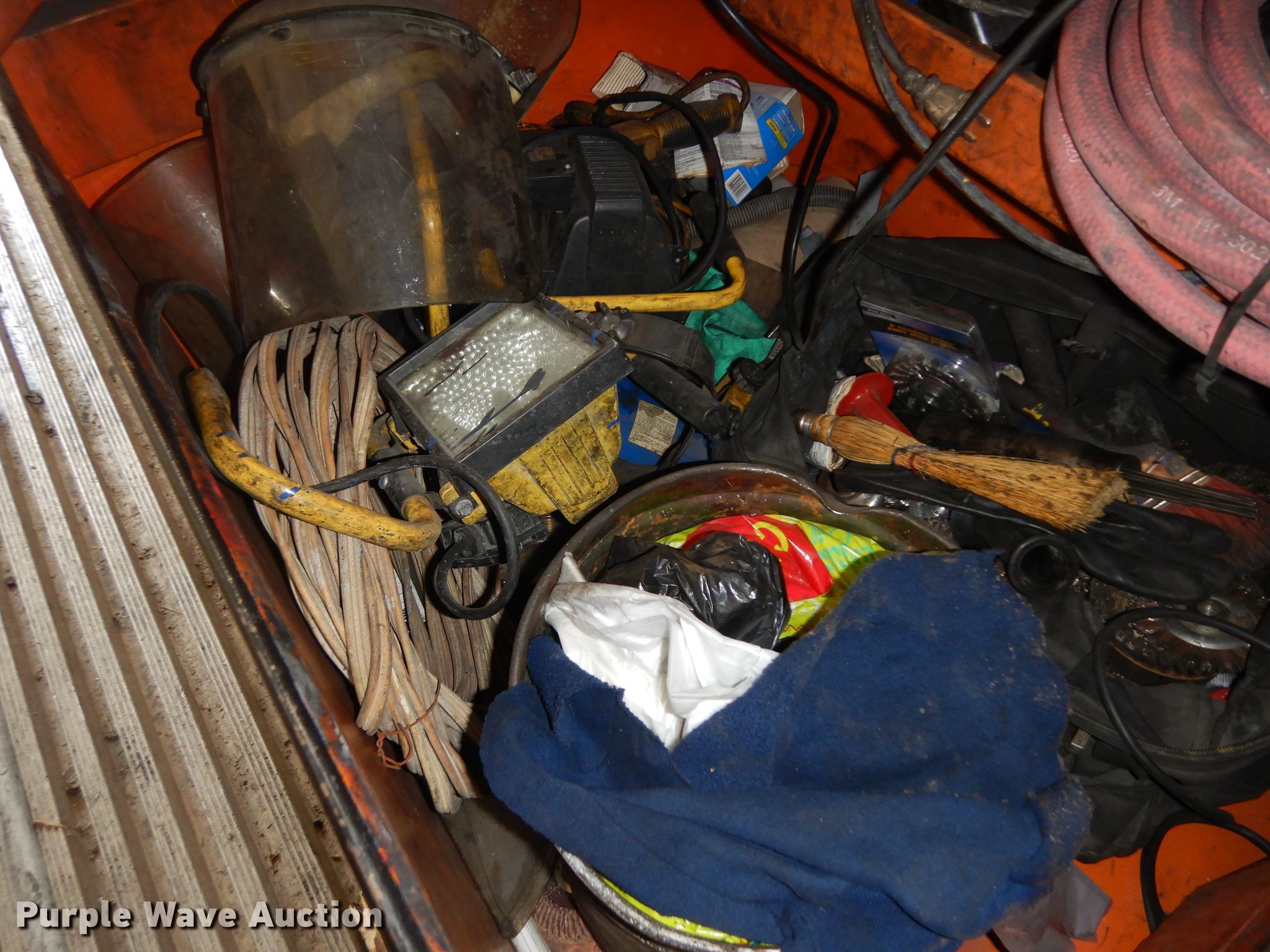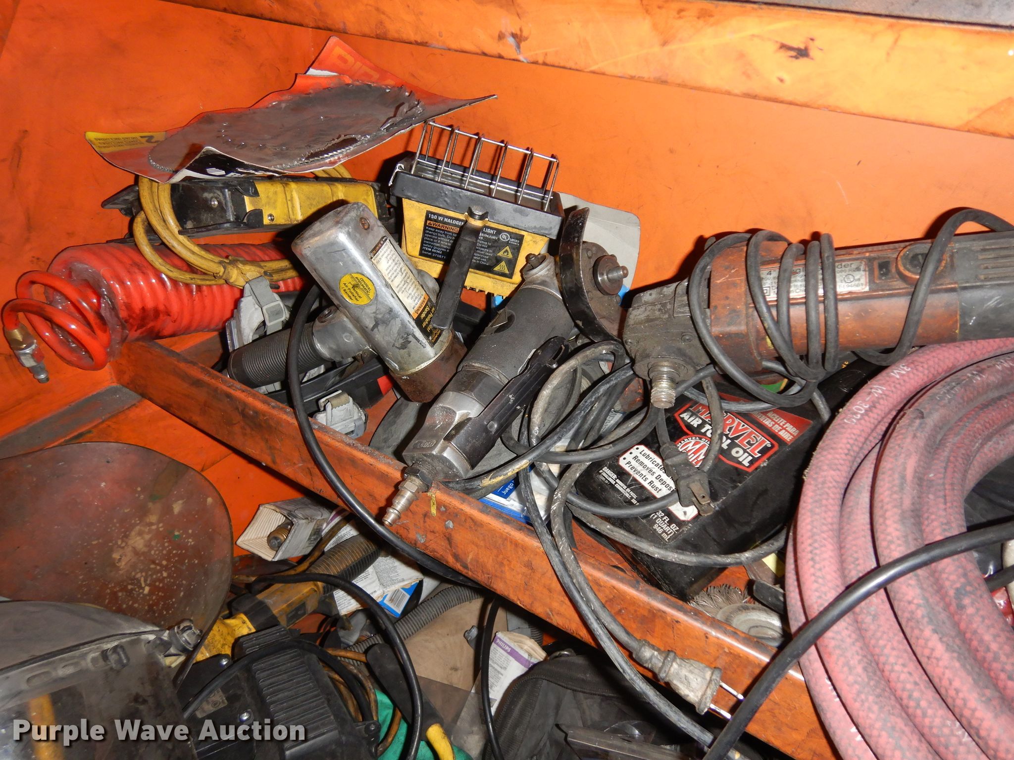 Purple Wave is selling a used Tools in Kansas. This item is a Jobox storage box with the following: Air tools, Extension cords, Hand tools, Plastic face masks, Electric angle grinders