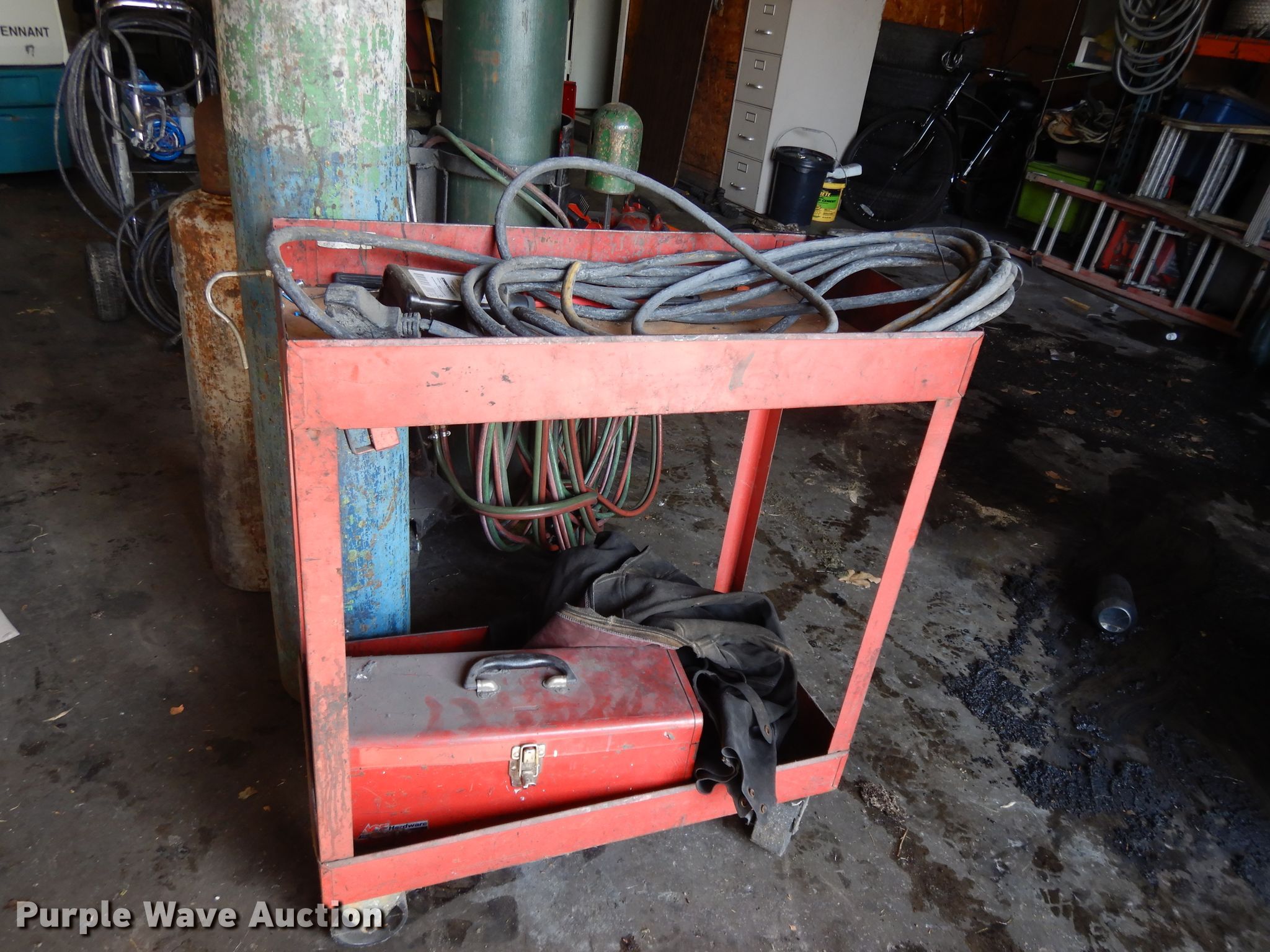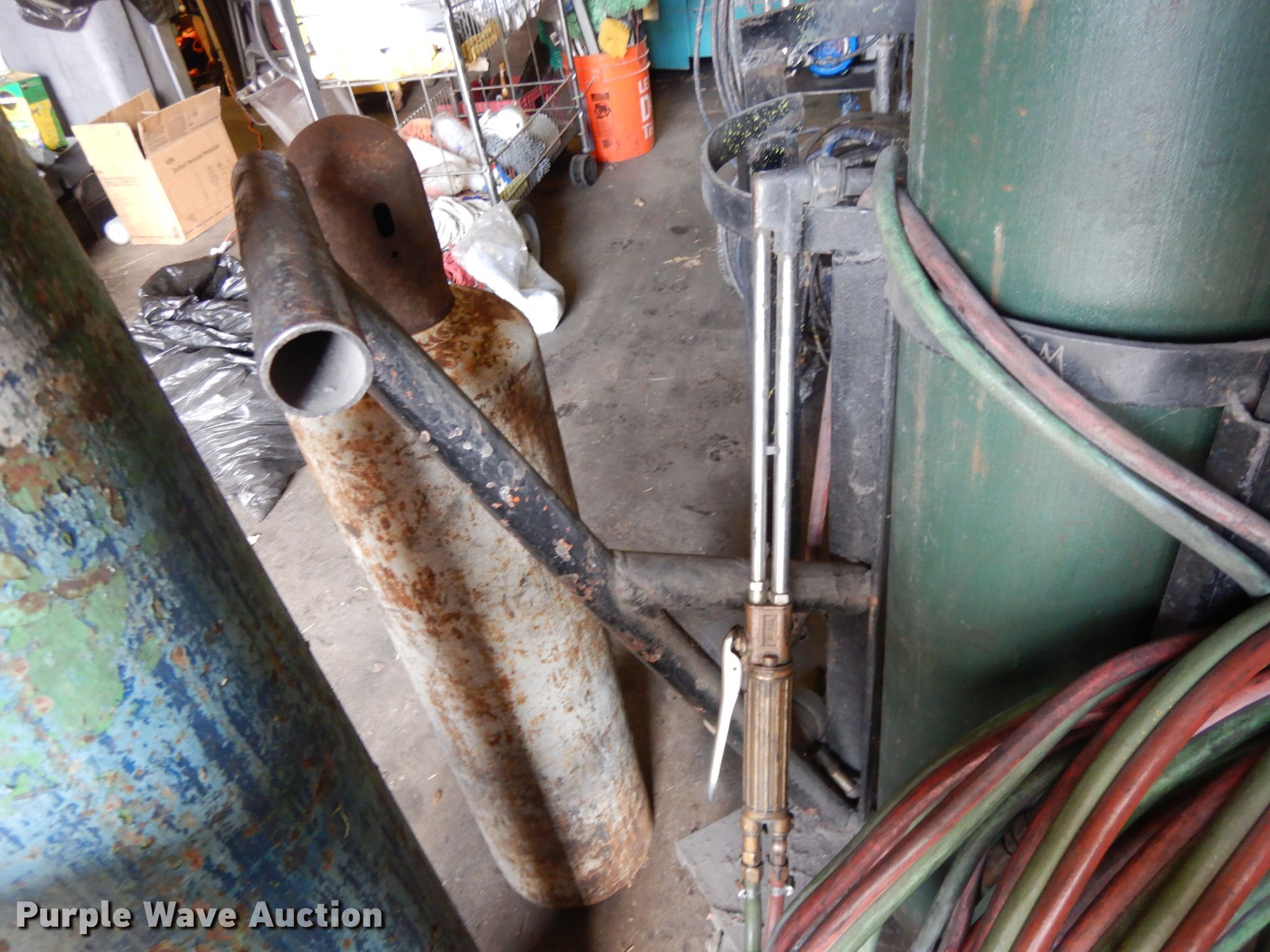 Purple Wave is selling a used Torch in Kansas. This item is a Blow torch equipment with the following: (3) gas bottles, Oxygen and fuel hose, Torch head, Torch cart, Metal cart
