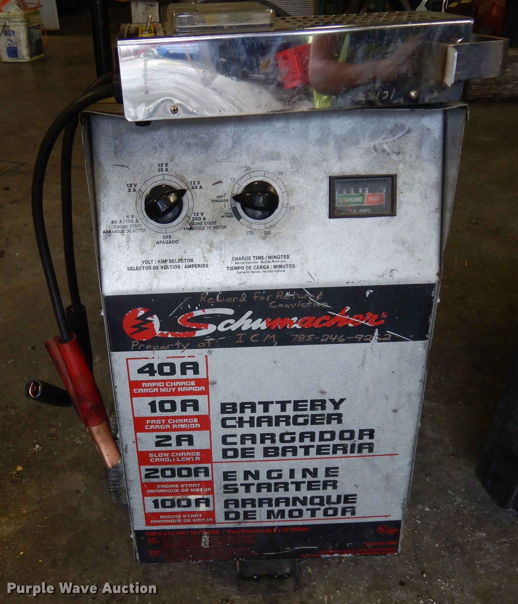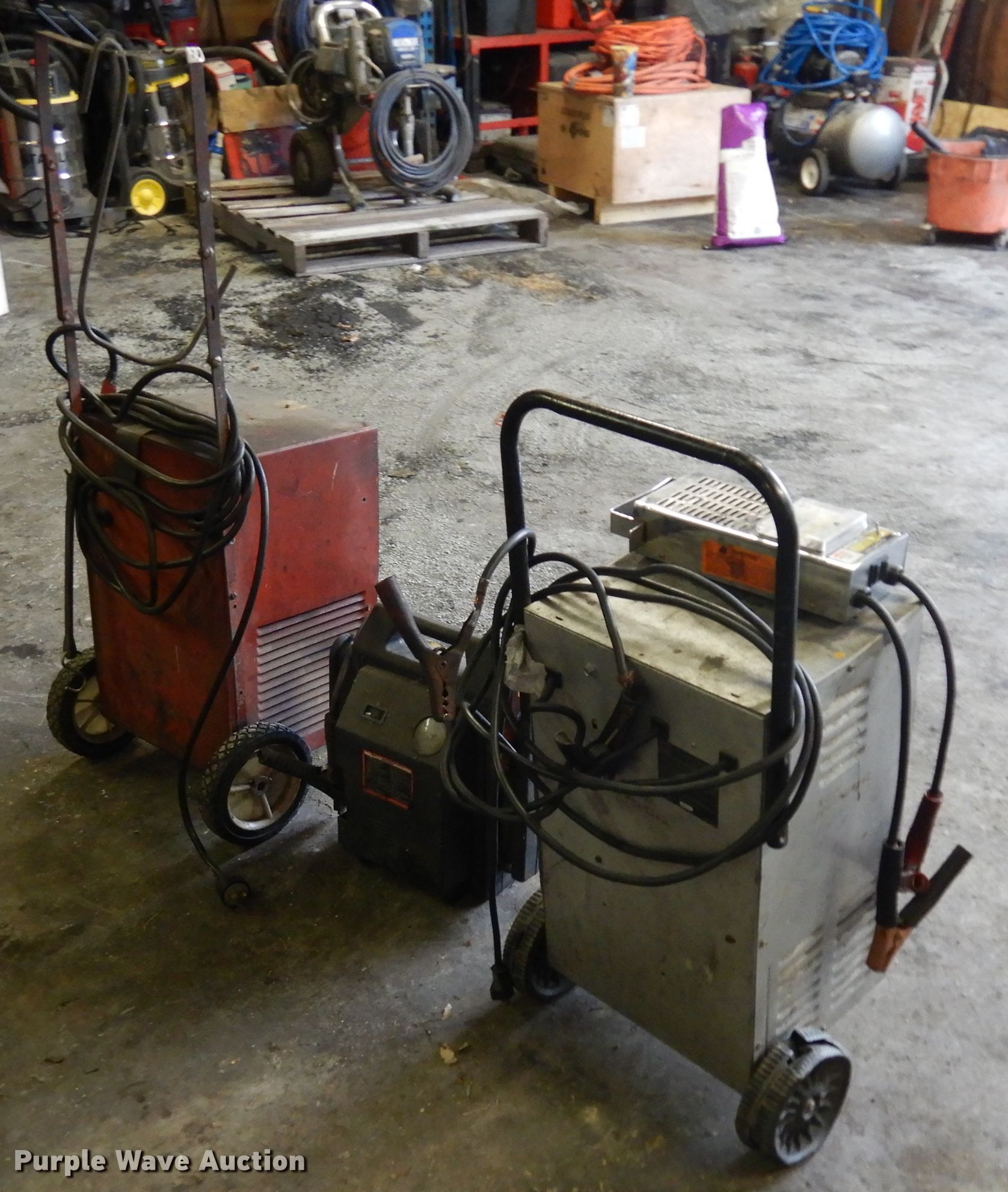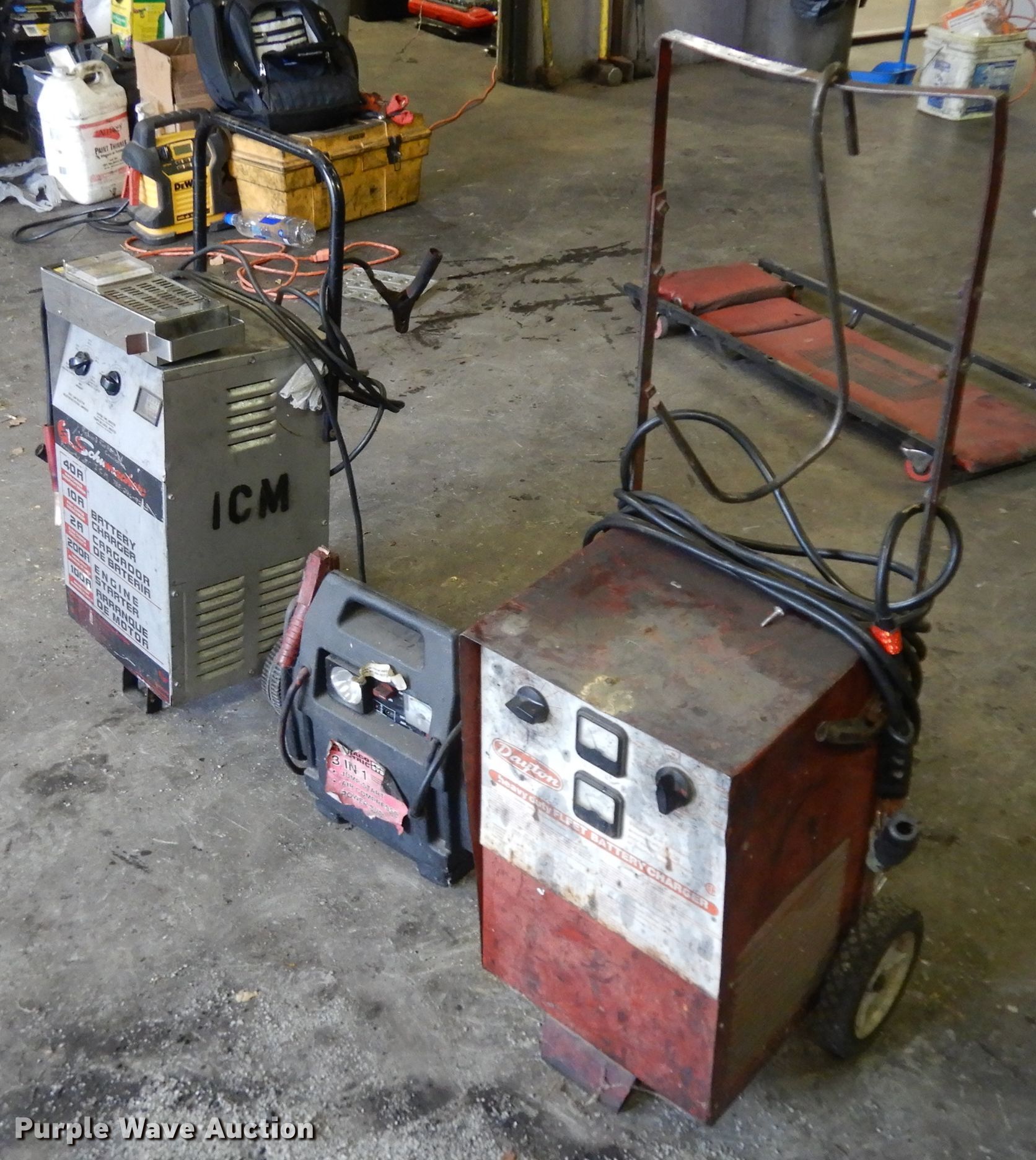 Purple Wave is selling a used Tools in Kansas. This item is a Battery chargers with the following: Dayton charger, Input, 120V, 13 amps, Output, 100/60/45/35 amps at 6/12/18/24V DC,, Schumacher charger, Input, 120V, 15 amps max, Output, 200/100 amps at 7.2/3.6V,, Battery jump pack, Battery tester