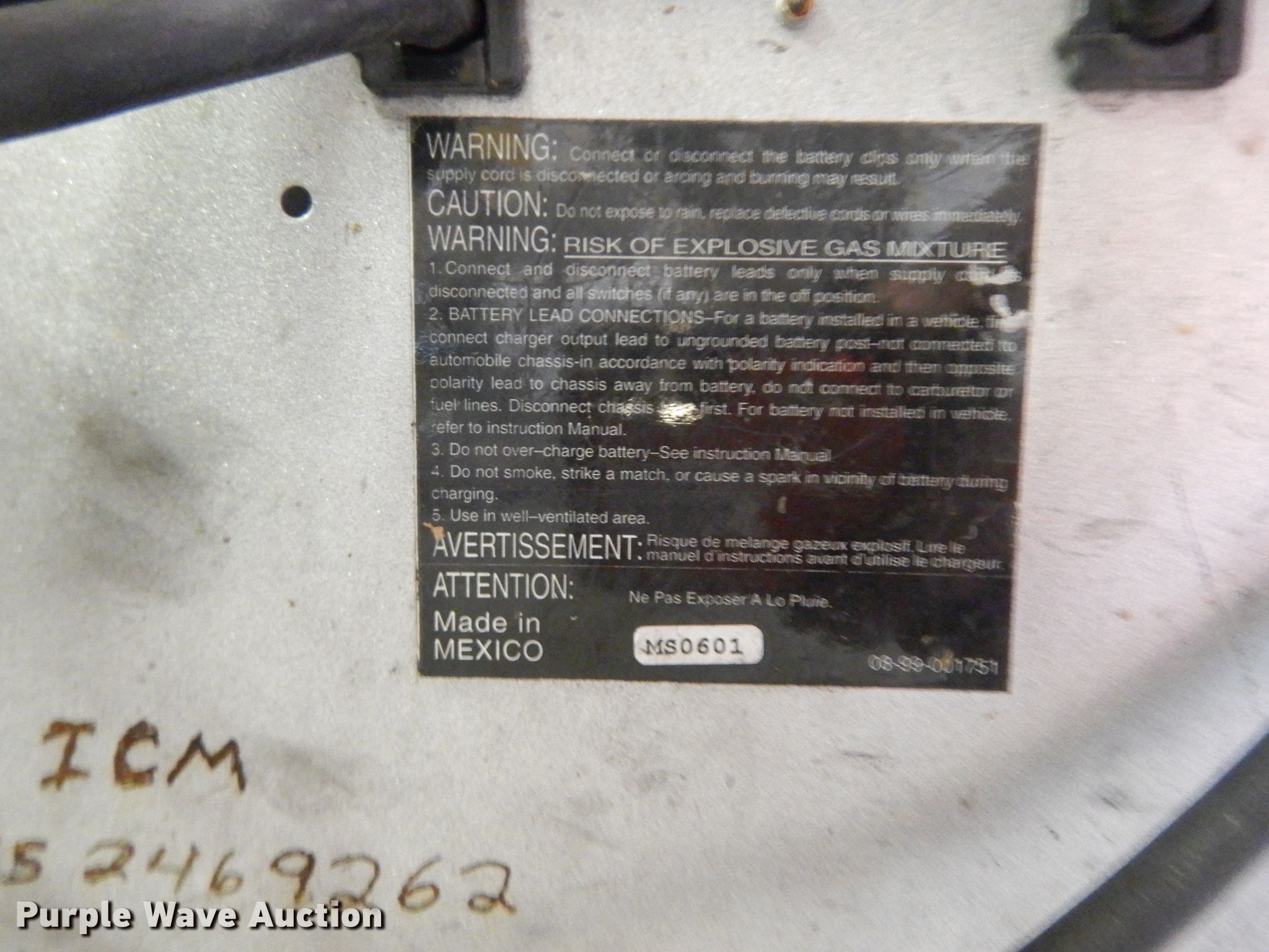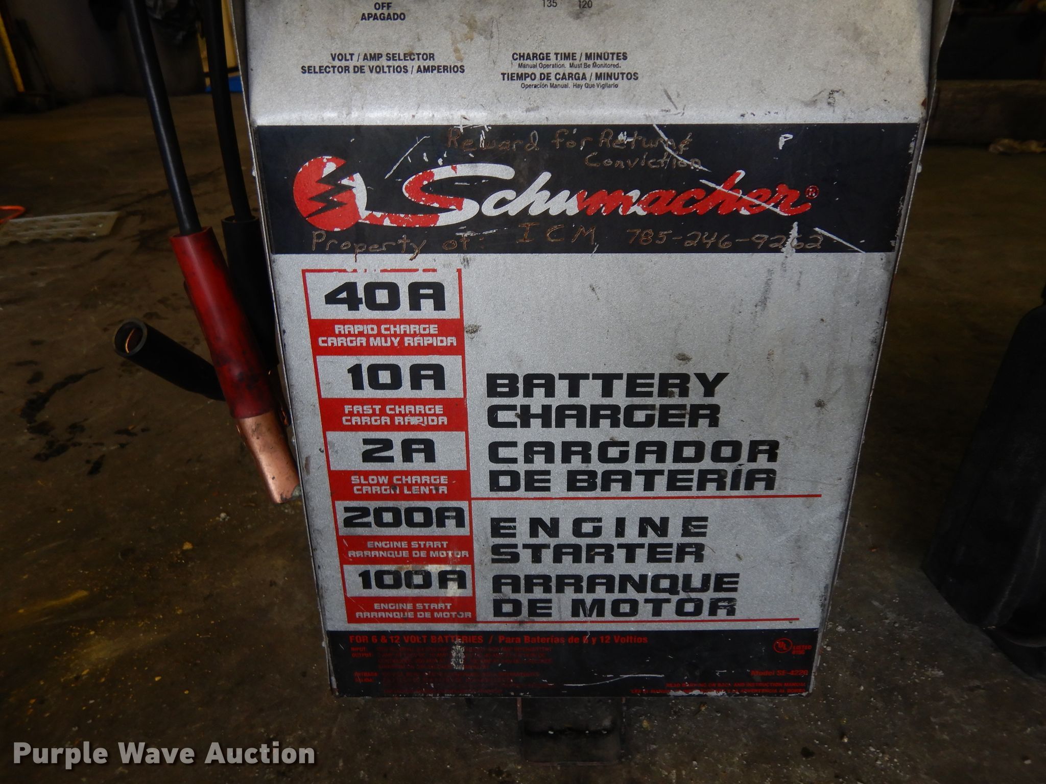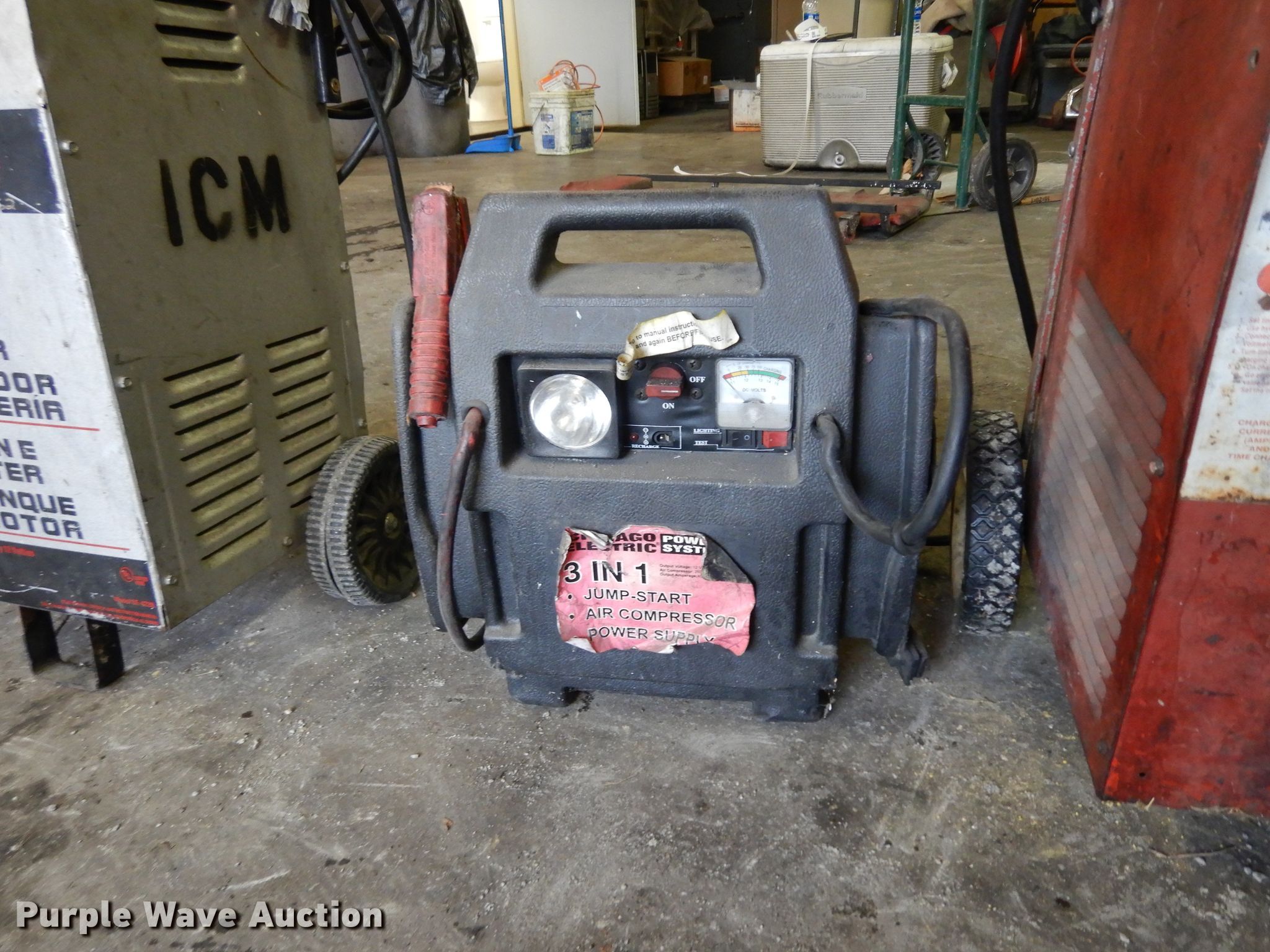Purple Wave is selling a used Tools in Kansas. This item is a Battery chargers with the following: Dayton charger, Input, 120V, 13 amps, Output, 100/60/45/35 amps at 6/12/18/24V DC,, Schumacher charger, Input, 120V, 15 amps max, Output, 200/100 amps at 7.2/3.6V,, Battery jump pack, Battery tester