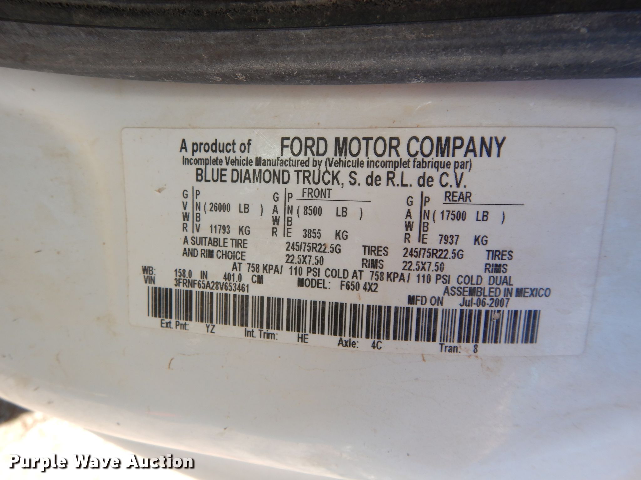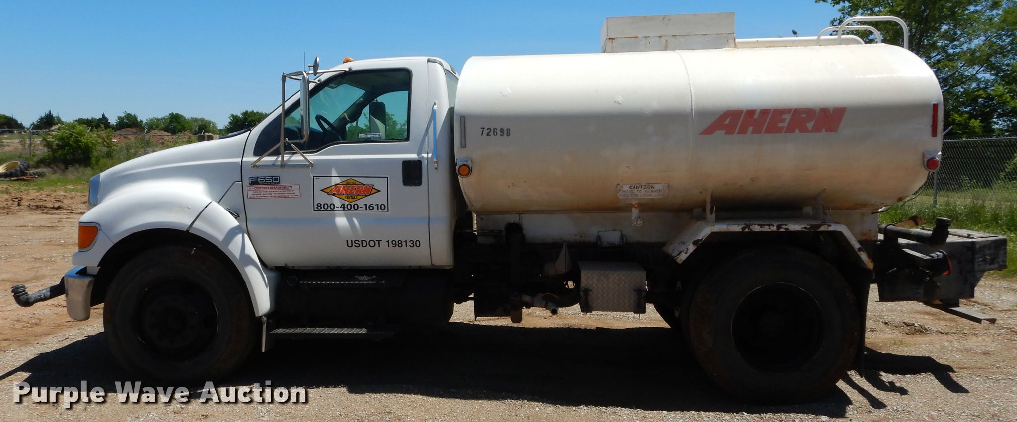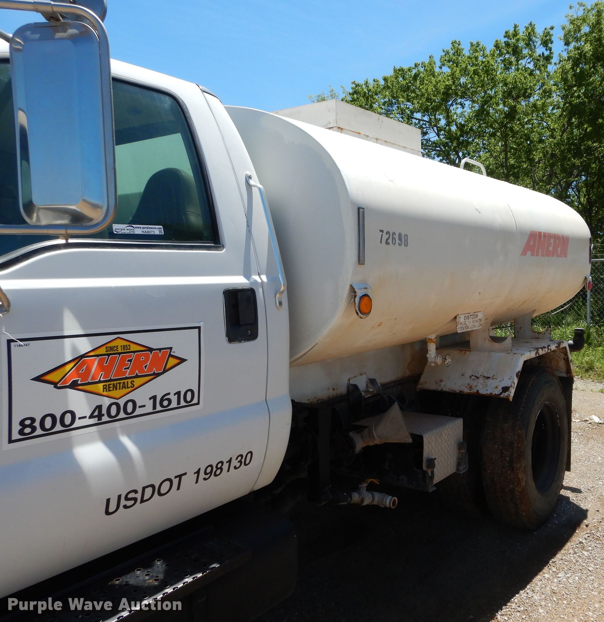 Purple Wave is selling a used Tank Truck or Water Truck in Oklahoma. This item is a 2008 Ford F650 Super Duty water truck with the following: 23,970 miles on odometer, Cummins ISB 6.7L L6 diesel engine, Six speed manual transmission, AC and heat, Cruise, PTO, 2,000 gallon tank, 10'L x 98"W x 45"H tank bed, 84"W front and rear spray bars, In-cab controls, Spring suspension, Hydraulic brakes, 11R22.5 tires, GVWR 26,000 lbs