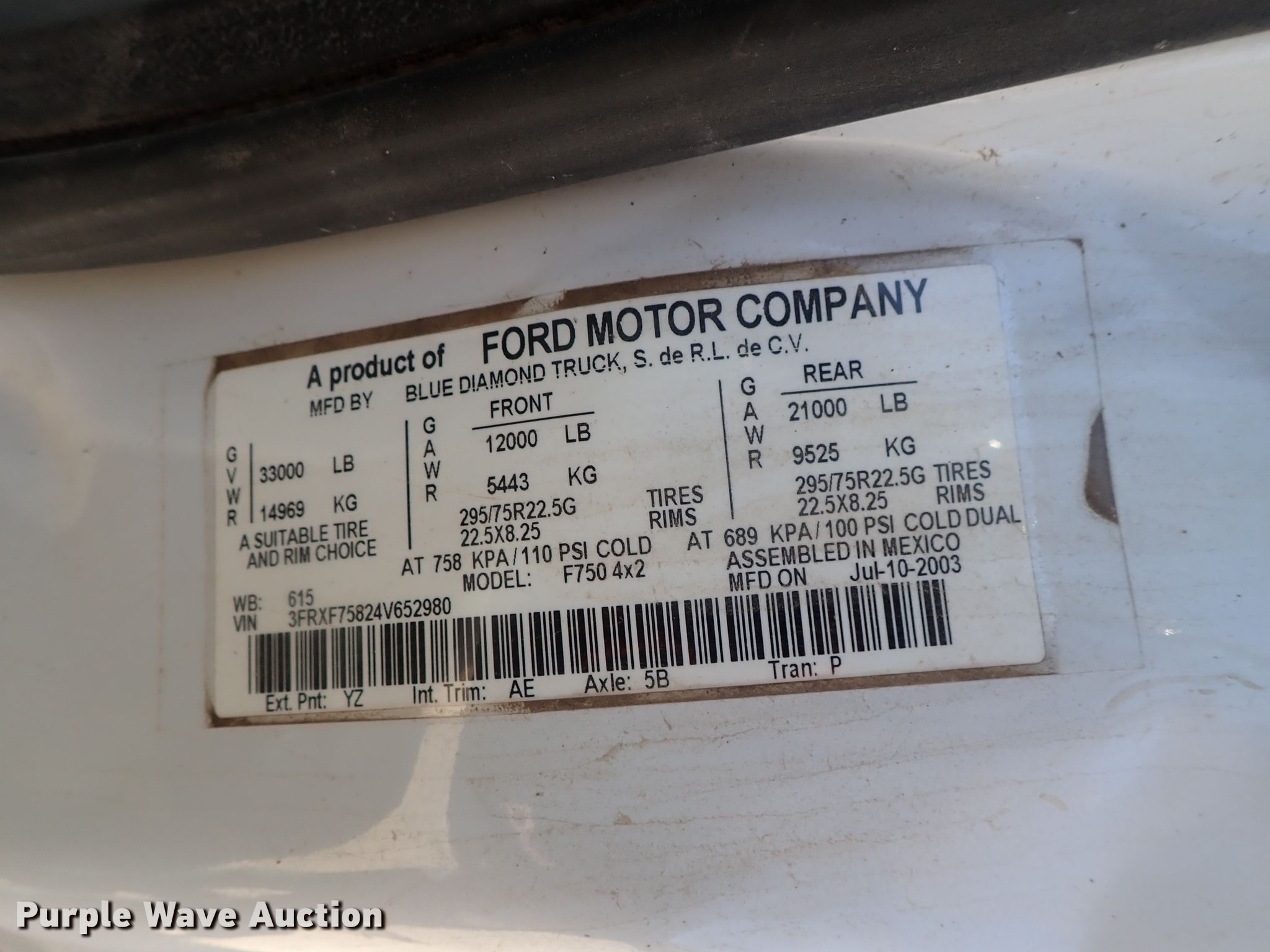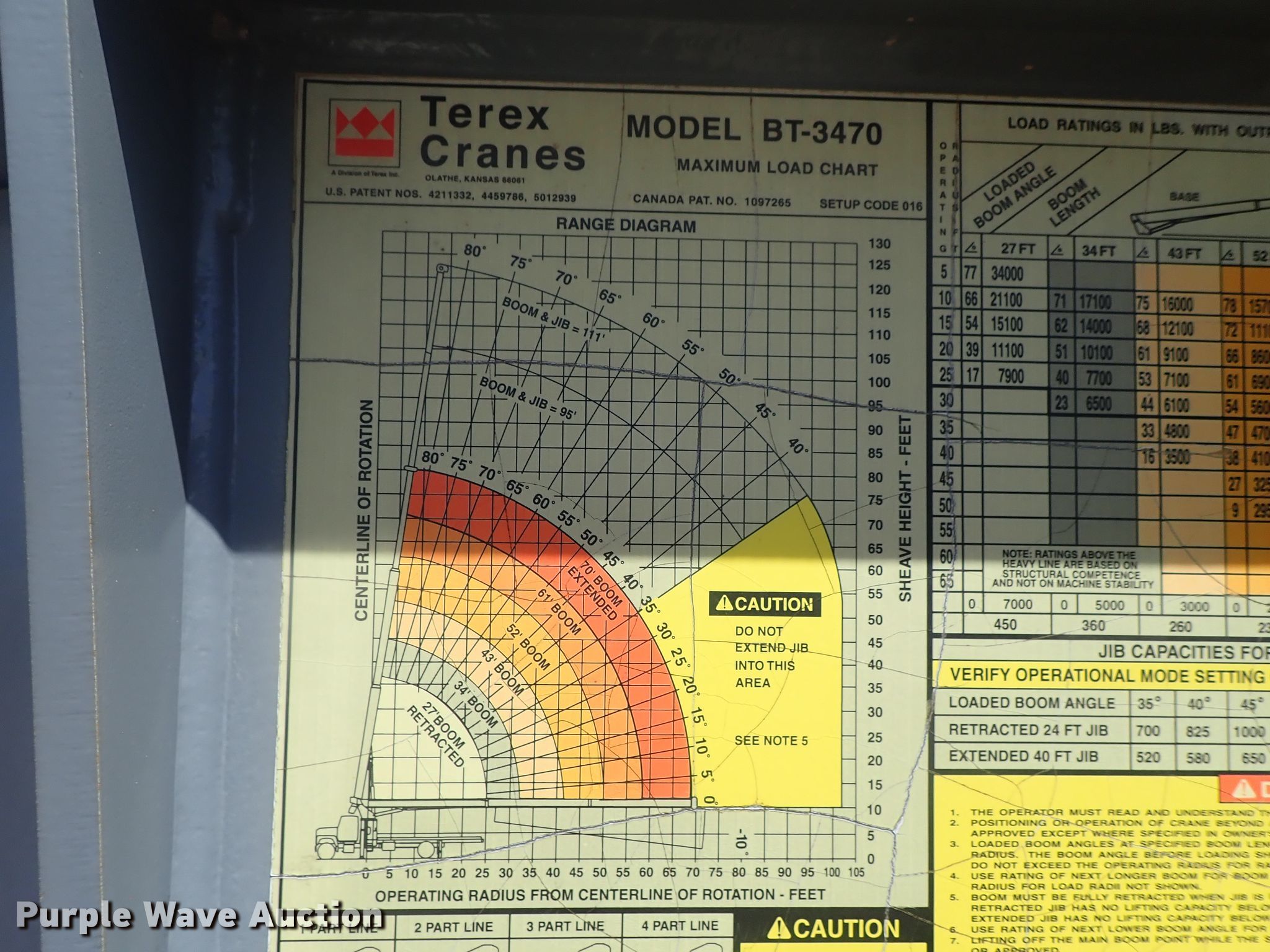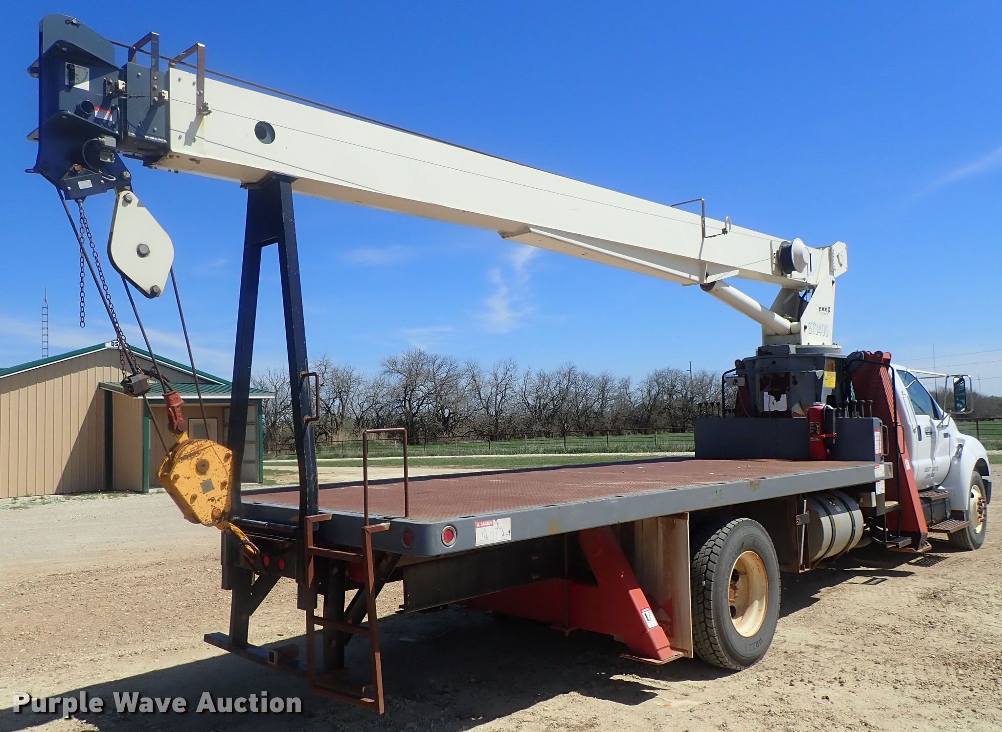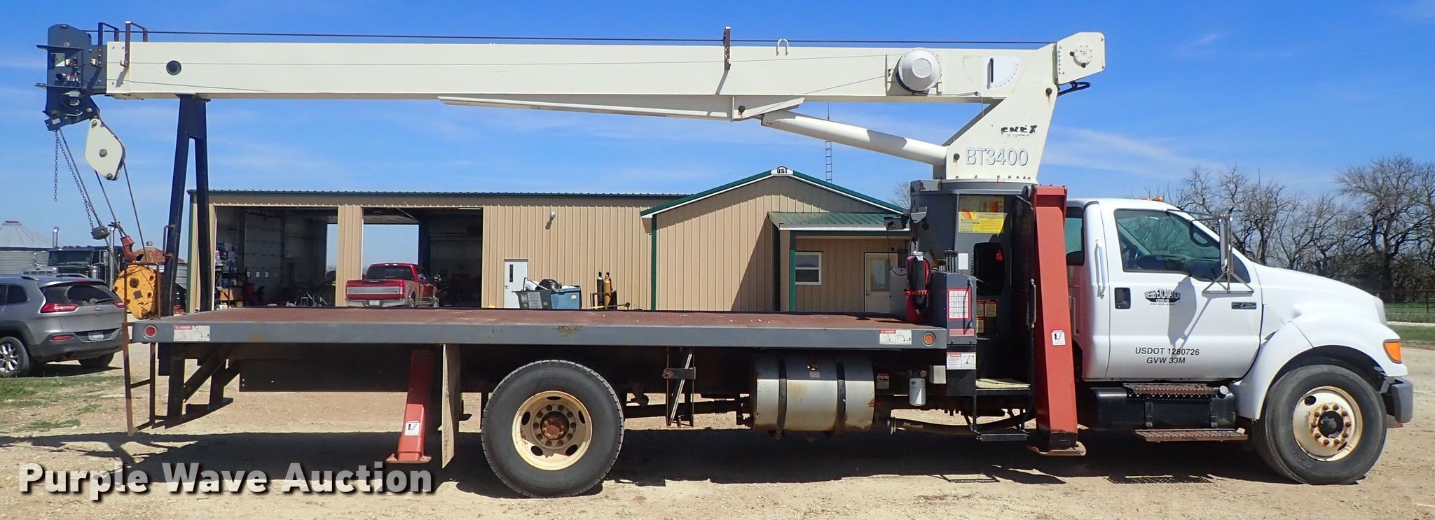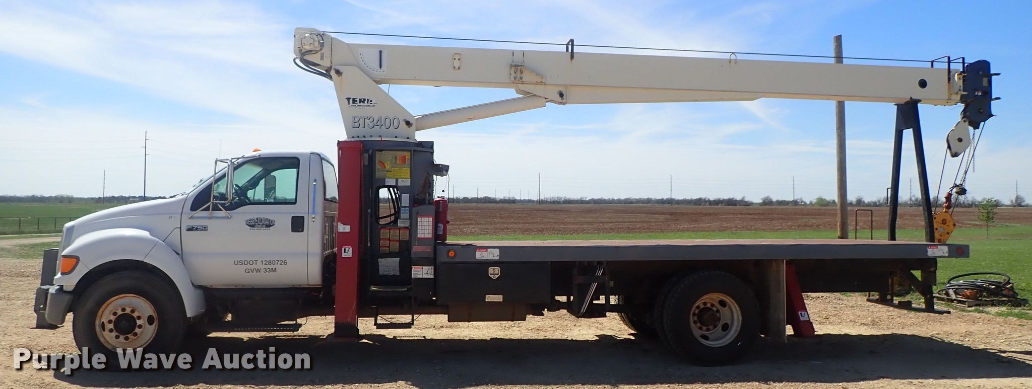 Purple Wave is selling a used Crane Truck in Kansas. This item is a 2004 Ford F750 crane truck with the following: 31,372 miles on odometer, Caterpillar 3126 7.2L L6 diesel engine, Six speed manual transmission, Single axle, AC and heat, PTO, 20'L flatbed, Terex BT-3470 telescopic boom, 70' boom length, 34,000 lbs maximum lift capacity, Ground boom controls, Crane block, Lift chart, Serial 0104BT3470585, Spring suspension, Air brakes, 11R22.5 tires, GVWR 33,000 lbs
