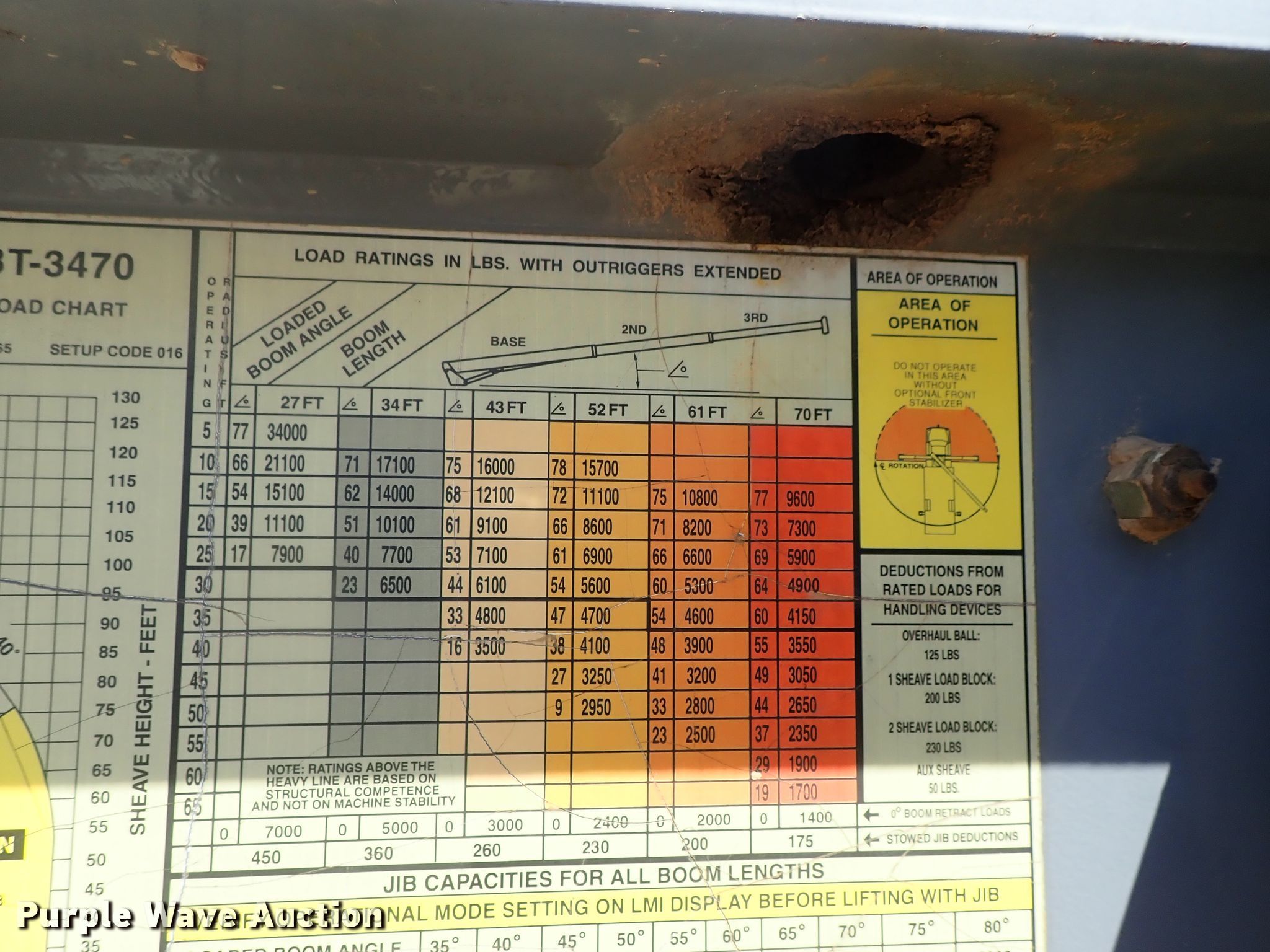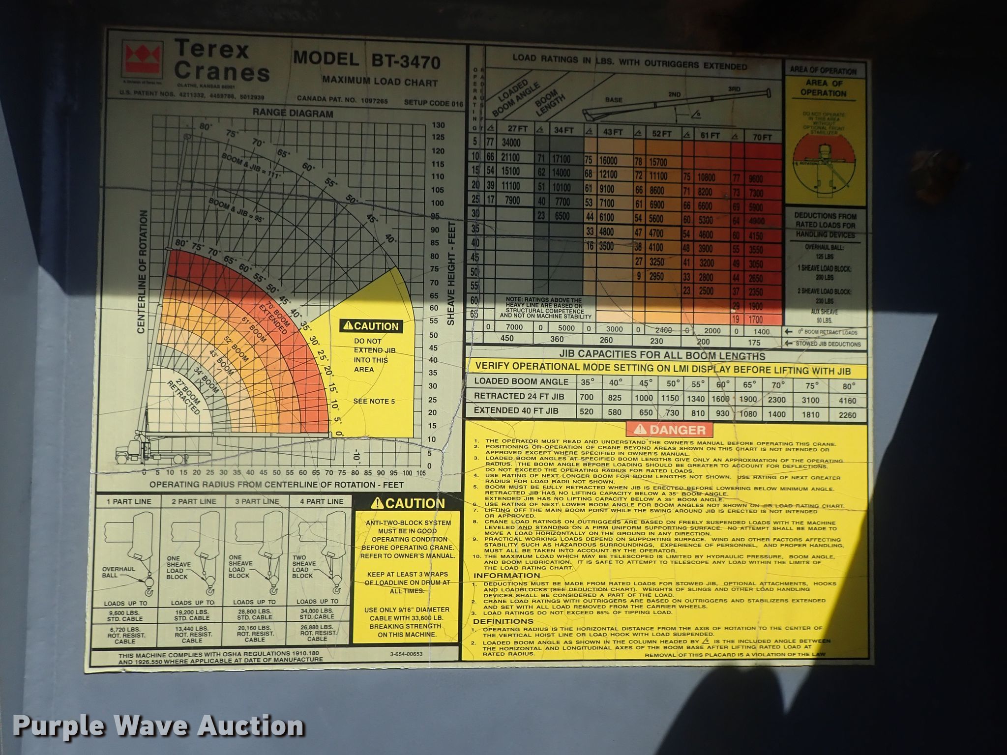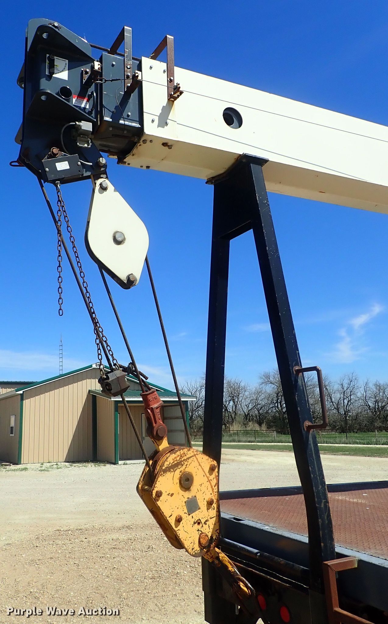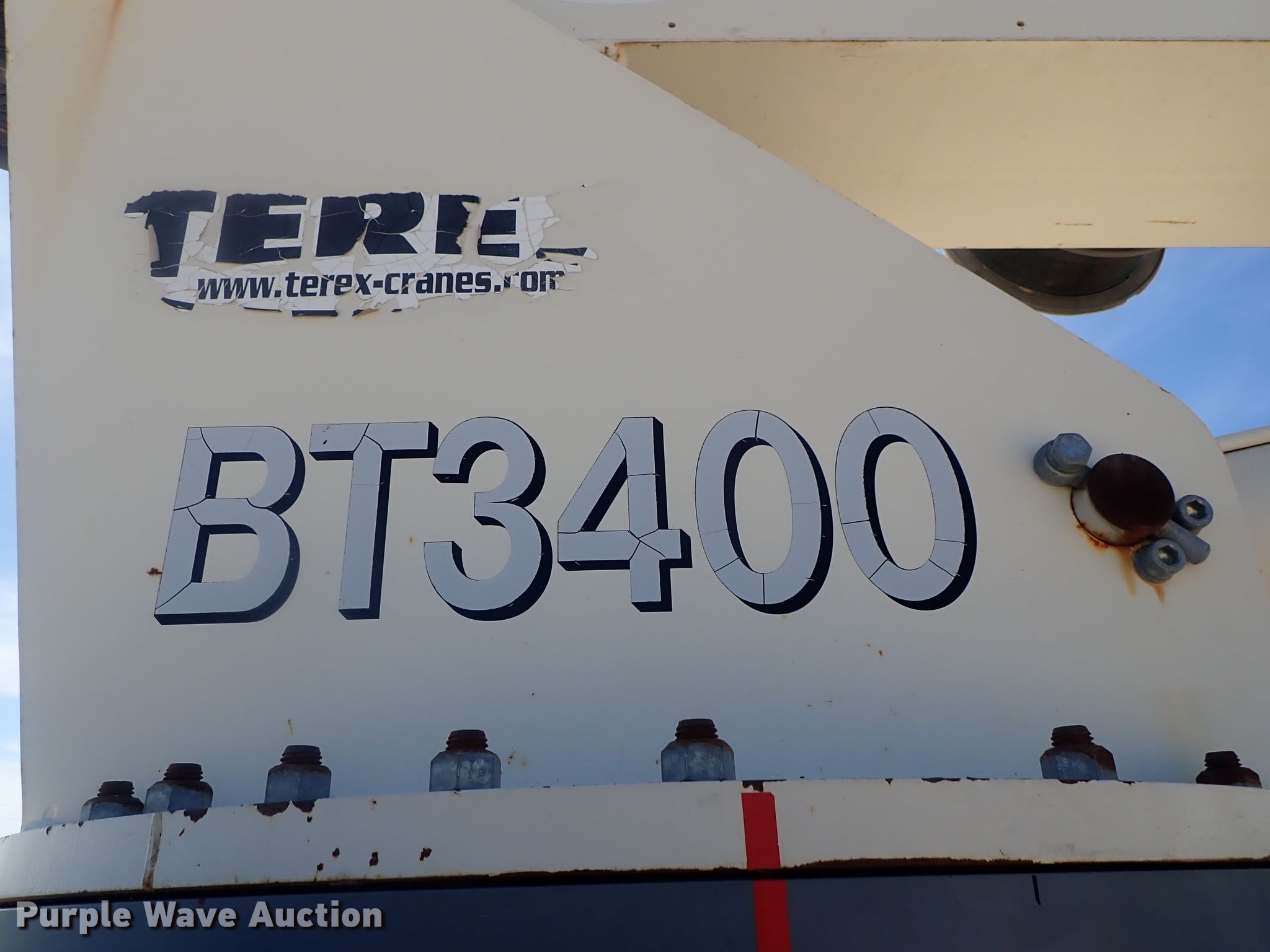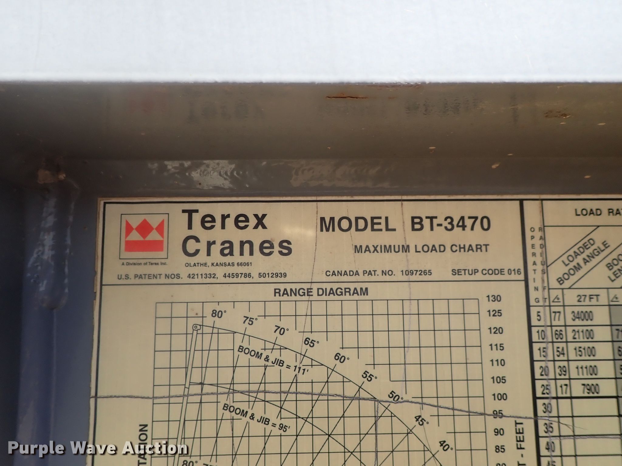 Purple Wave is selling a used Crane Truck in Kansas. This item is a 2004 Ford F750 crane truck with the following: 31,372 miles on odometer, Caterpillar 3126 7.2L L6 diesel engine, Six speed manual transmission, Single axle, AC and heat, PTO, 20'L flatbed, Terex BT-3470 telescopic boom, 70' boom length, 34,000 lbs maximum lift capacity, Ground boom controls, Crane block, Lift chart, Serial 0104BT3470585, Spring suspension, Air brakes, 11R22.5 tires, GVWR 33,000 lbs