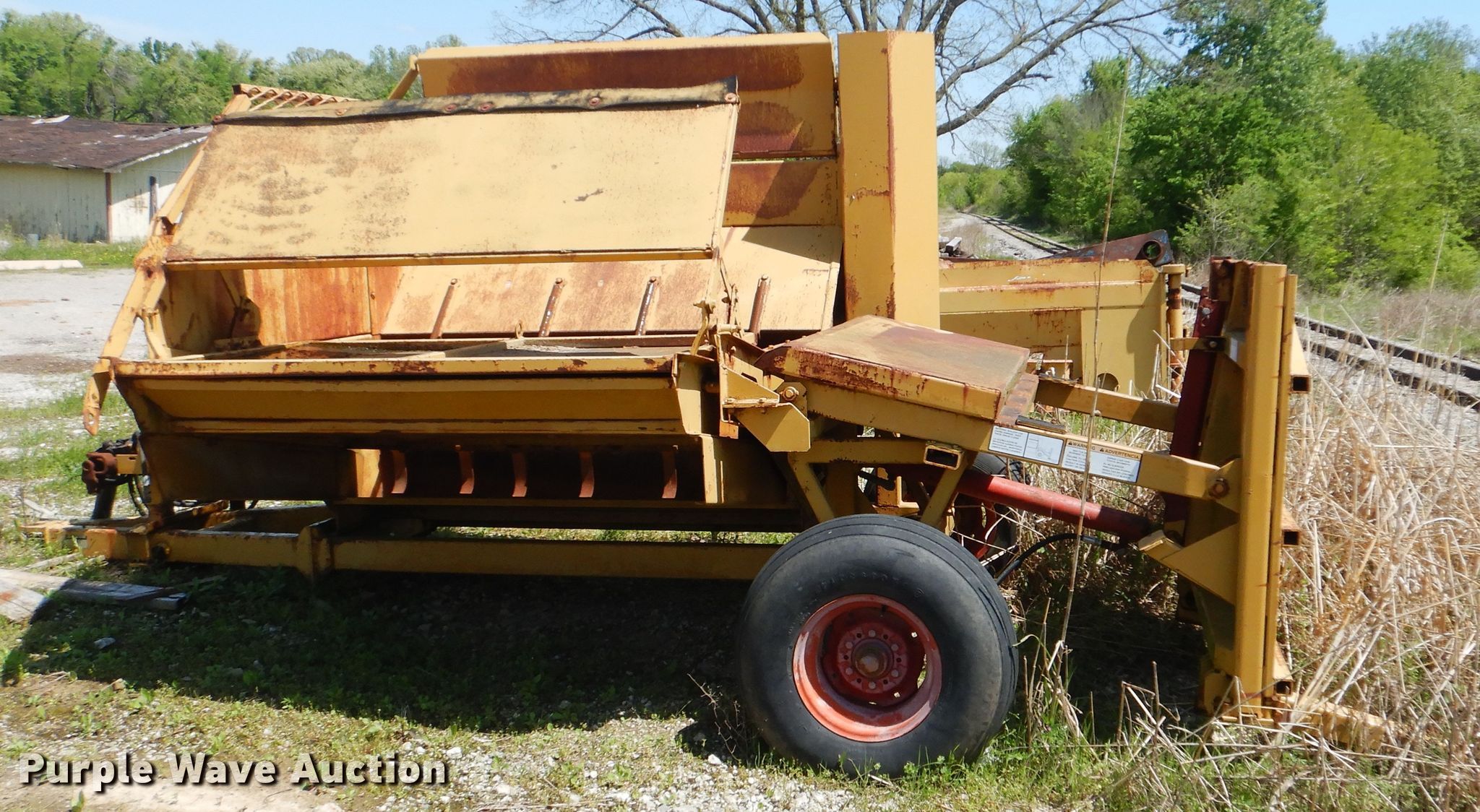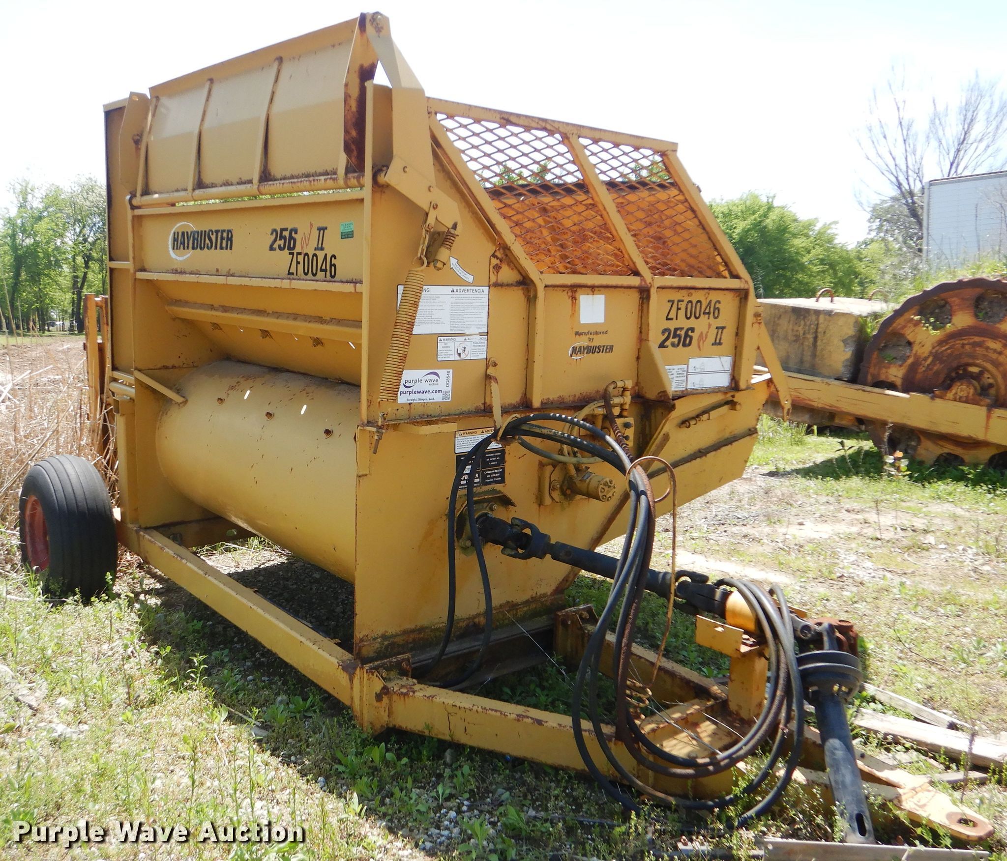 Purple Wave is selling a used Feed Mixer or Bale Processor in Oklahoma. This item is a HayBuster 256 bale processor with the following: 540/1000 PTO, Flail knife impeller, Bale chain flow control, Self-loading forks, 11L-15 tires, Serial 941893, Unit# ZF0046