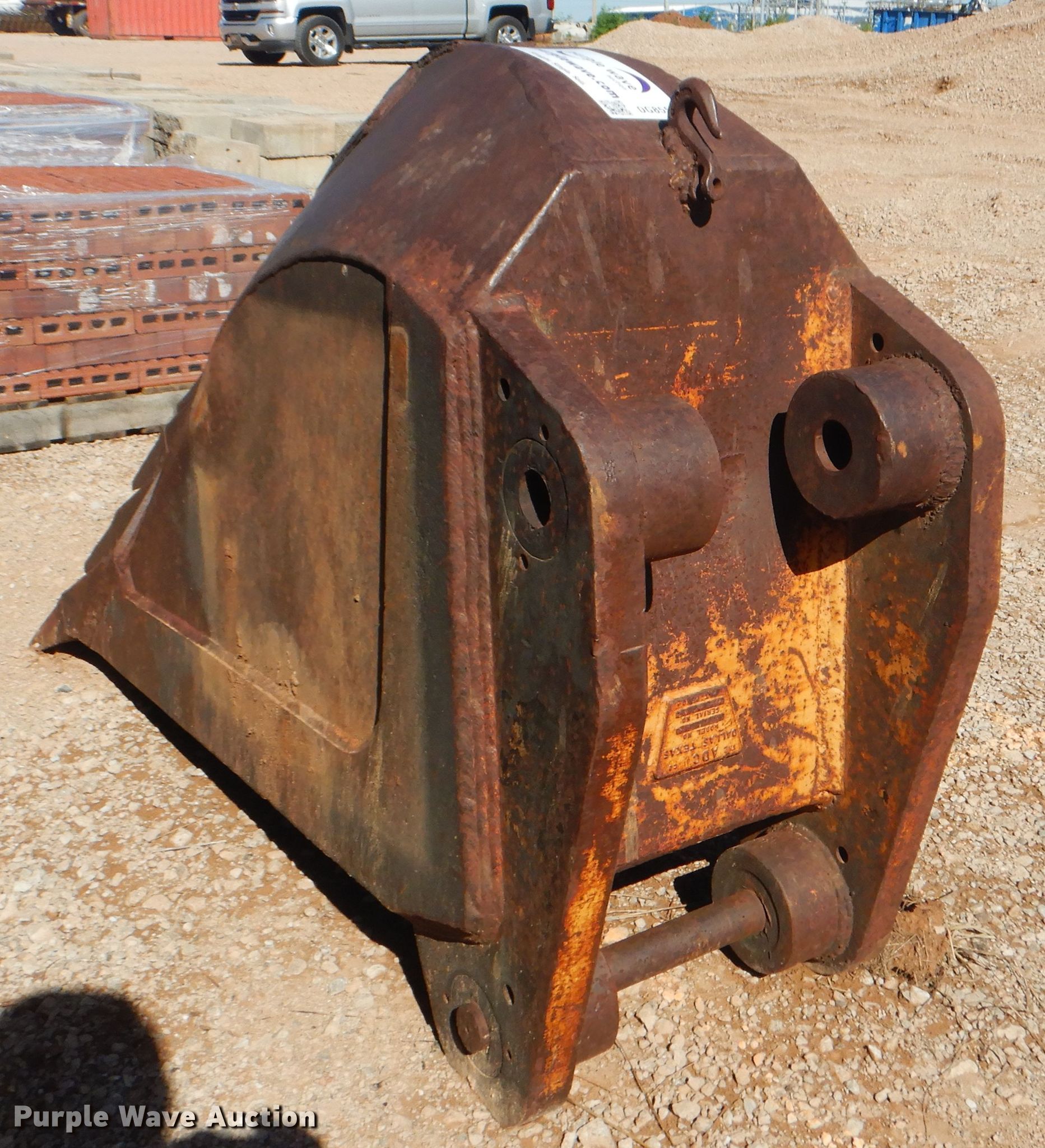 Purple Wave is selling a used Excavator Attach. in Oklahoma. This item is a Hensley Adco 23"W rock bucket with the following: 7" teeth, Approximately 18" center to center pin holes, Approximately 4 3/8" diameter pin holes, 44"L x 36"D I.D.