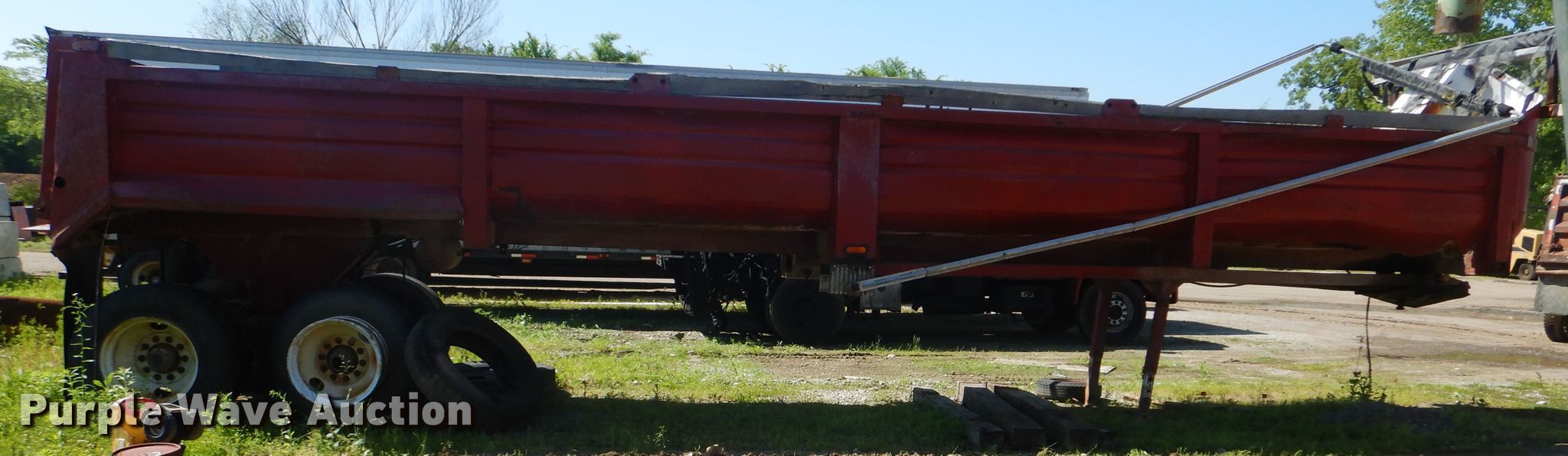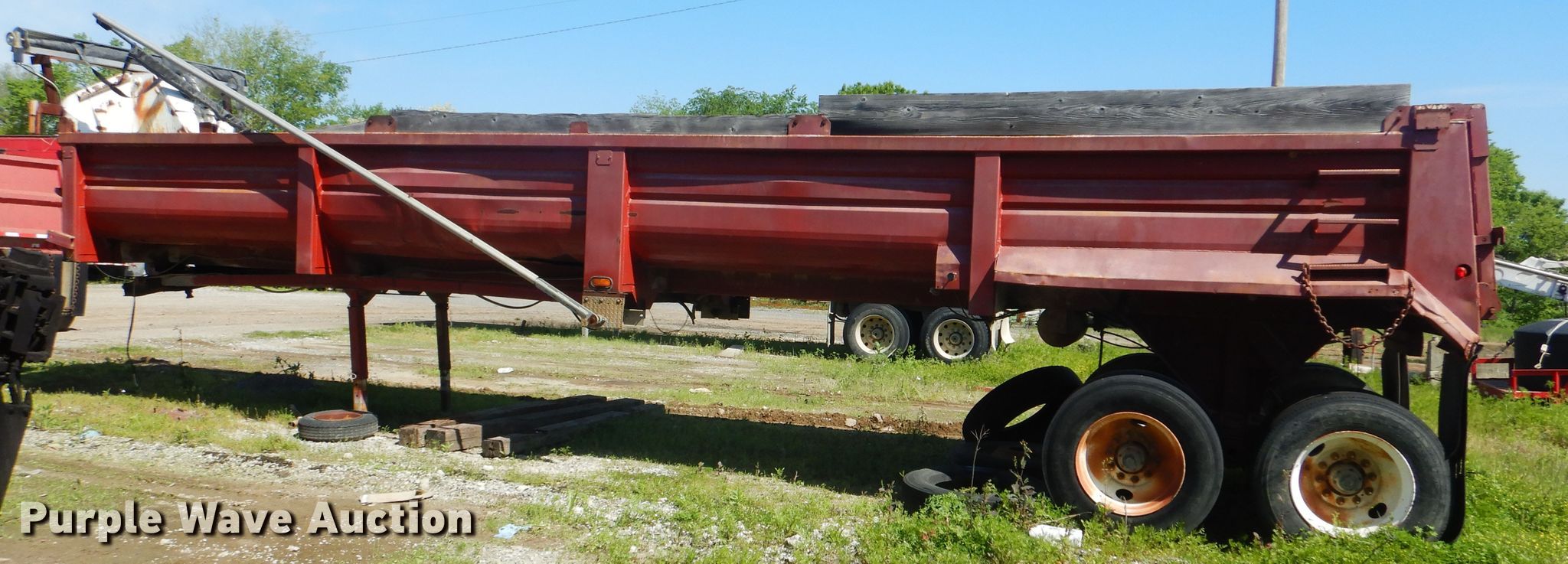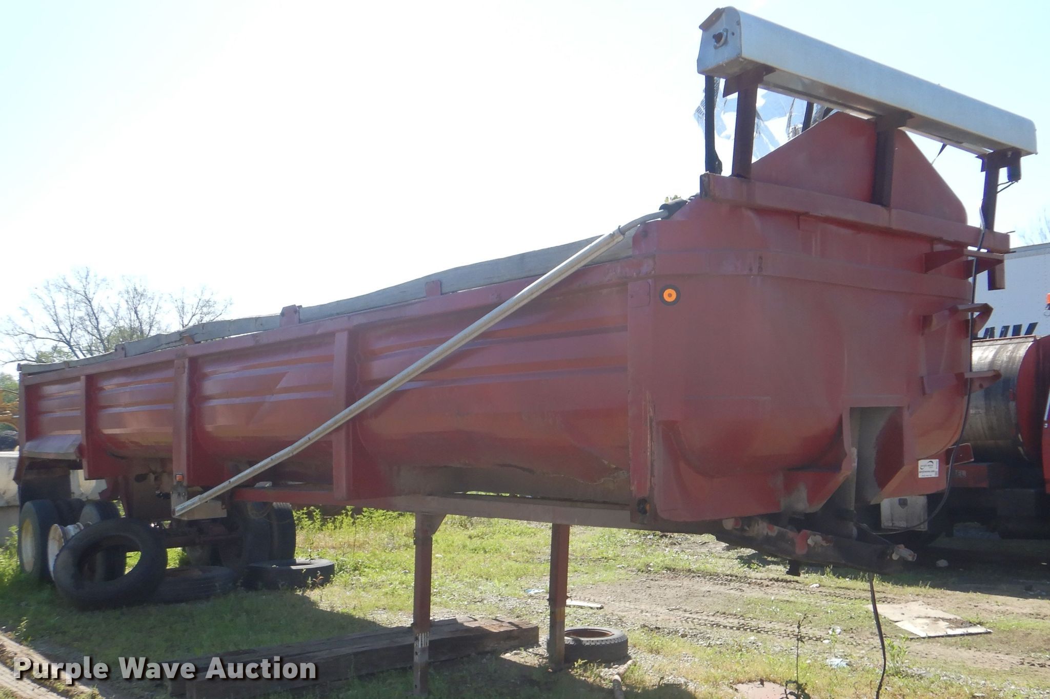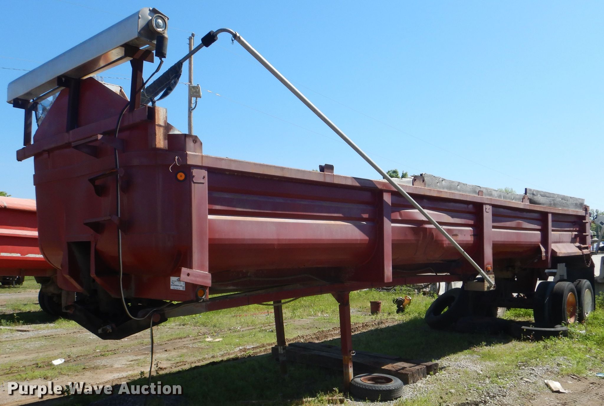 Purple Wave is selling a used End Dump Rock Trailer in Oklahoma. This item is a 1999 Steco end dump trailer with the following: 38'L x 8'W overall, 36" side height, 12" side board height, Single hydraulic cylinder, End gate, Roll tarp, Steel construction, Dual leg landing gear, Spring suspension, Air brakes, Tandem axle, 11R24.5 tires, GVWR 80,000 lbs, GAWR 25,000 lbs, Some side boards missing, Rust holes
