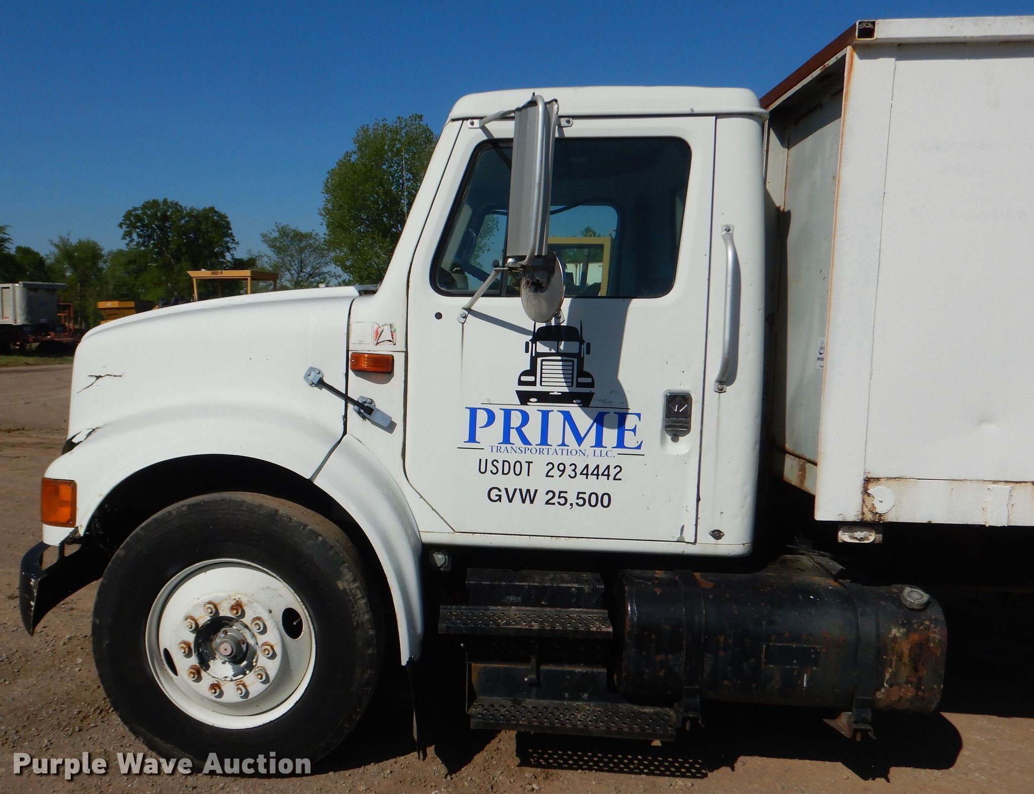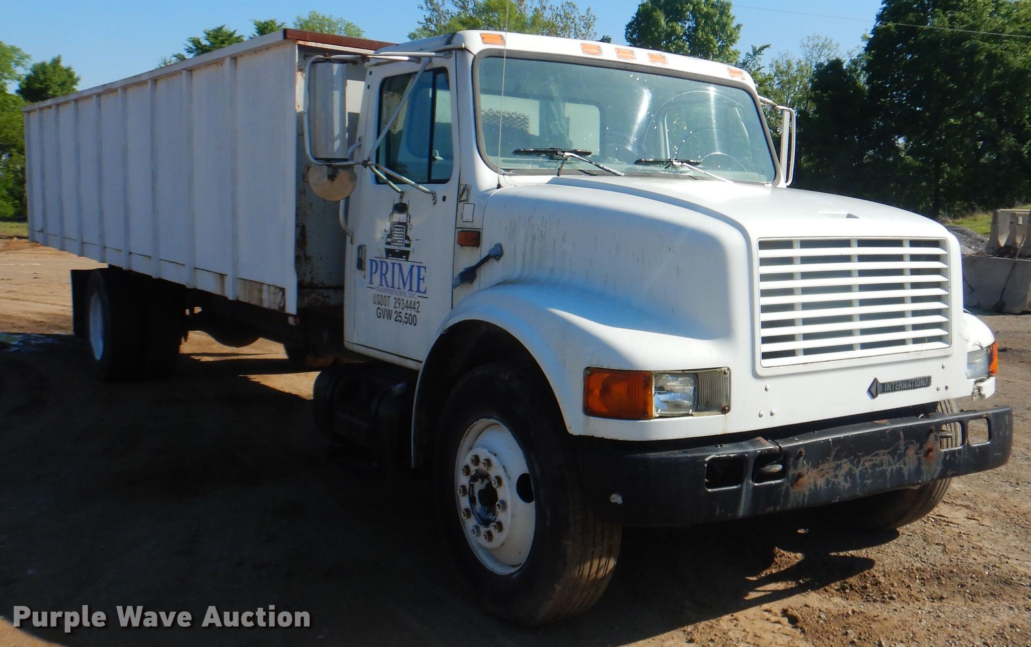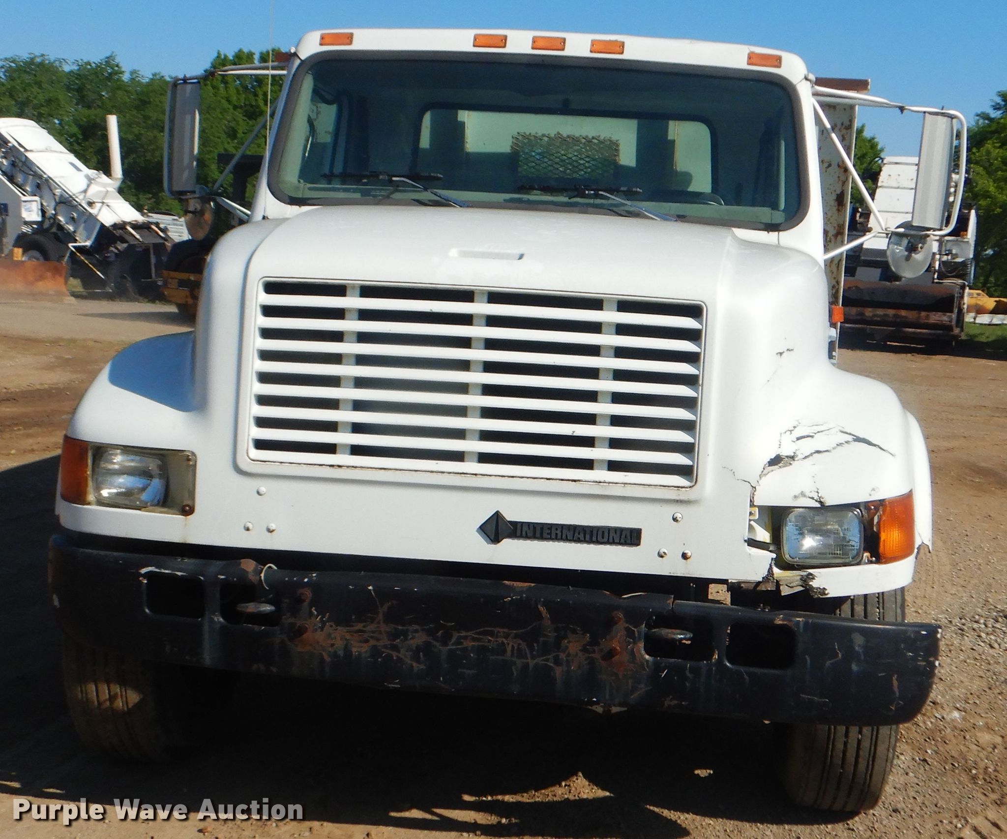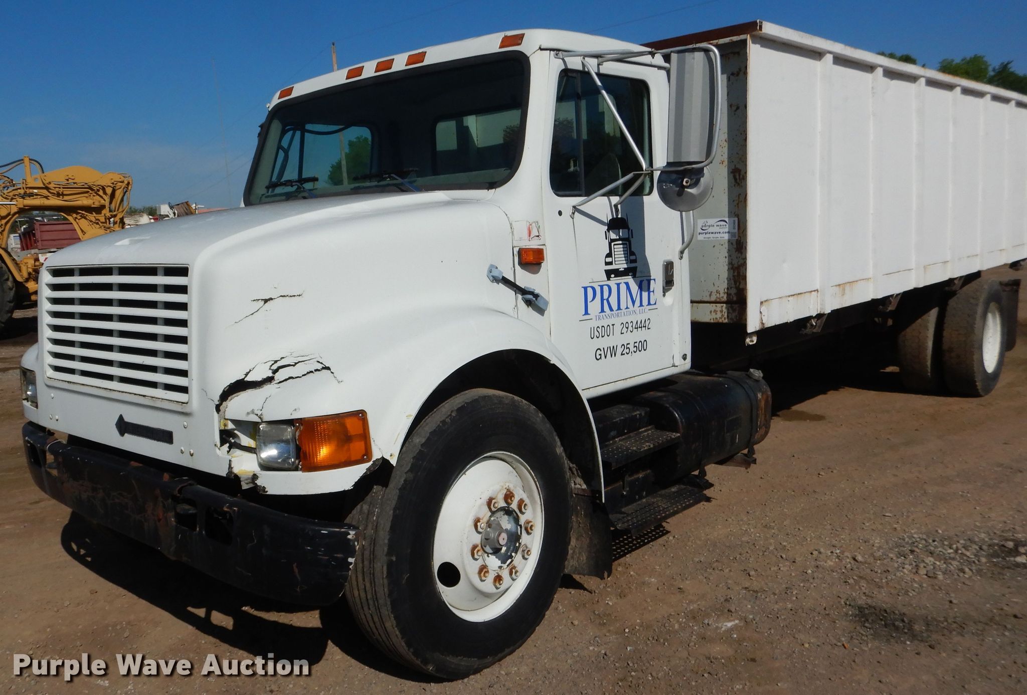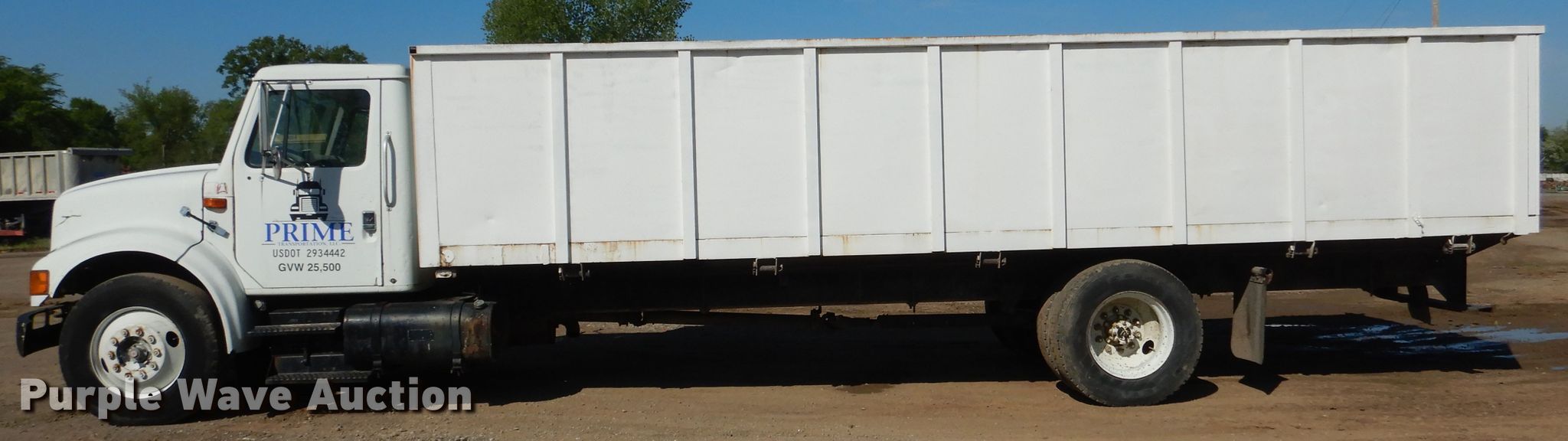Purple Wave is selling a used Flat Bed Truck in Oklahoma. This item is a 1997 International 4700 flatbed truck with the following: 23,794 miles on odometer, International DT466 7.6L L6 diesel engine, Eight speed manual transmission, Single axle, AC and heat, 24.5'L x 8'3"W flatbed, 5' side height, Spring suspension, Hydraulic brakes, 295/75R22.5 tires