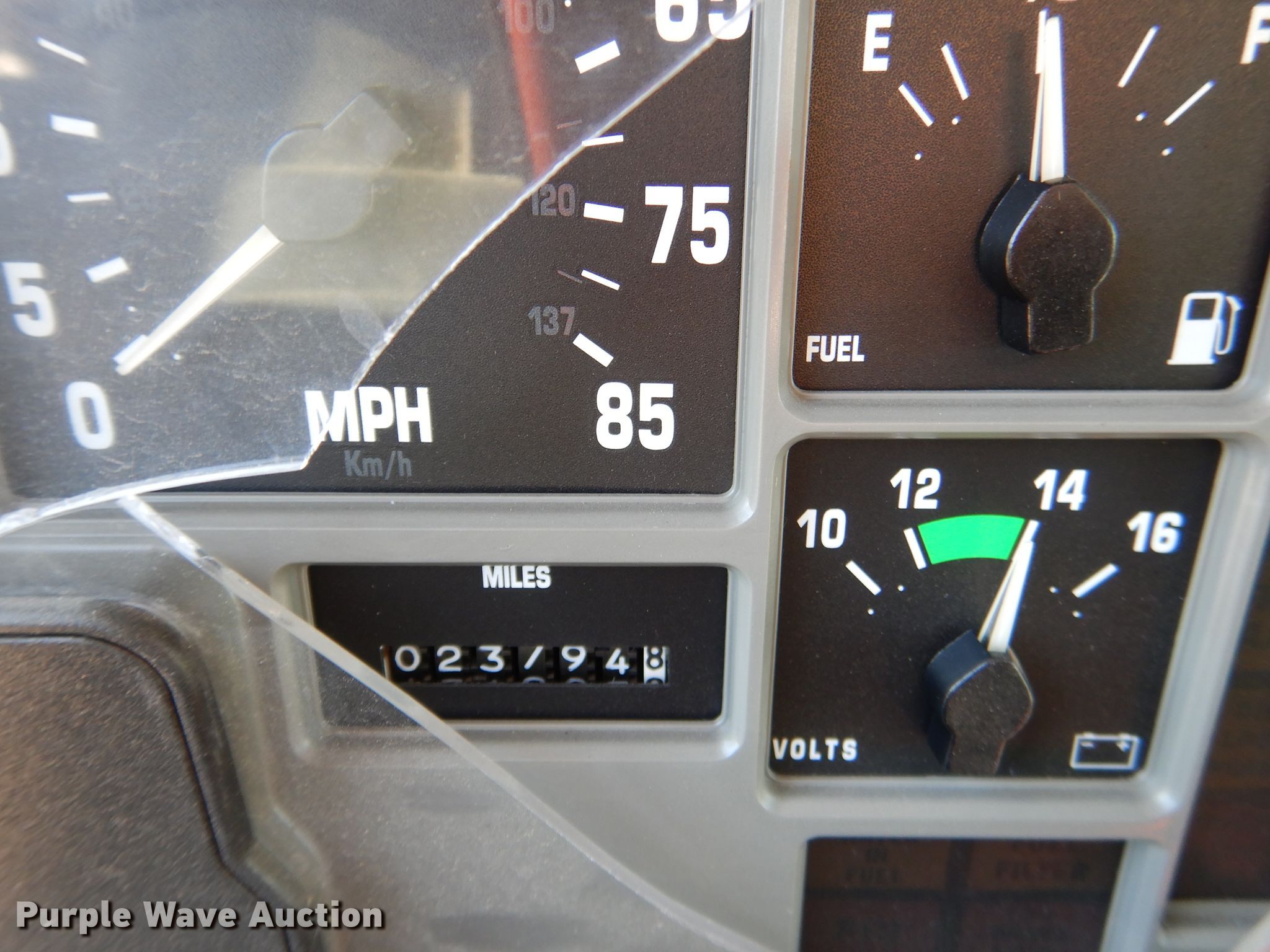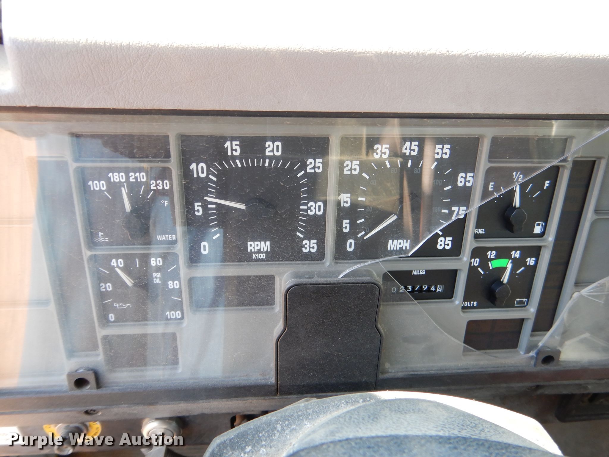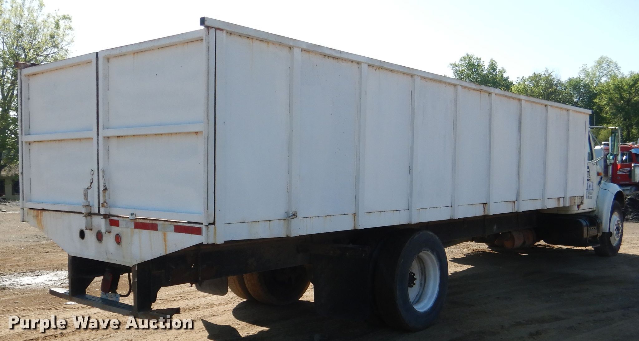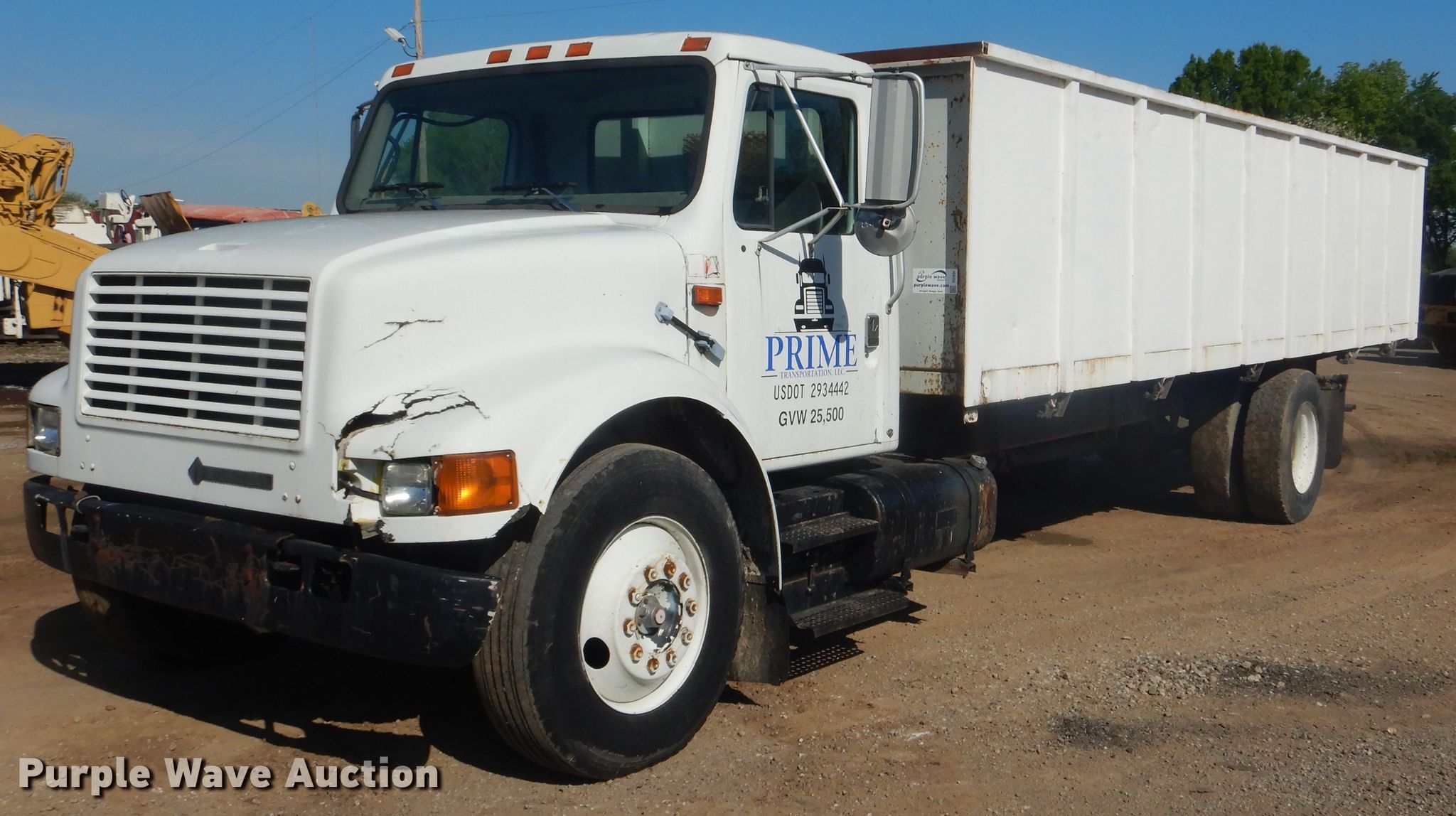 Purple Wave is selling a used Flat Bed Truck in Oklahoma. This item is a 1997 International 4700 flatbed truck with the following: 23,794 miles on odometer, International DT466 7.6L L6 diesel engine, Eight speed manual transmission, Single axle, AC and heat, 24.5'L x 8'3"W flatbed, 5' side height, Spring suspension, Hydraulic brakes, 295/75R22.5 tires