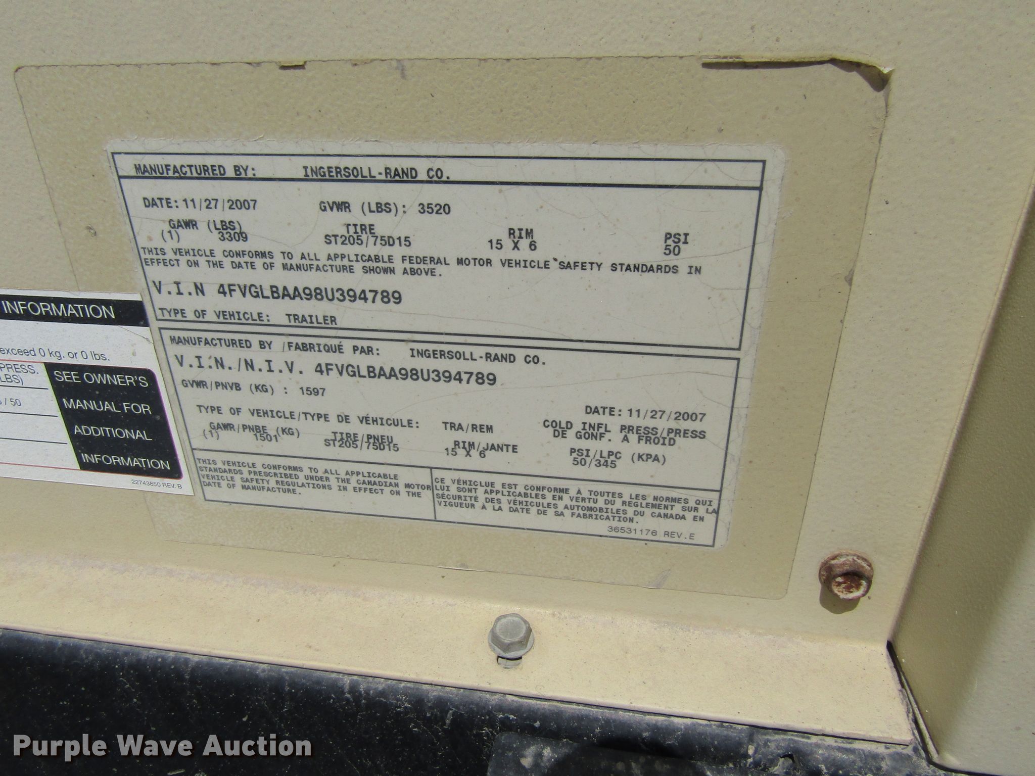 Purple Wave is selling a used Generator Set in Iowa. This item is a 2008 Ingersoll Rand G40 generator with the following: 18,527 hours on meter, Ingersoll Rand 4IRS2N four cylinder diesel engine, 36 kVA, 29 kW, Backup start, Electric start, Fuel tank, 2007 trailer, 12'L x 5'W, 205/75R15 tires, GVWR 3,520 lbs, Serial 394789UKRB50
