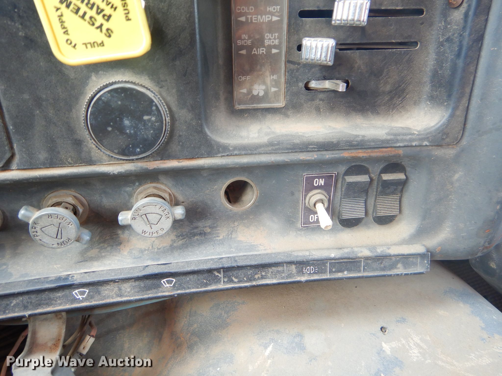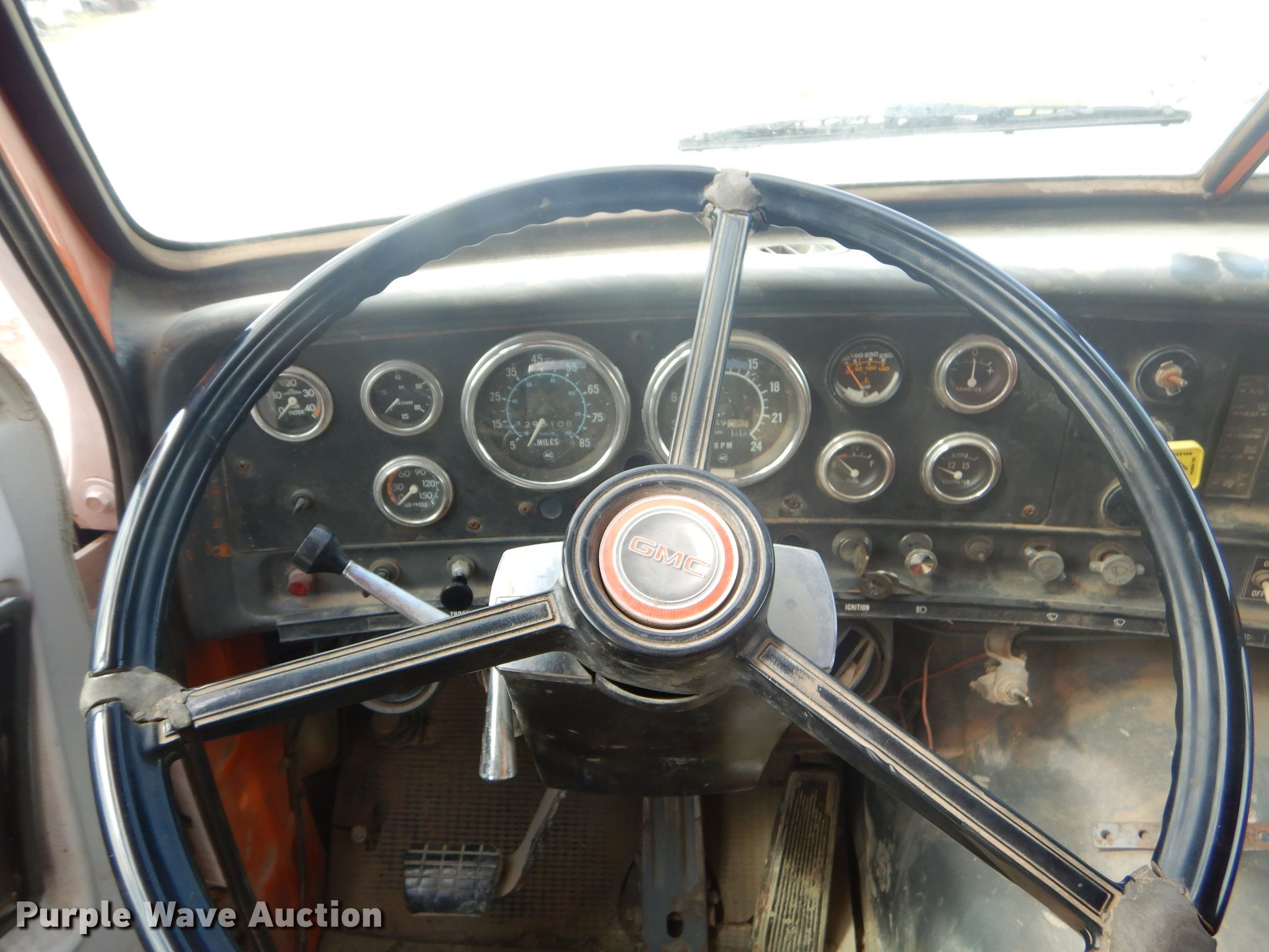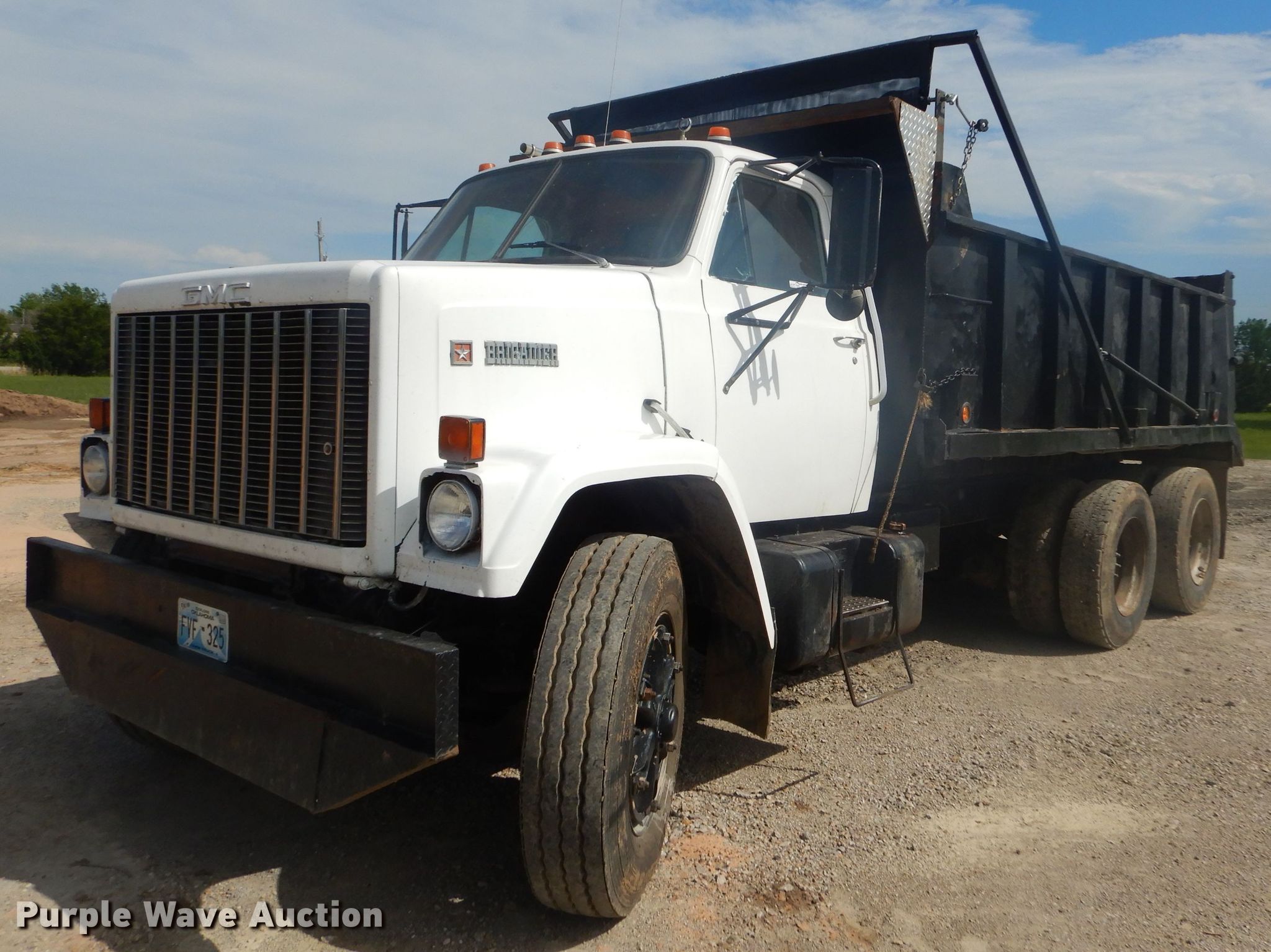 Purple Wave is selling a used Construction Dump Truck in Oklahoma. This item is a 1985 GMC Brigadier dump truck with the following: 293,108 miles on odometer, 399 hours on meter, Detroit Diesel 7.0L six cylinder diesel engine, Eaton Fuller six speed manual transmission, Tandem axle, AC and heat, PTO, 15'L x 96"W steel dump bed, 36" side height, Single ram hoist, Manual operated end gate, Roll tarp, Camelback suspension, Air brakes, 11R22.5 front tires, 275/80R22.5 rear tires, GVWR 52,000 lbs