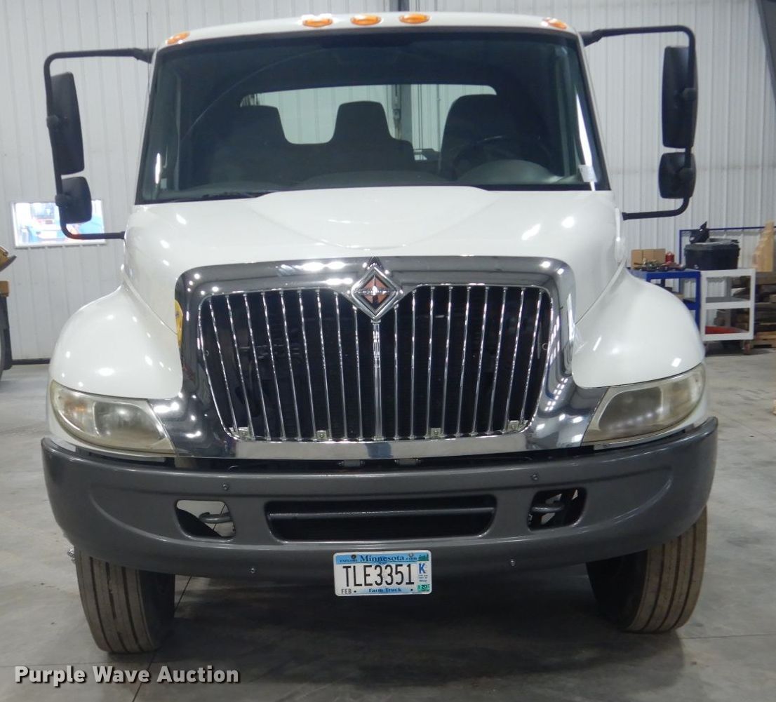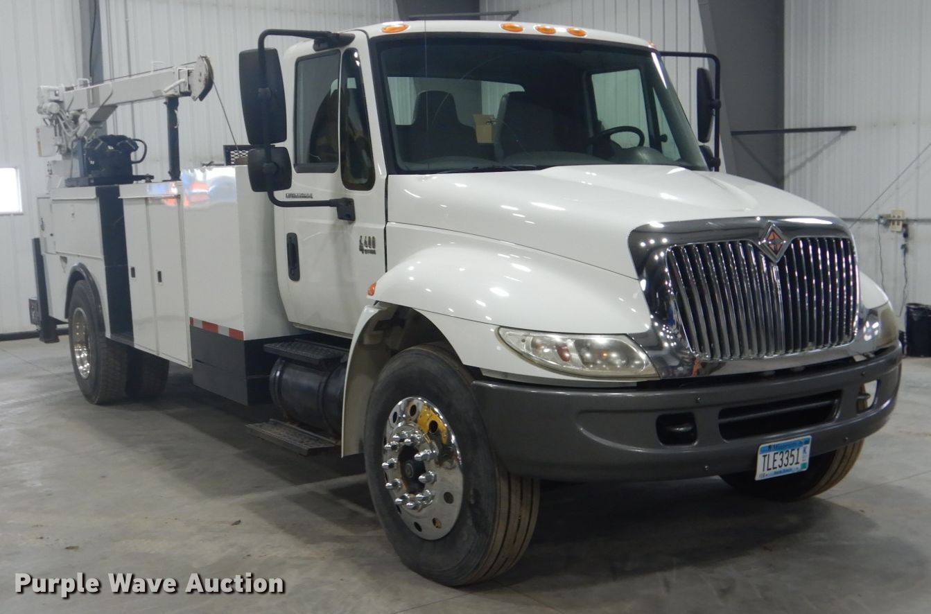 Purple Wave is selling a used Service Truck in Minnesota. This item is a 2003 International 4400 service truck with crane with the following: 251,891 miles on odometer, 10,395 hours on meter, International DT466 7.6L L6 diesel engine, Six speed manual transmission, Single axle, AC And heat, Heated mirrors, PTO, Altec utility bed, 13'4"L, Air compressor, Auxiliary fuel tank, 550 gallon capacity, Nozzles, Pump, Crane model 6000, 18' boom length, 6,000 lbs maximum lift capacity, Spring suspension, Hydraulic brakes, 11R22.5 tires, GVWR 29,000 lbs