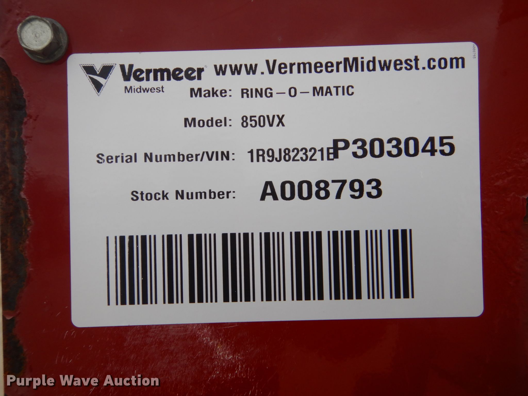 2014 Ring-o-matic 850 vacuum excavator. 1,021 hours on meter, Caterpillar 2.2L four cylinder diesel engine, 800 gallon spoils tank Hydraulic dump, 6" diameter valve, 4" diameter hose, (2) 250 gallon poly tanks, Six gallon per minute capacity at 3,500 psi, Single leg landing gear Torsion suspension, Electric brakes, Tandem axle, 235/75R17.5 tires. Illinois title. Seller is an Illinois licensed motor vehicle dealer. The buyer may be required to pay sales tax and/or registration fees to the dealer prior to taking possession. Title will be assigned and distributed by the dealer. Please contact the seller for distribution questions. 1R9J82321EP303045. Vermeer Midwest. 2801 Beverly Dr. Aurora, IL 60502