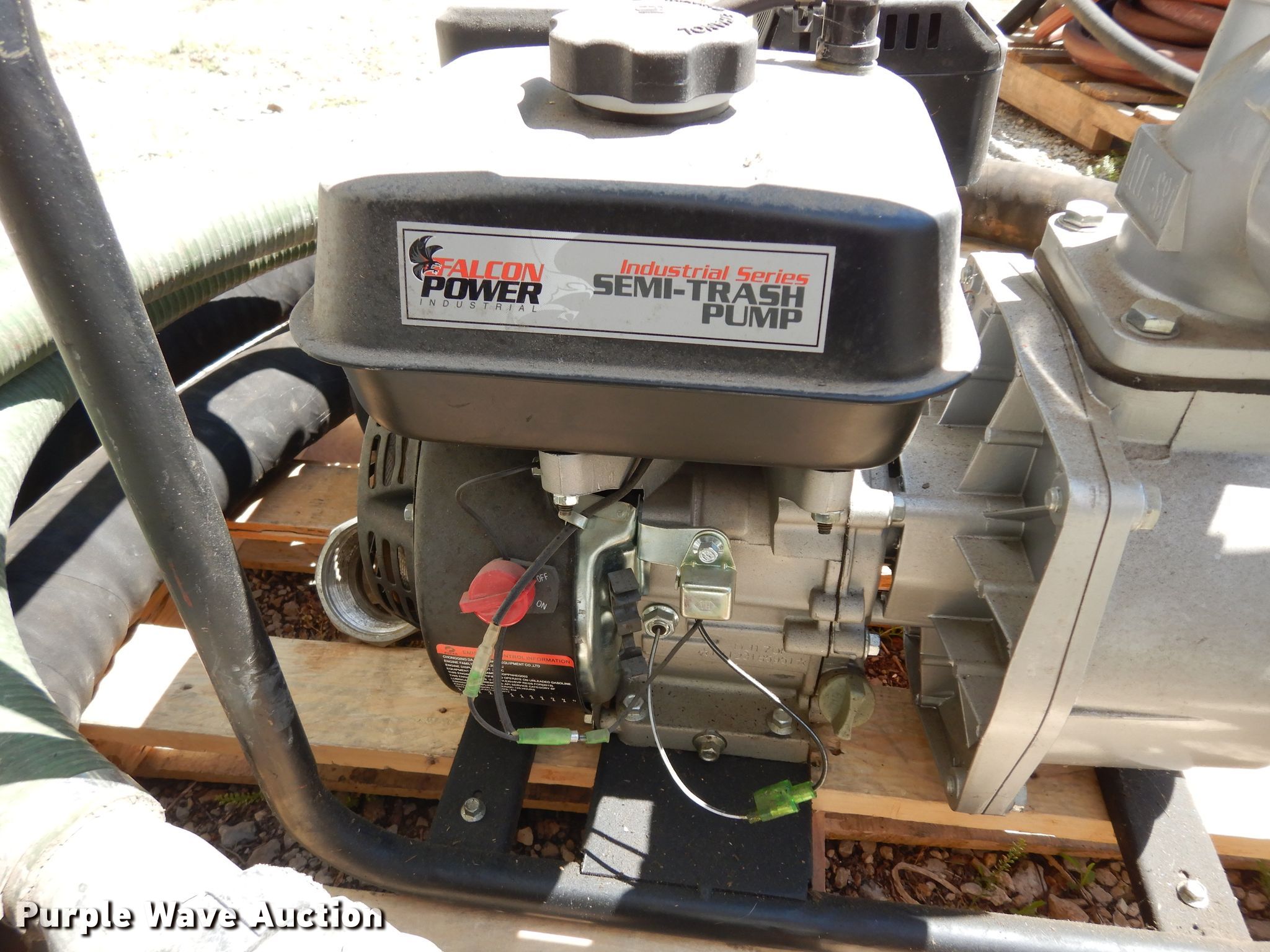 Purple Wave is selling a used Pump in Kansas. This item is a Falcon semi trash pump with the following: Gas engine, Unused, (2) hoses, 2.5" diameter with strainer