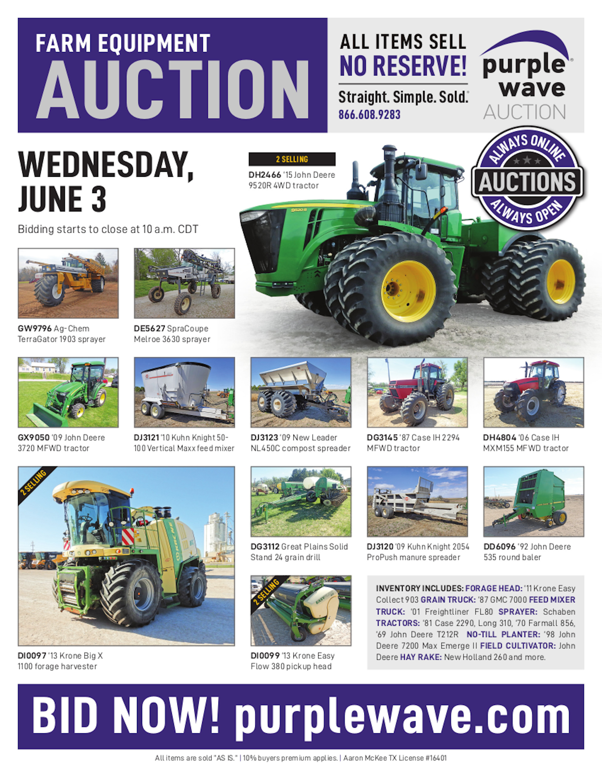 This auction is conducted by Purple Wave, Inc., whose home office is 825 Levee Drive, Manhattan, Kansas. Aaron McKee, Texas auctioneer license # 16401, operates Purple Wave, Inc. Complaints against us may be directed to the Texas Department of Licensing and Regulation, P.O. Box 12157, Austin, Texas 78711, (512) 463-6599. For additional required information, see the attached document.