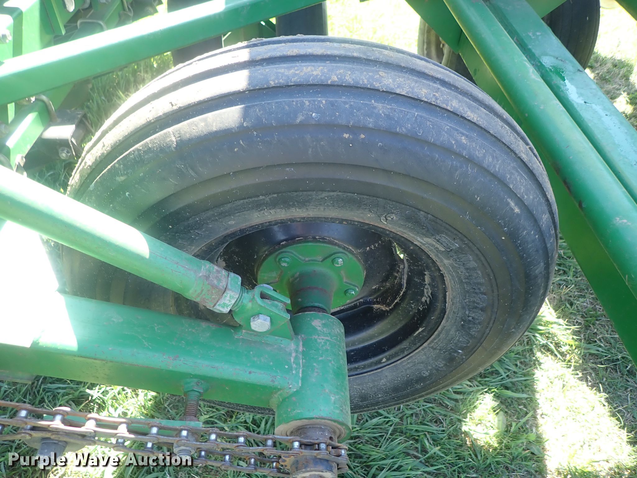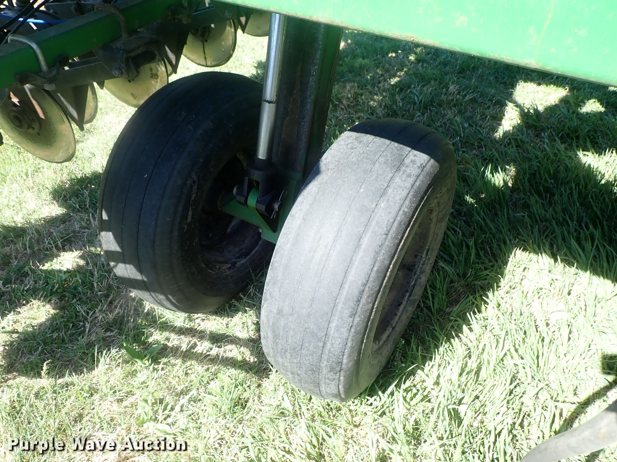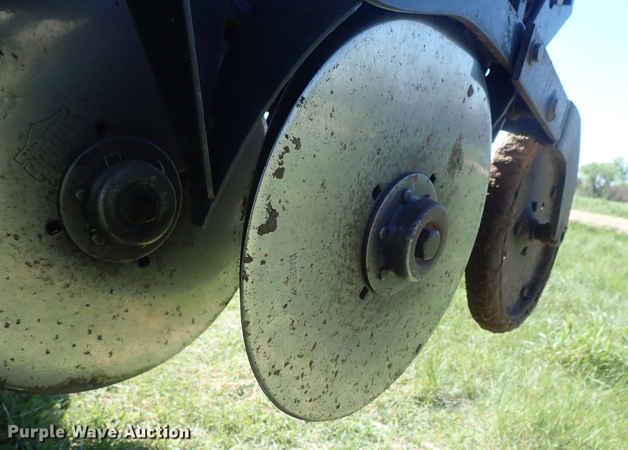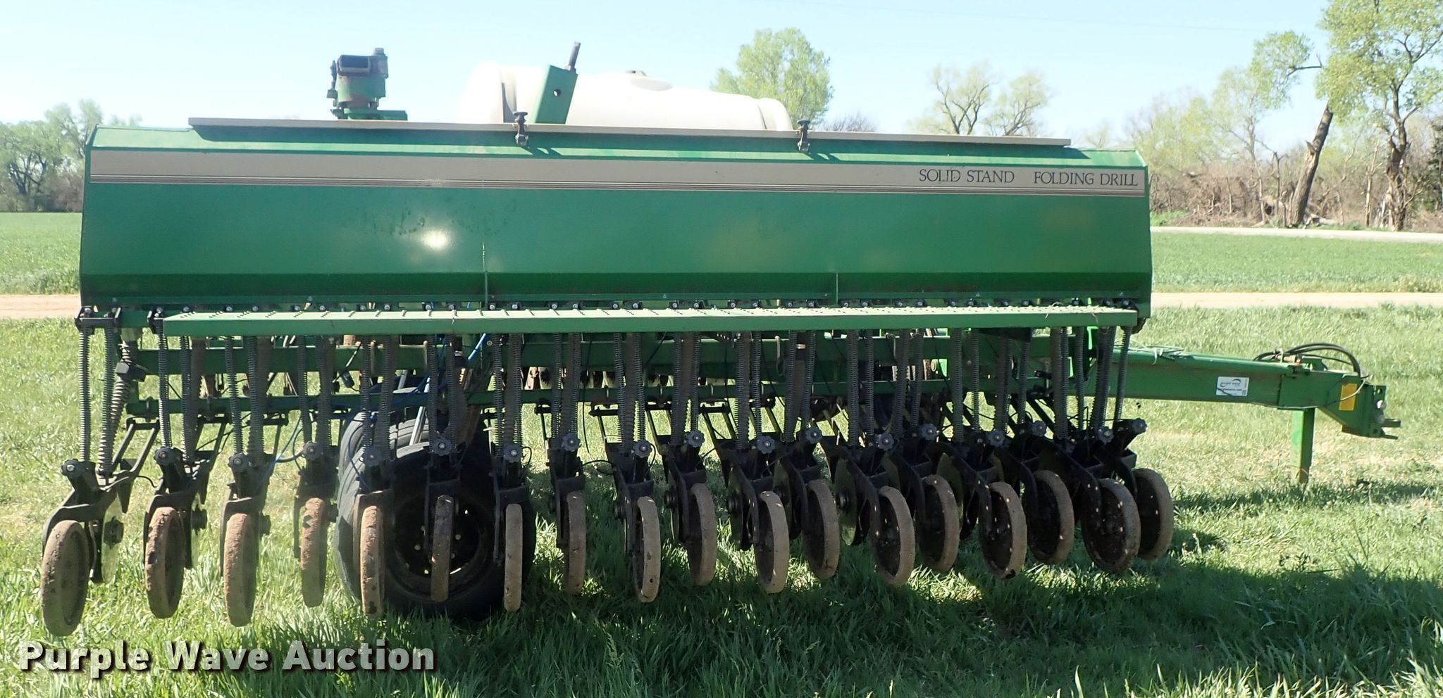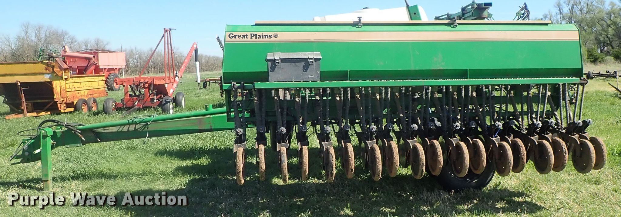 Purple Wave is selling a used Grain Drill or Seeder in Kansas. This item is a Great Plains Solid Stand 24 grain drill with the following: 17,809 acres on meter, 36 row units, 7.5" row spacing, Hydraulic fold, Bulk fill system, Ground meter drive, Spring down pressure, Double disk openers, Single rubber closing system, 200 gallon liquid fertilizer tank, 9.5L-15 transport tires