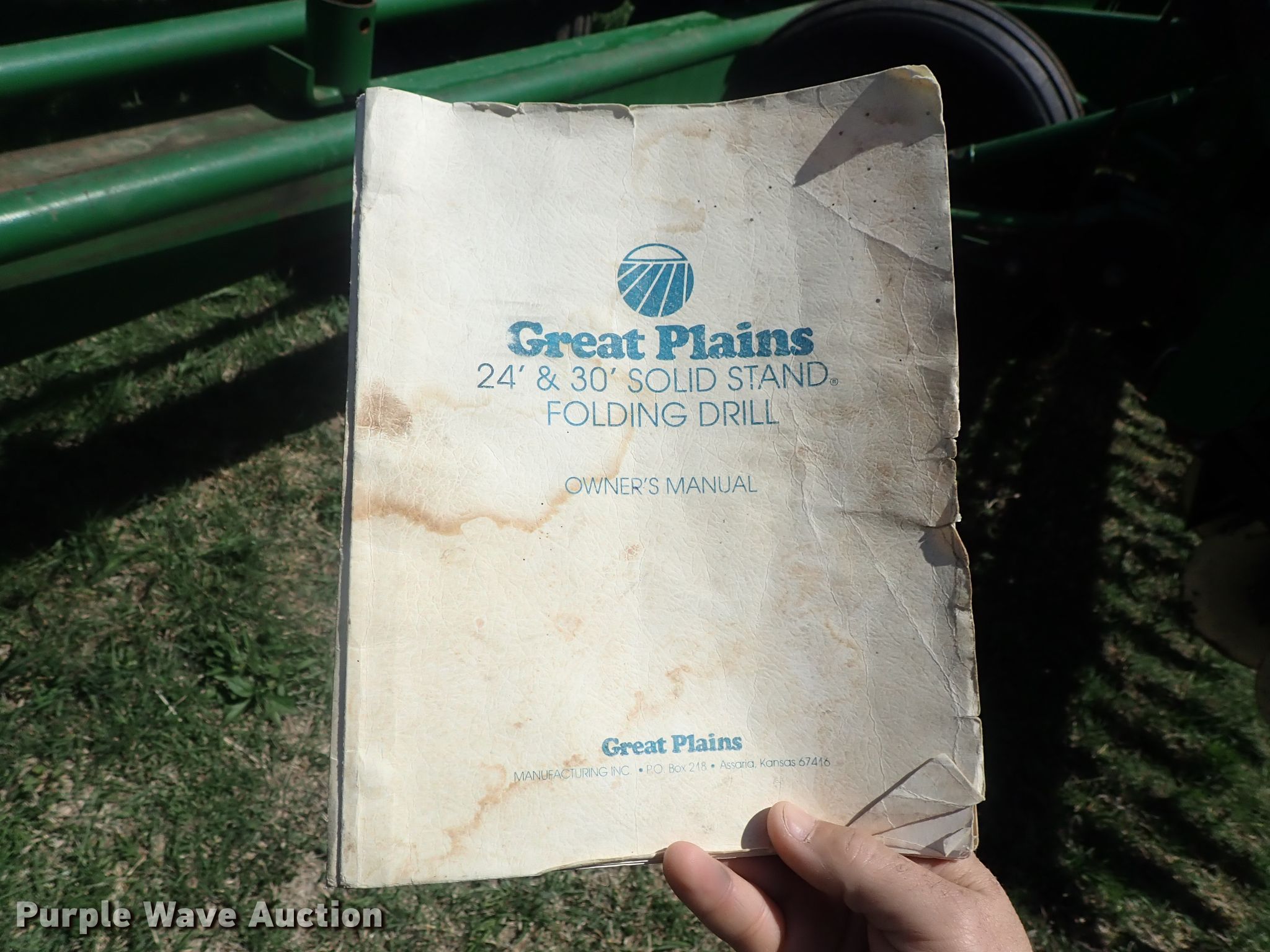Great Plains Solid Stand 24 grain drill. 17,809 acres on meter, 36 row units, 7.5" row spacing, Hydraulic fold, Bulk fill system, Ground meter drive, Spring down pressure, Double disk openers, Single rubber closing system, 200 gallon liquid fertilizer tank, 9.5L-15 transport tires. Inman, KS 67546