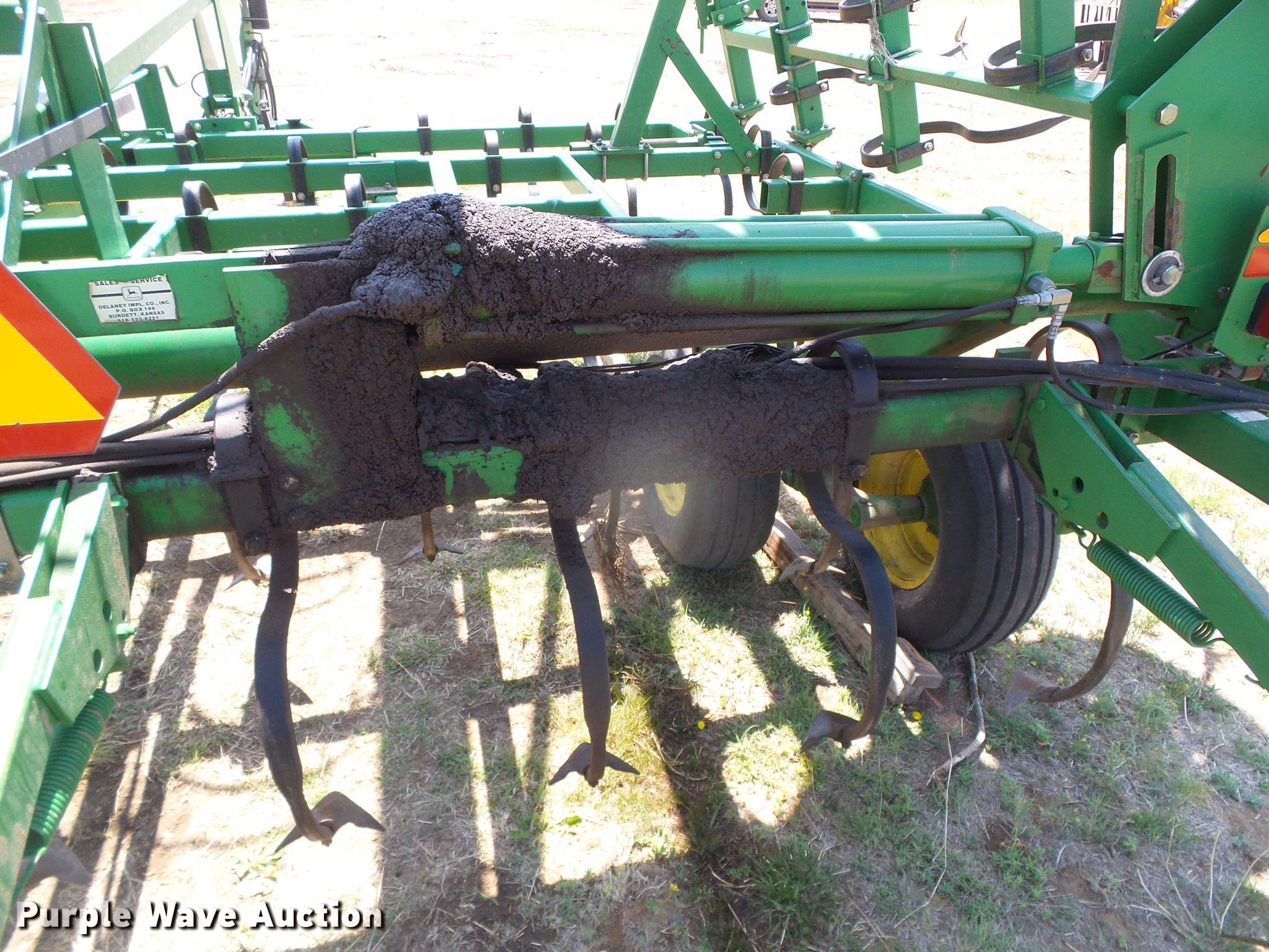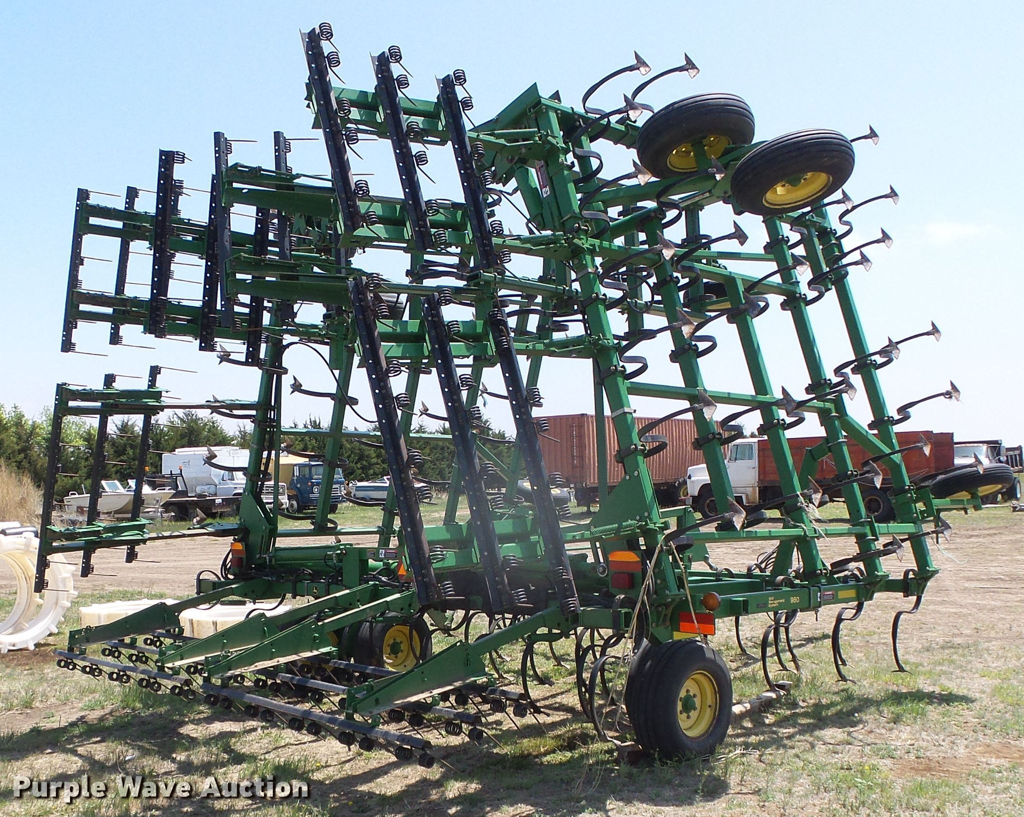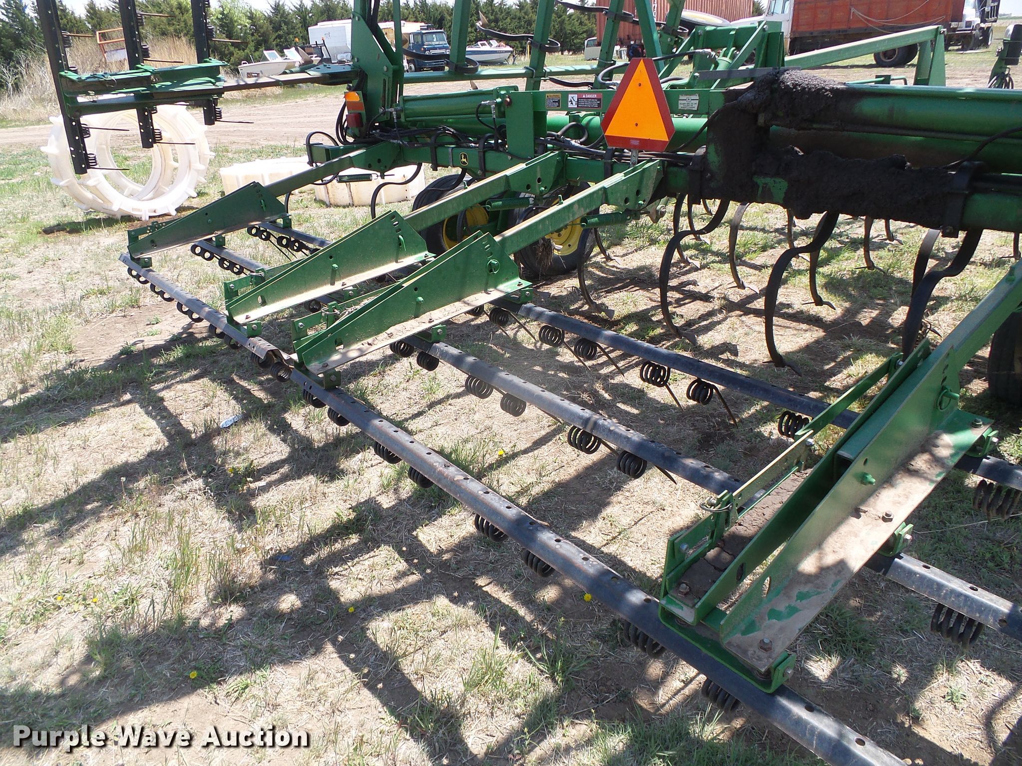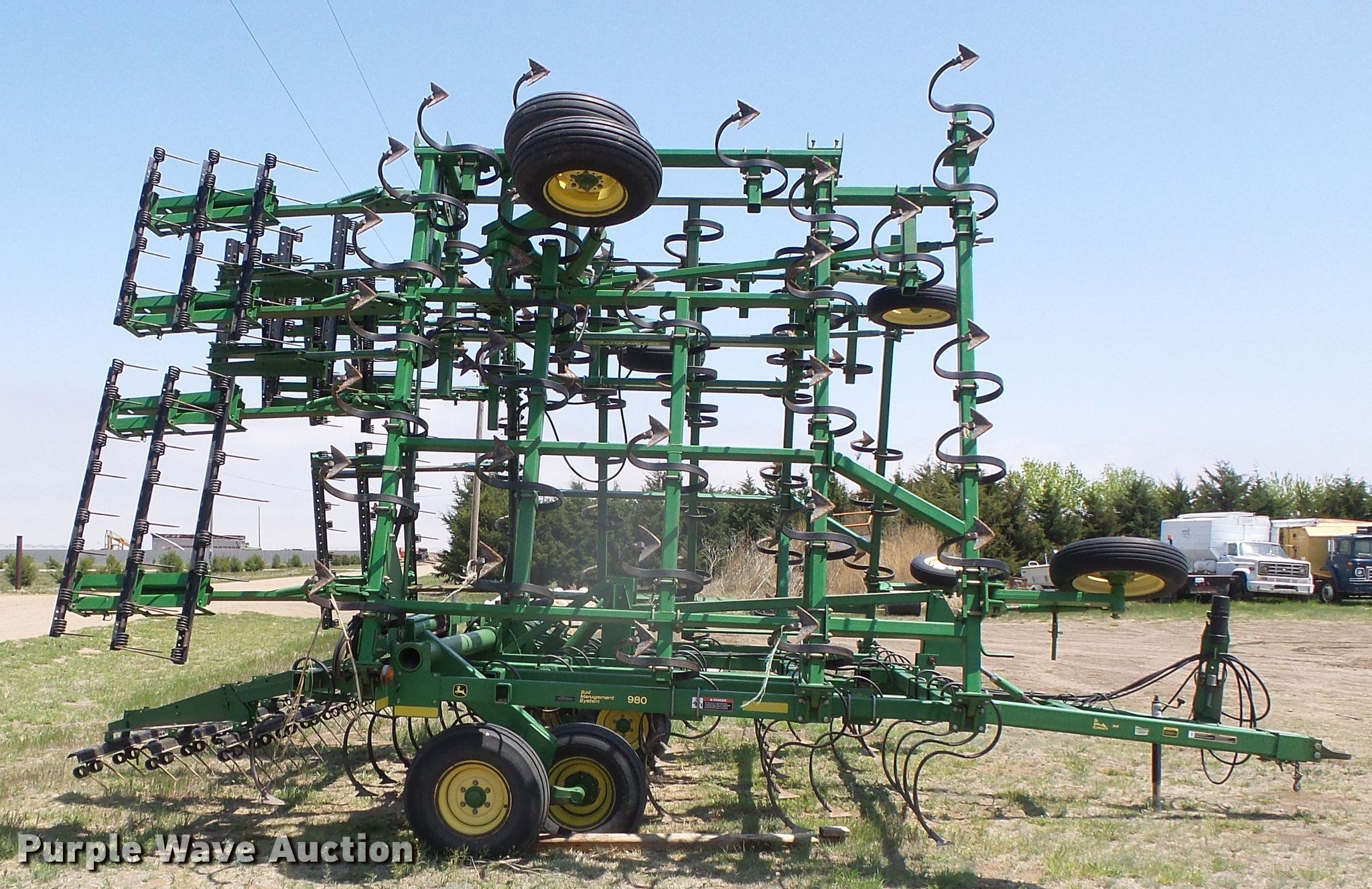Purple Wave is selling a used Field Cultivator or Sweep Plow in Kansas. This item is a John Deere 980 field cultivator with the following: 45'W, 10" spacing, Three bar tine harrow, Manual leveler, Hydraulic lift and fold, 11L-15 tires, Serial N00980X020883