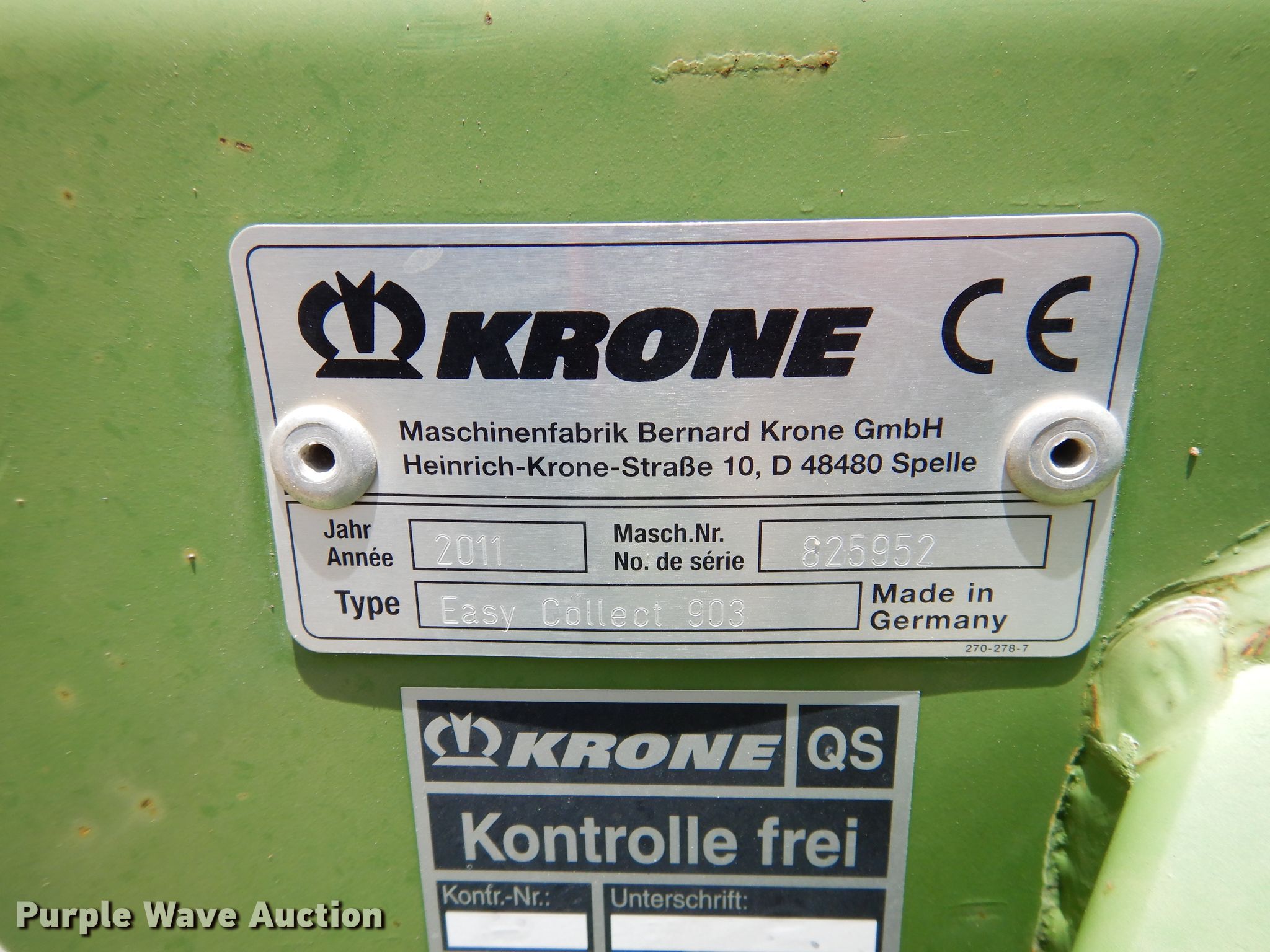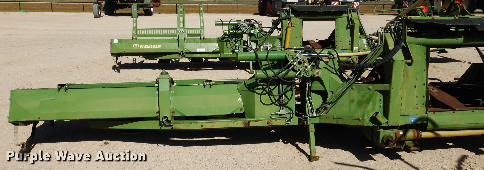 Purple Wave is selling a used Forage Head or Silage Handling in Texas. This item is a 2011 Krone Easy Collect 903 forage head with the following: 30'W, 12 rows, 30" row spacing, Hydraulic fold, Steel skid plates, Single driveline, Serial 825952