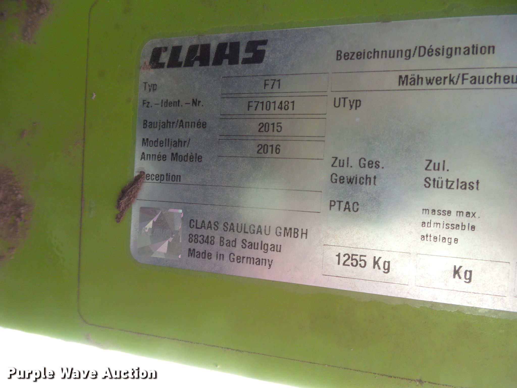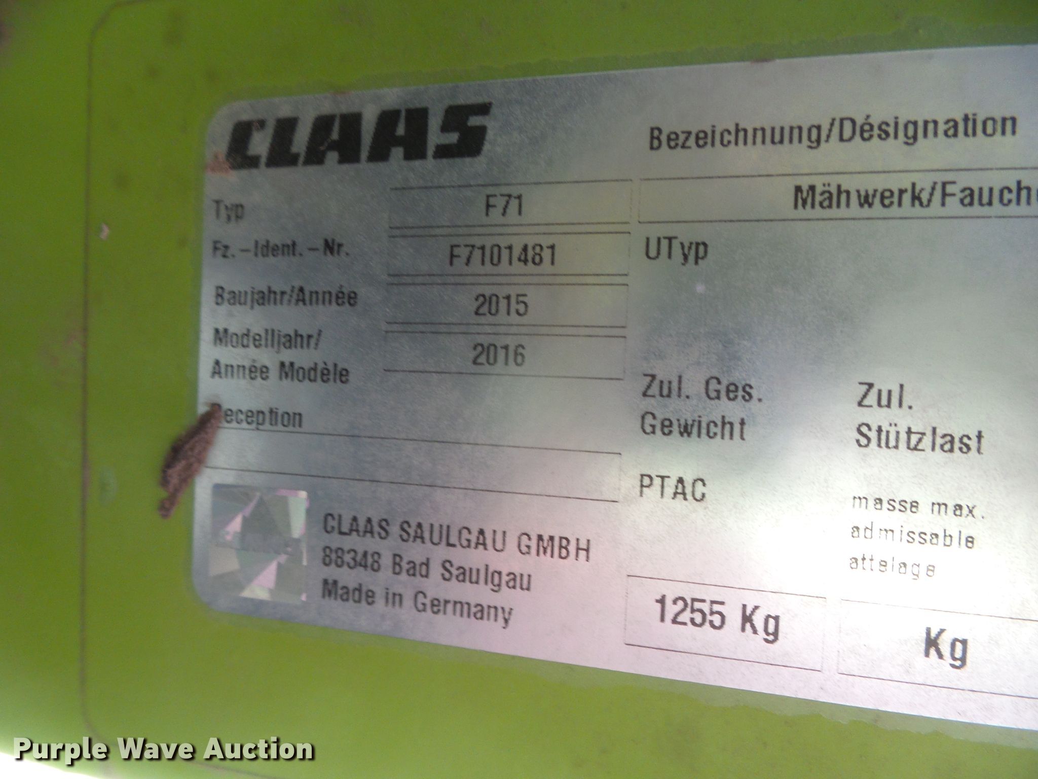 Purple Wave is selling a used Disc or Sickle Mower in Kansas. This item is a Claas Disco 3600FC mower conditioner with the following: Type F71, 13'W, Active float, (2) knive discs, Tine conditioner, 540 PTO, Three point, Unknown operating condition, Unit# F7101481